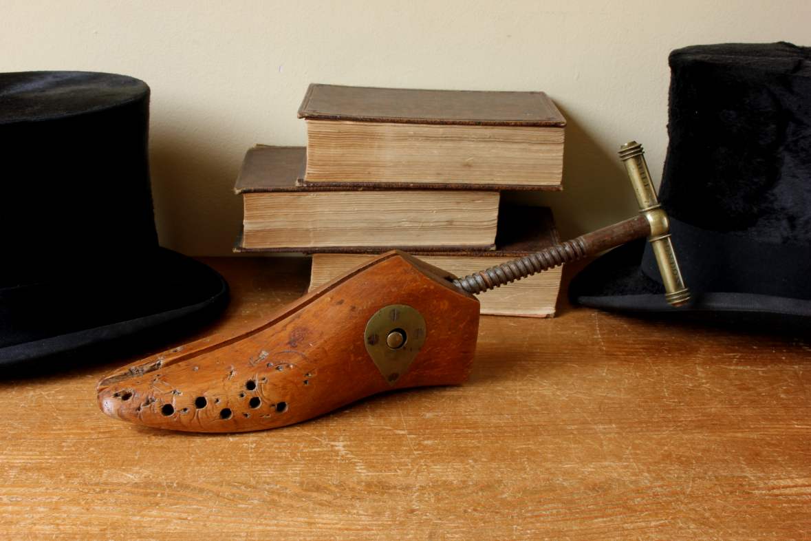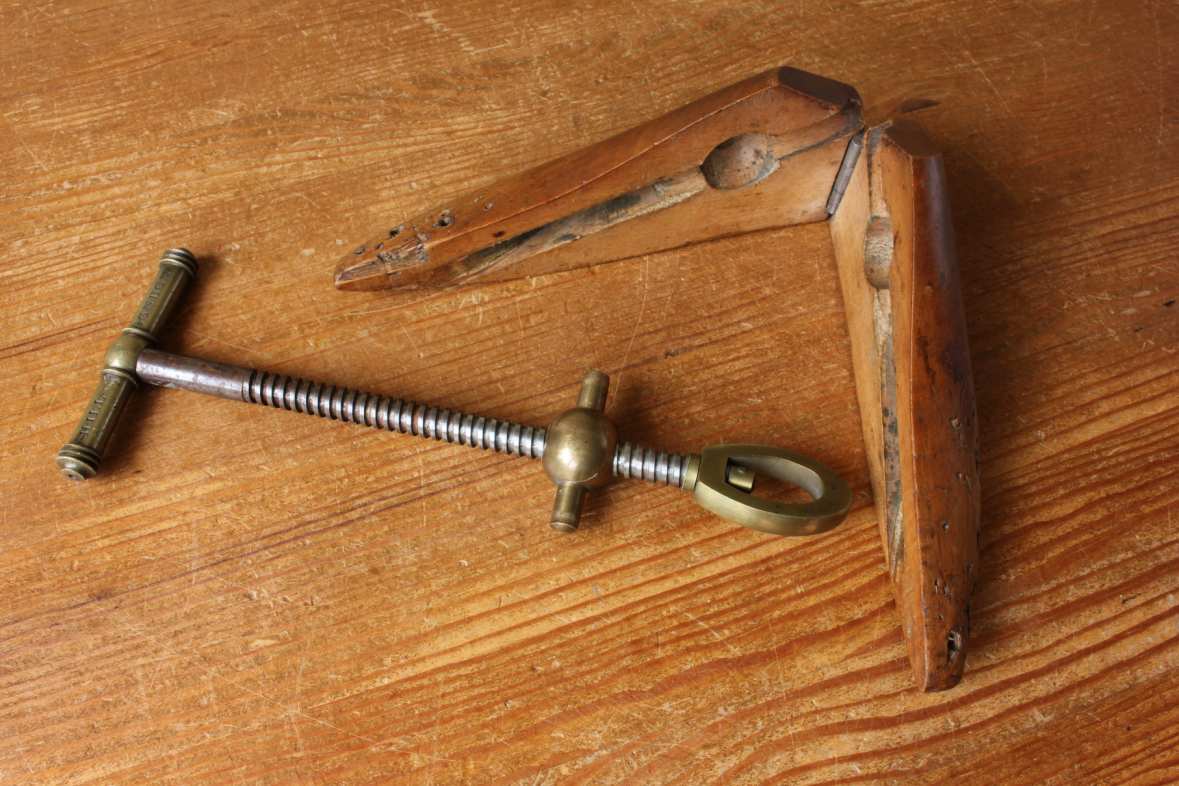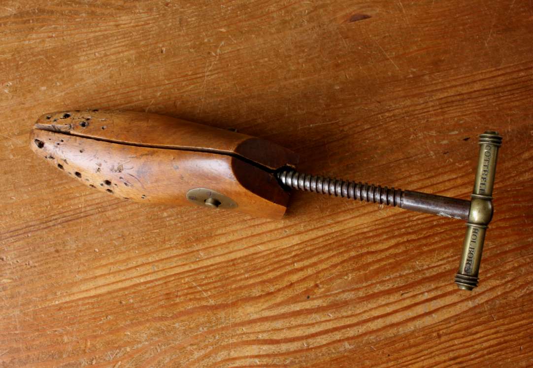 This highly decorative antique wooden shoe stretcher which has a wonderful rich golden patina has 2 parts that are hinged, have brass fittings and a metal screw mechanism with brass handle for tightening and enlarging the wooden last to stretch a shoe.