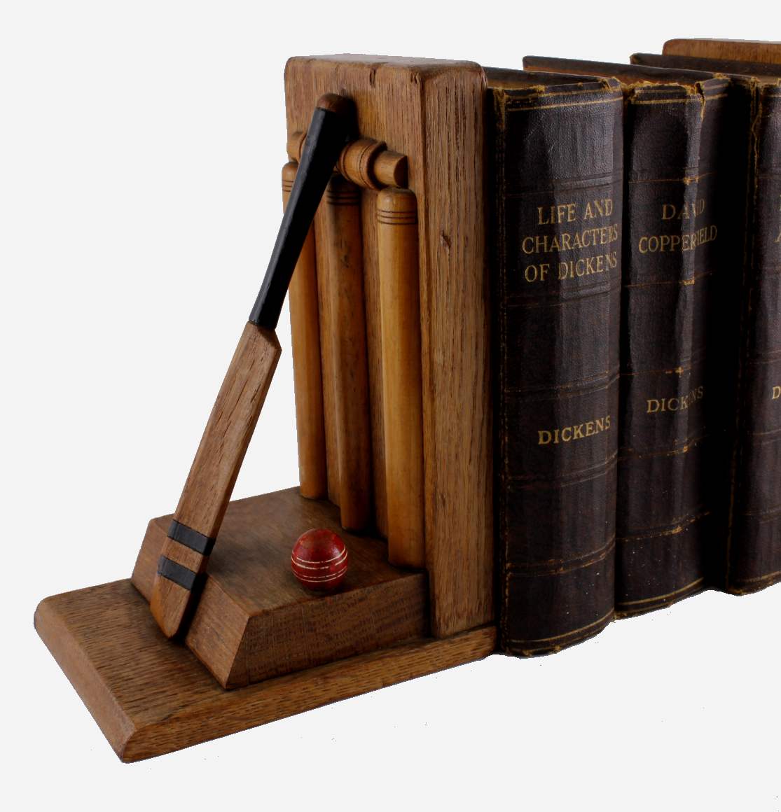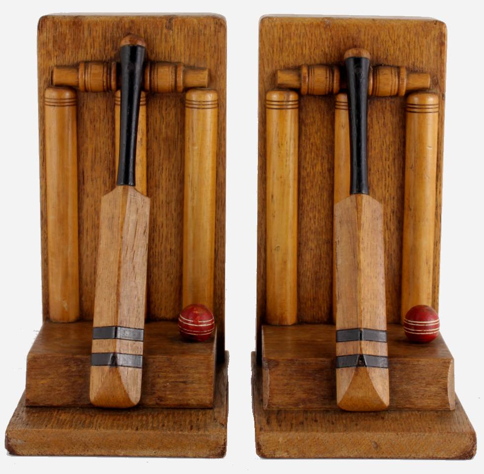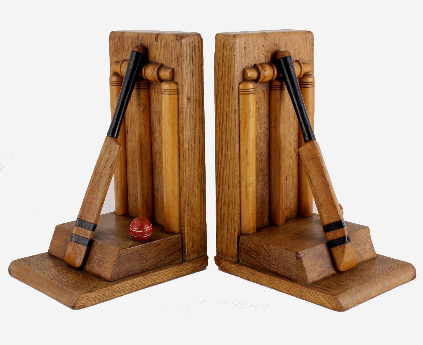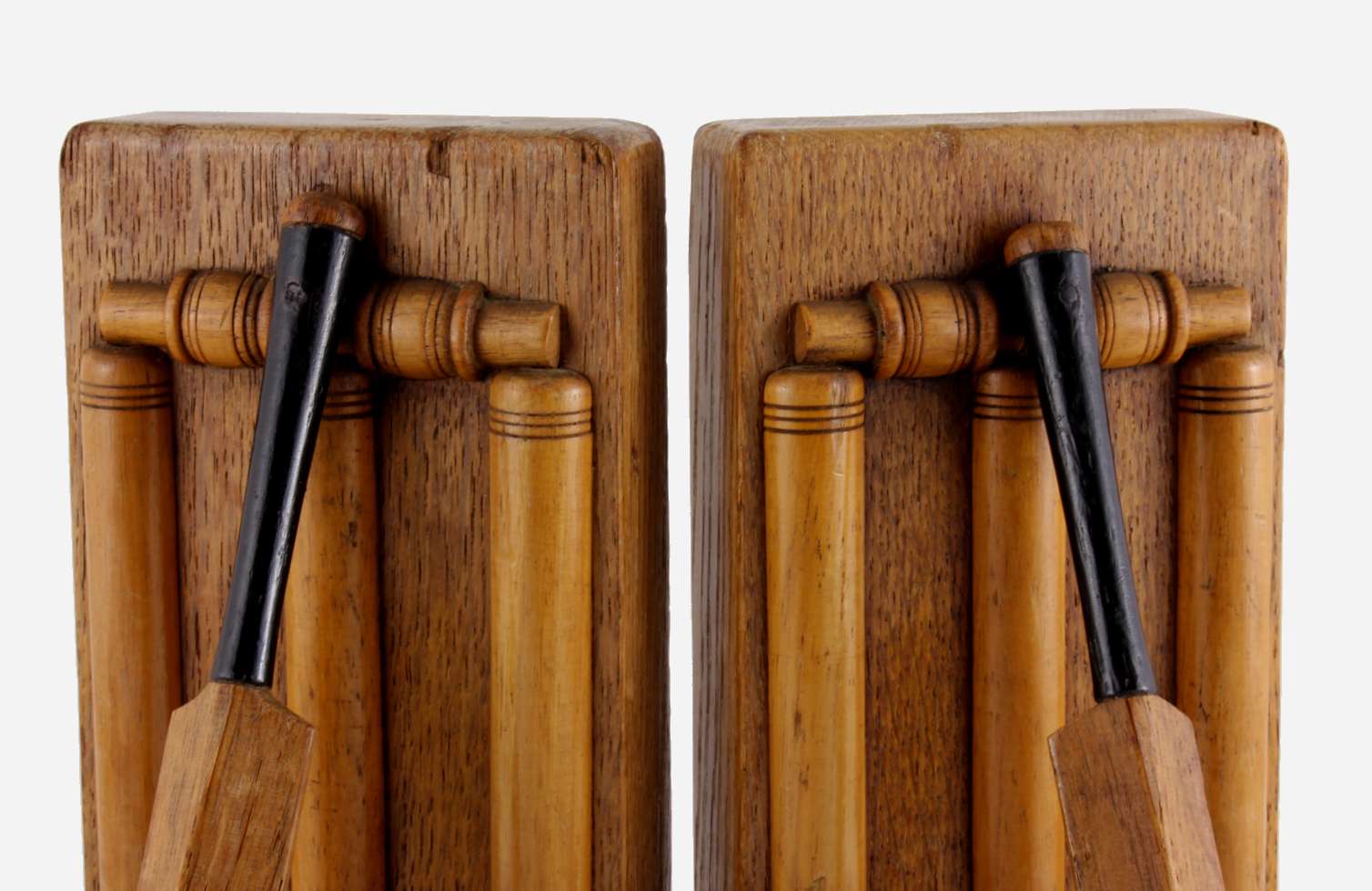 This handsome Art Deco set of oak bookends date from the 1930's and are in the form of cricket stumps with each one having a mini bat and ball. These were handmade by the Thornton-Smith Company in the 1930's and have excellent detail.