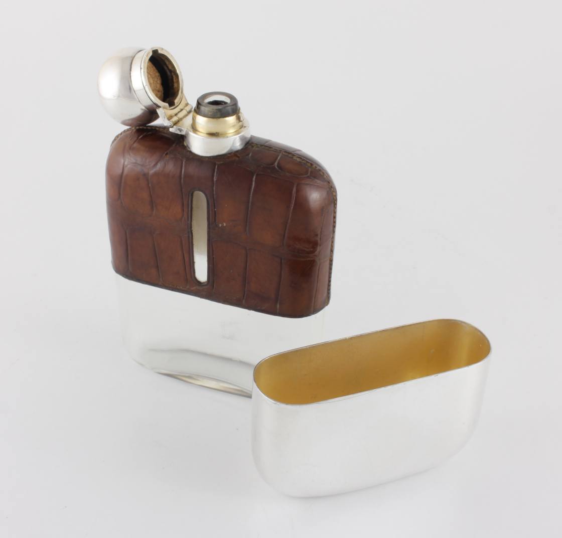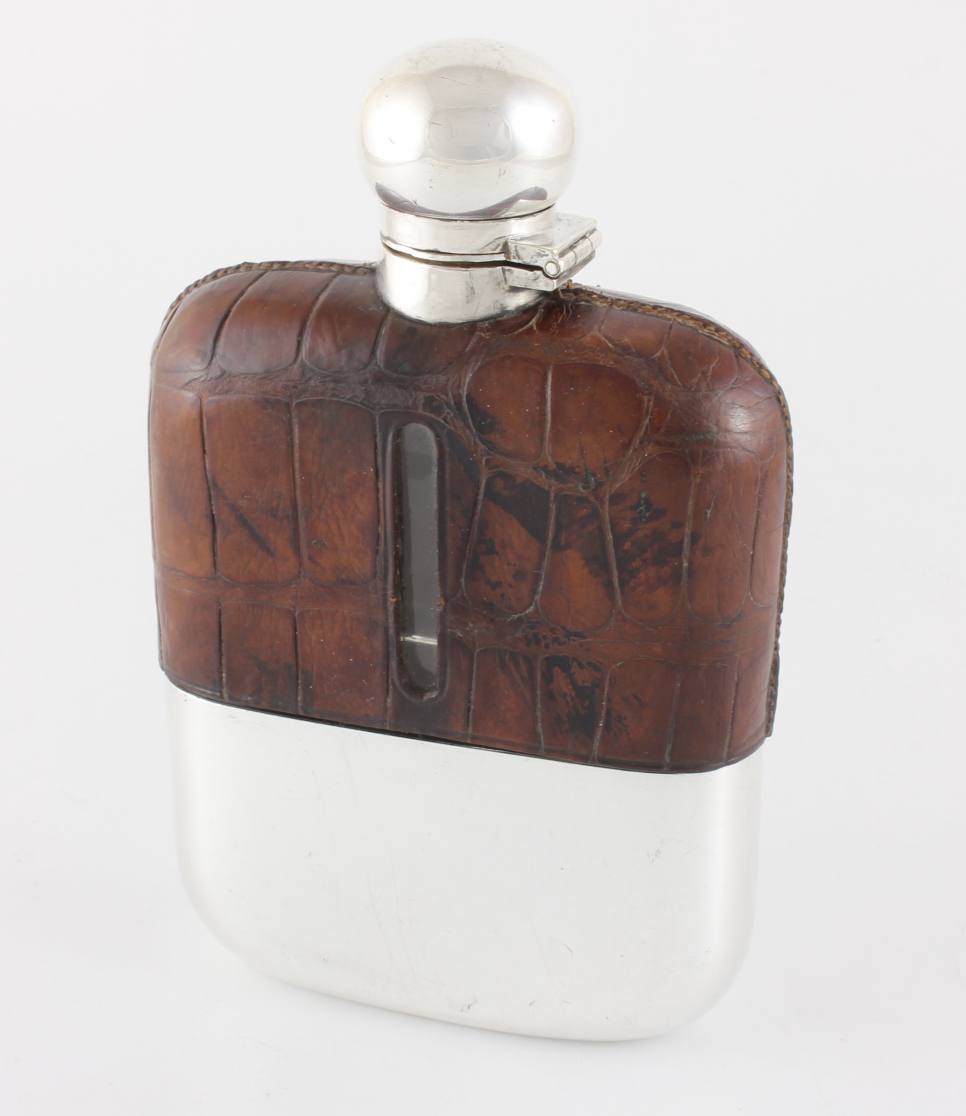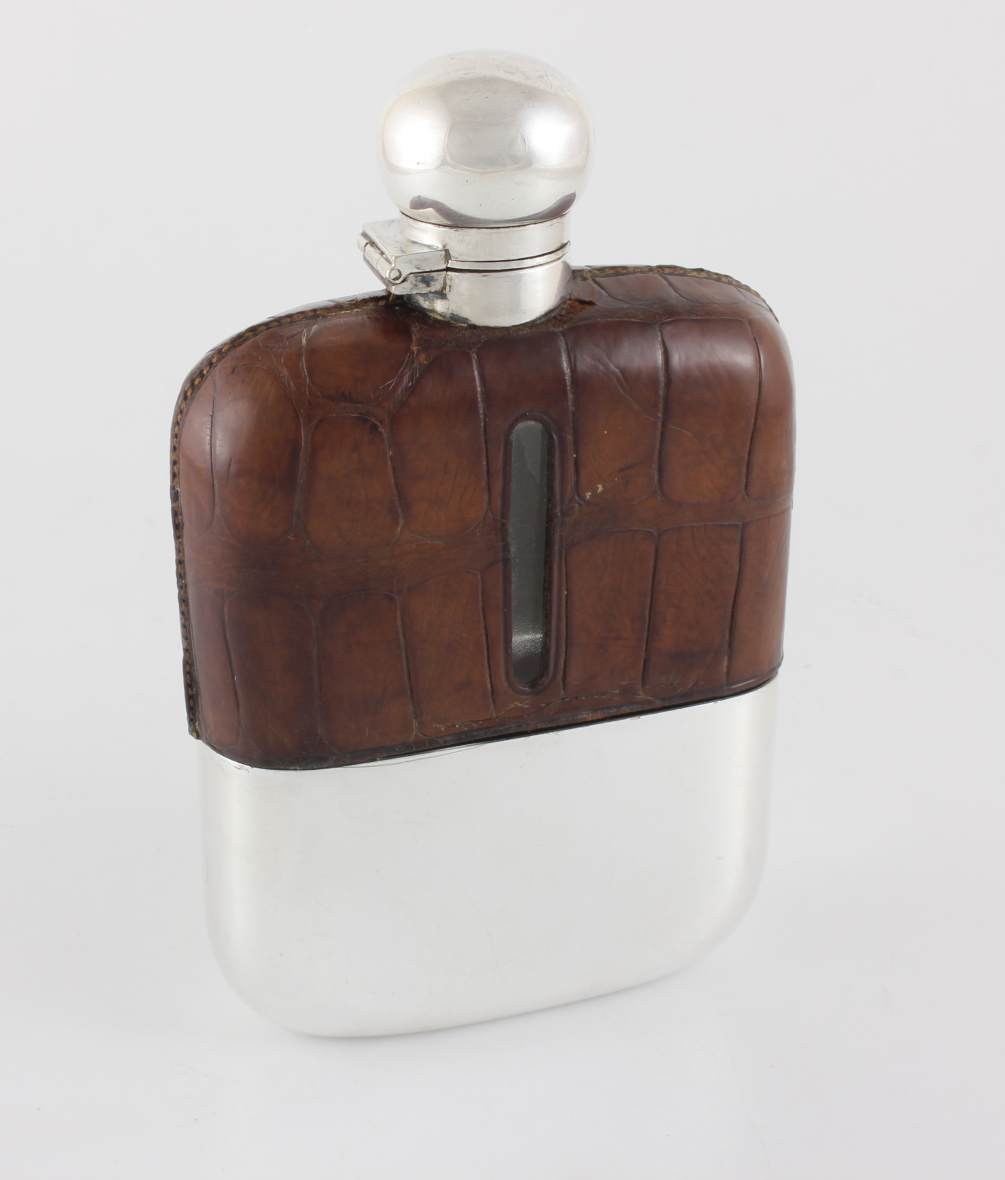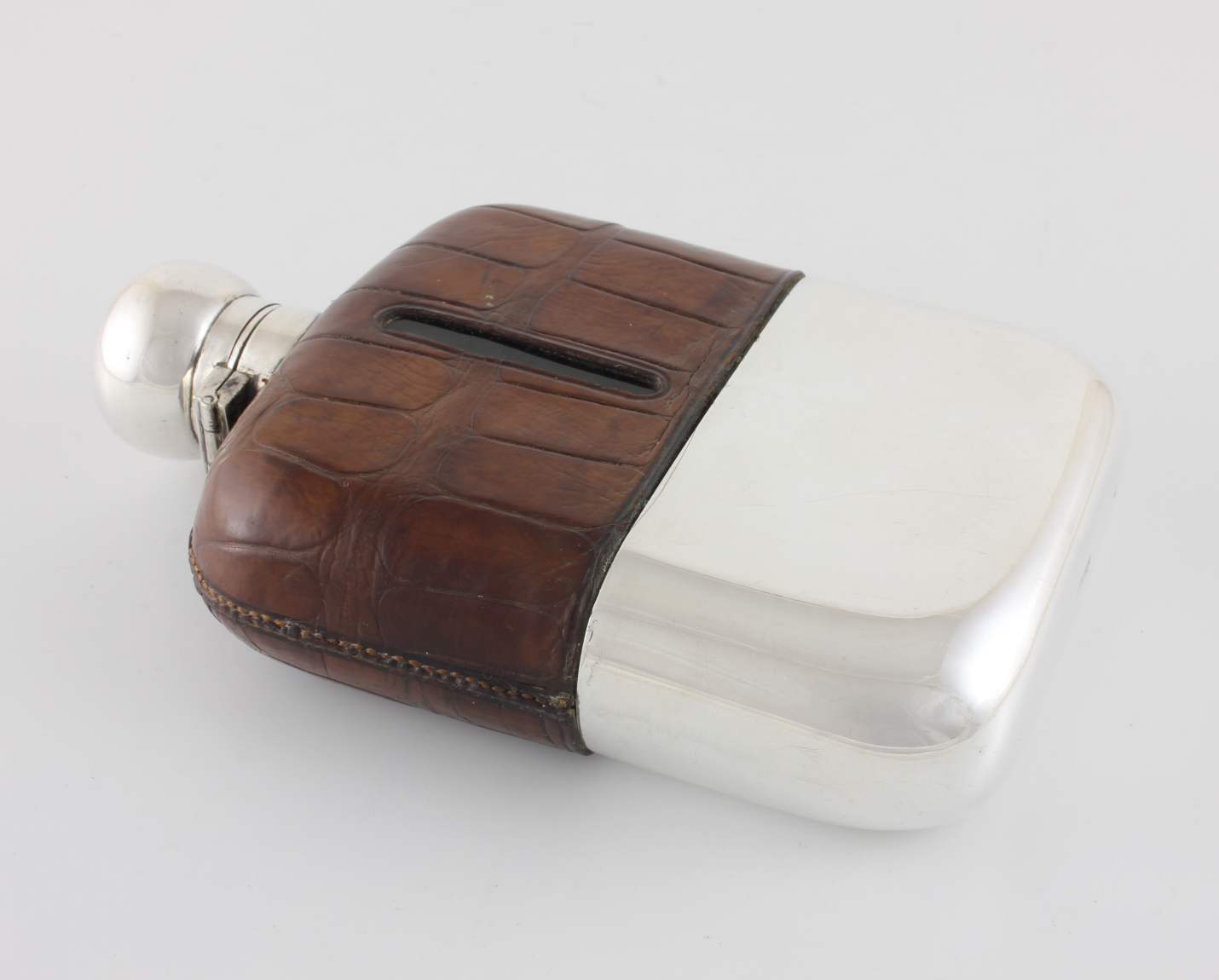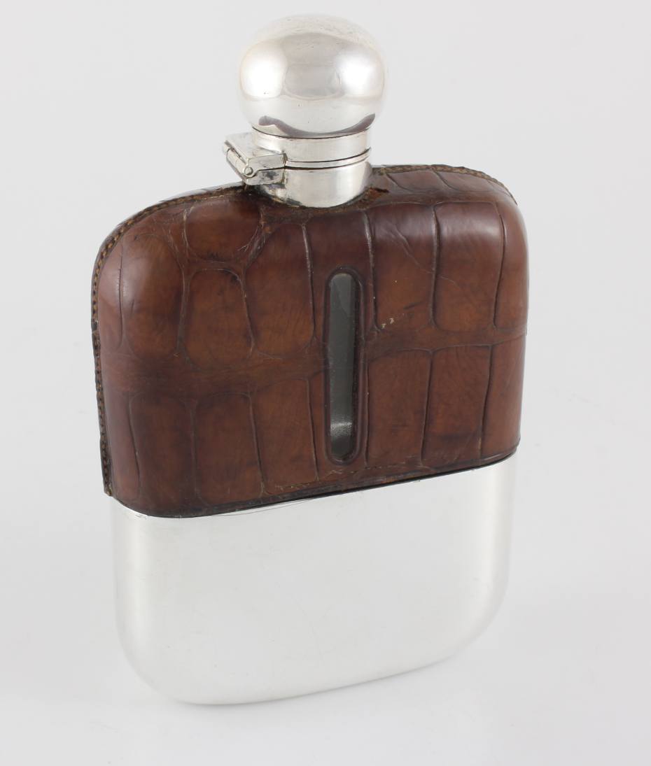 The outer of the top half is covered in a beautiful rich brown crocodile effect leather with a sight level to both sides, the bayonet top cap seals well, does not leak and there is no inscription or monogram.