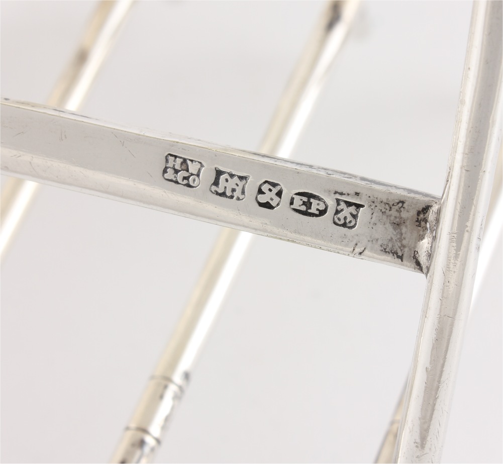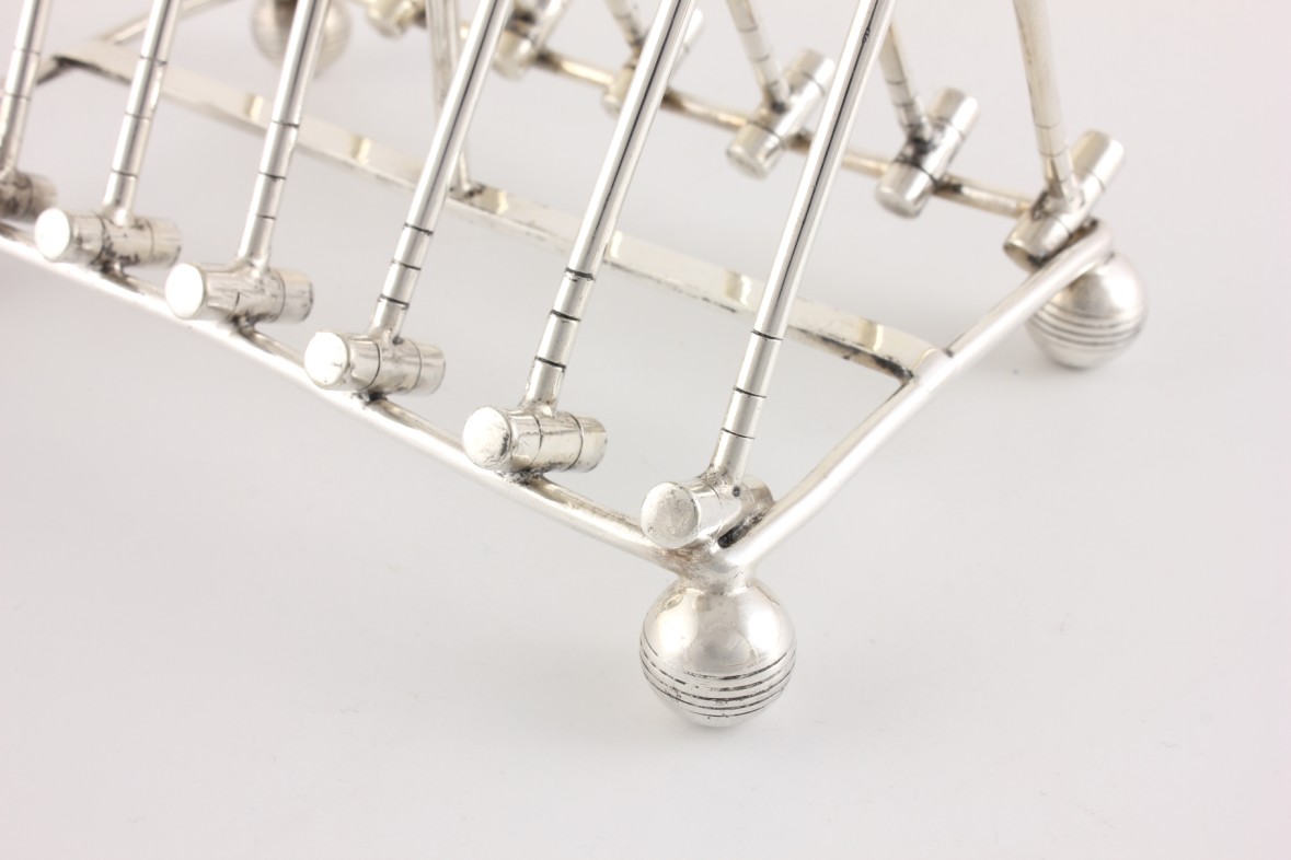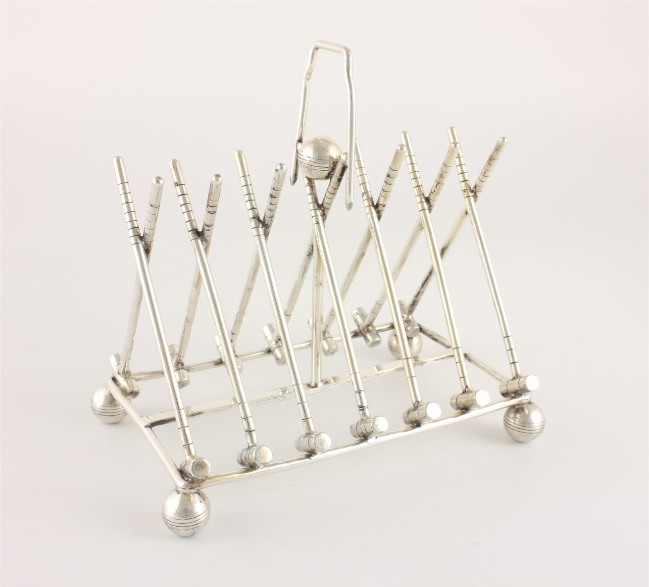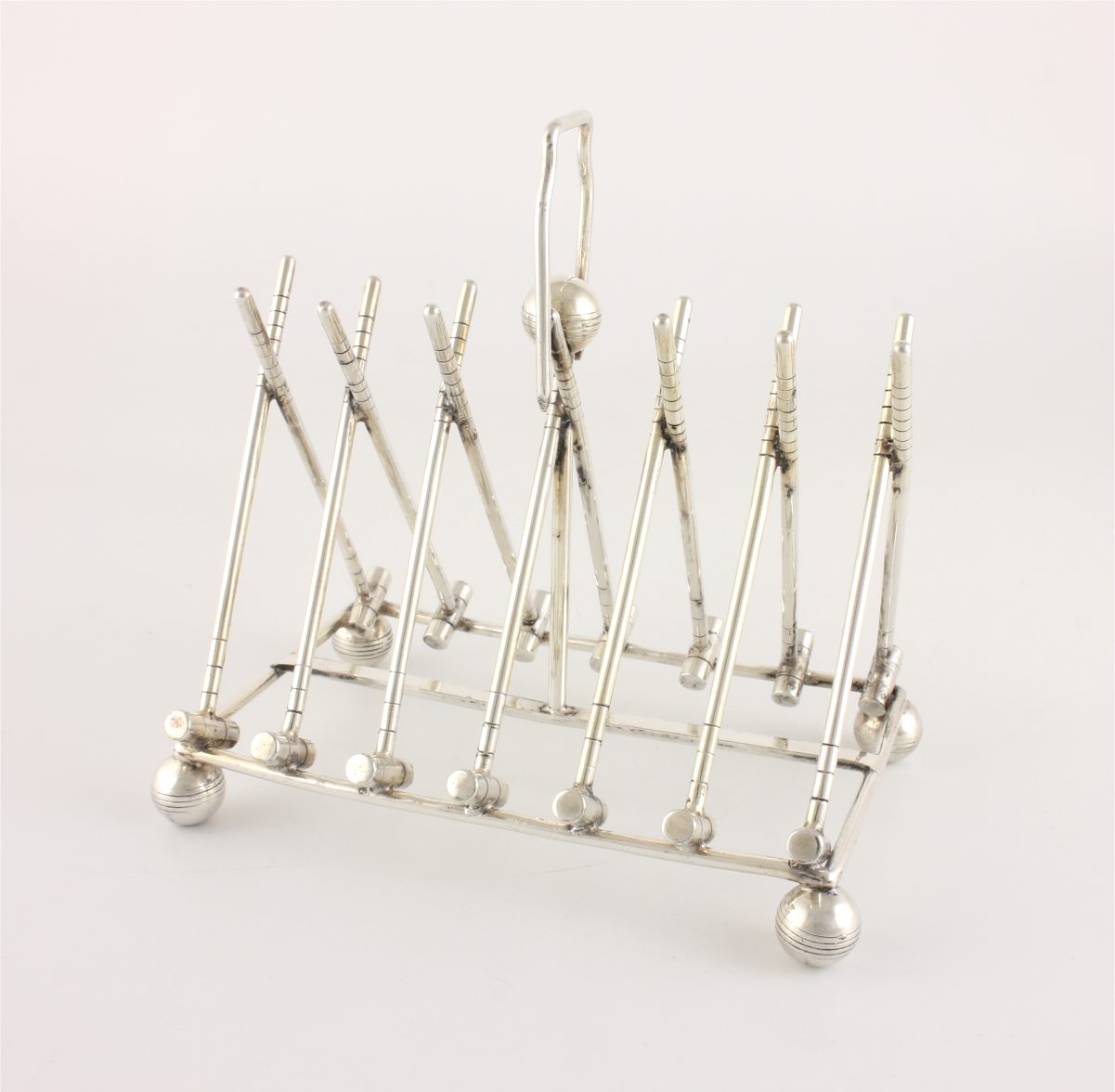 This handsome Victorian silver plated croquet toast rack which has 7 pairs of crossed croquet mallets is marked to the underside with it's diamond registered design lozenge mark which dates to 1871 and is by Henry Wilkinson & Co.