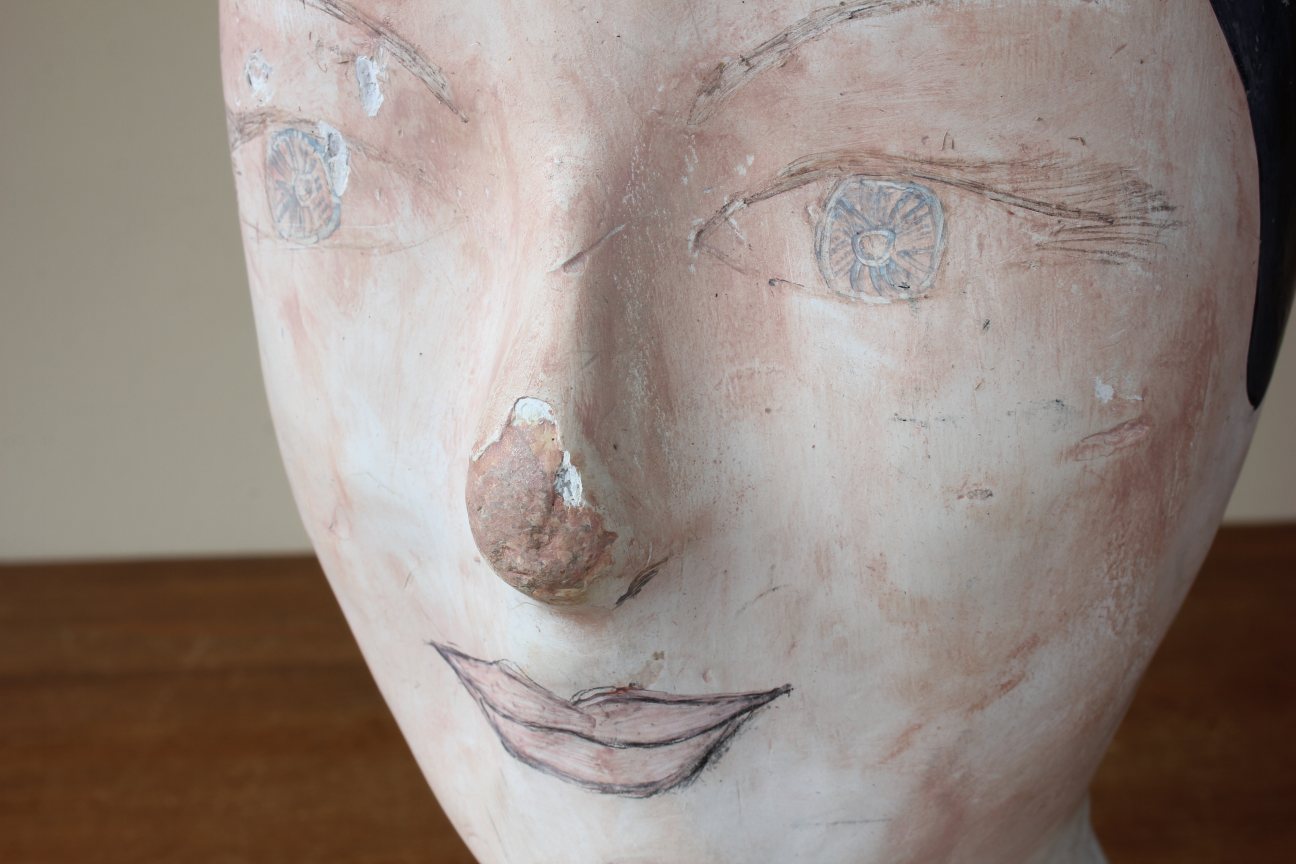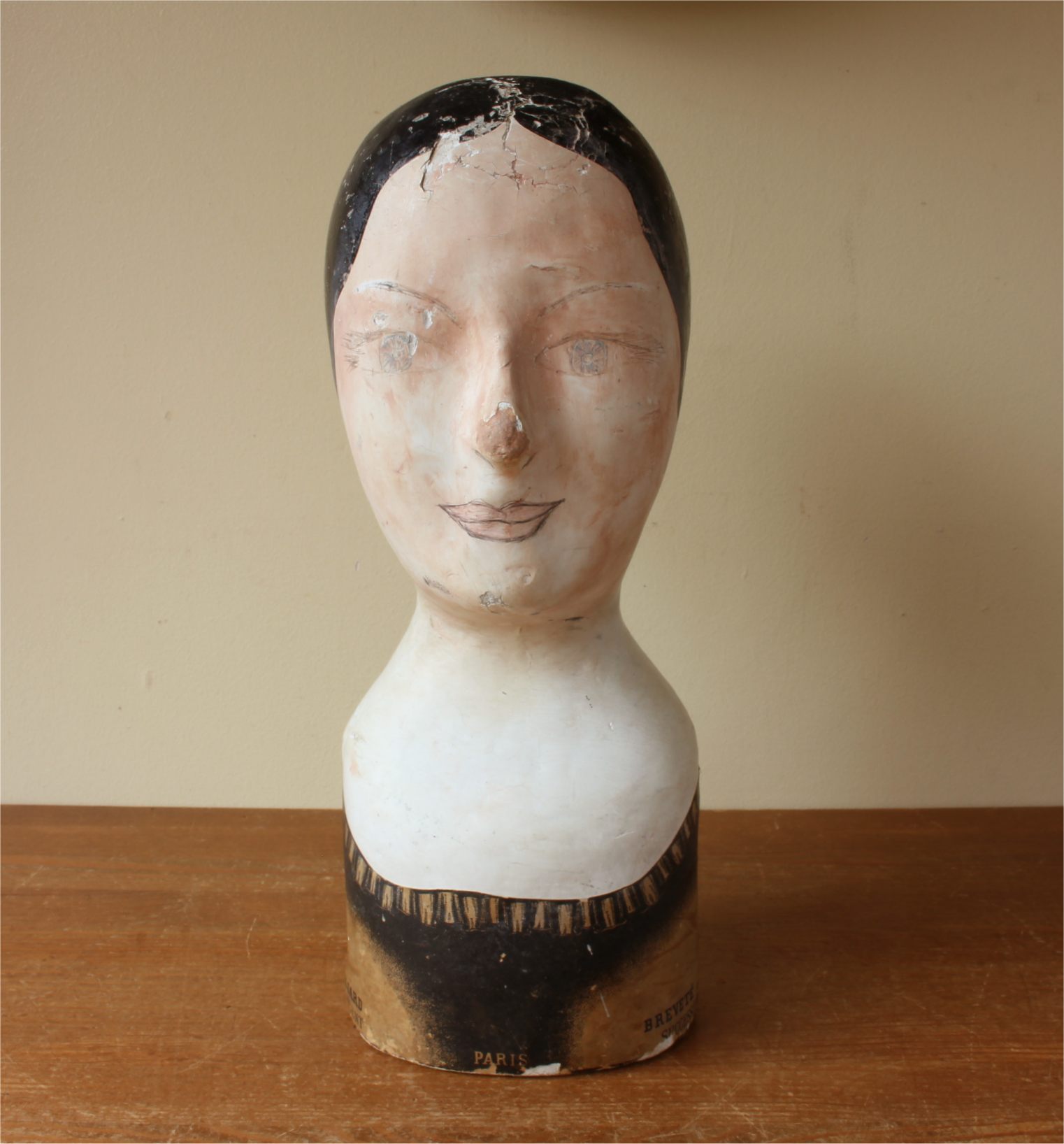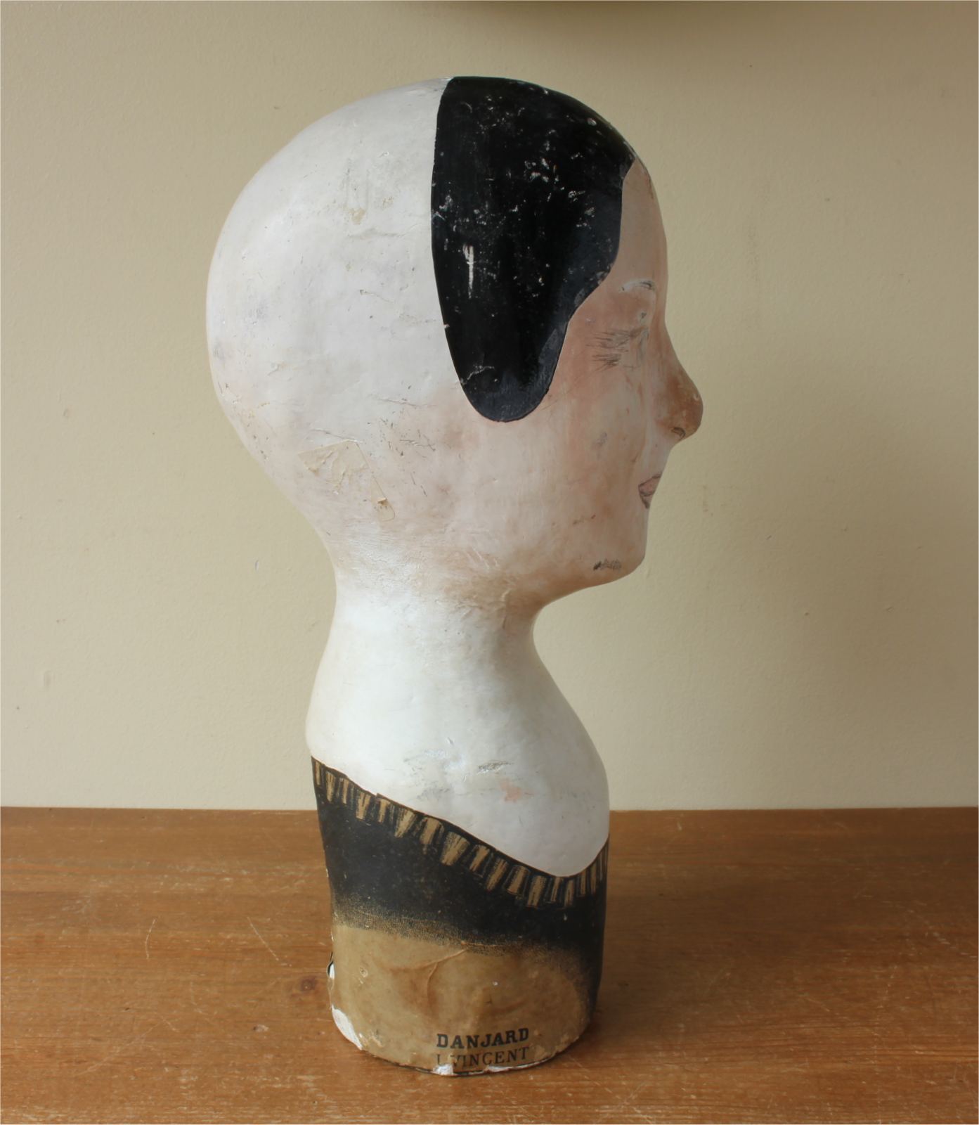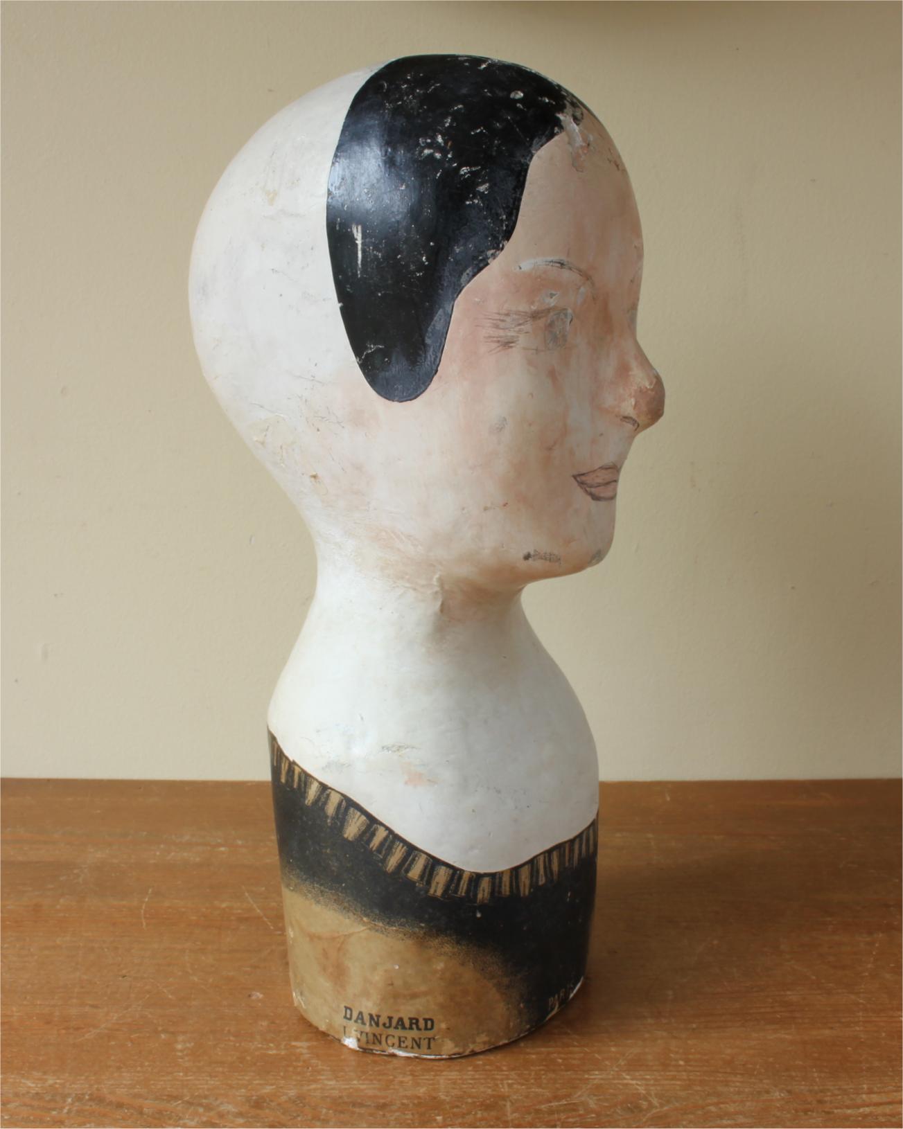 This antique hat display which is in the form of a ladies head is painted and marked with the maker's details of Danjard. L. Vincent, Paris.