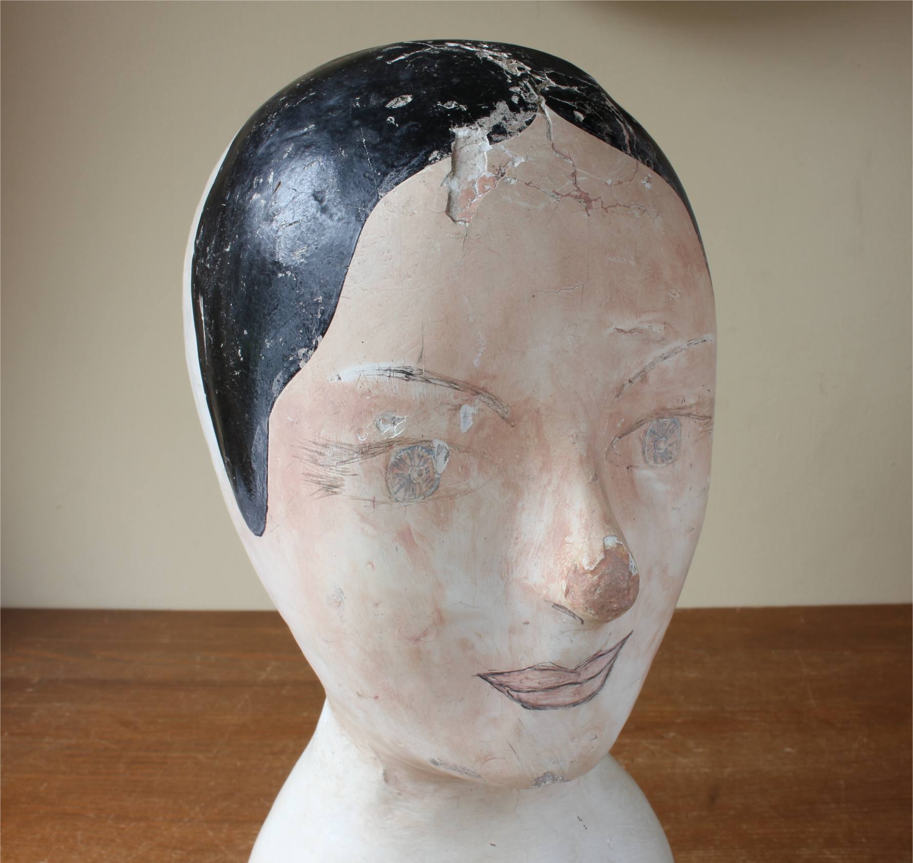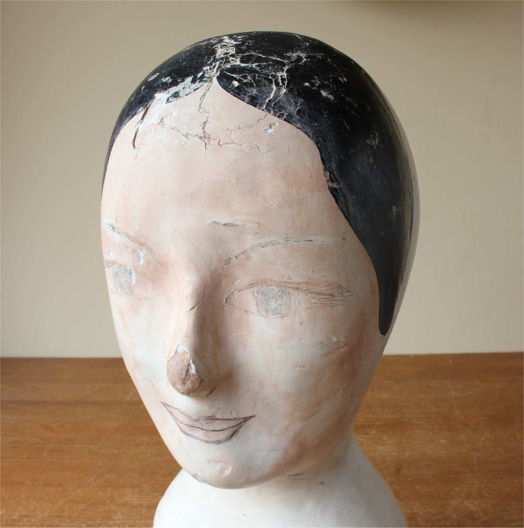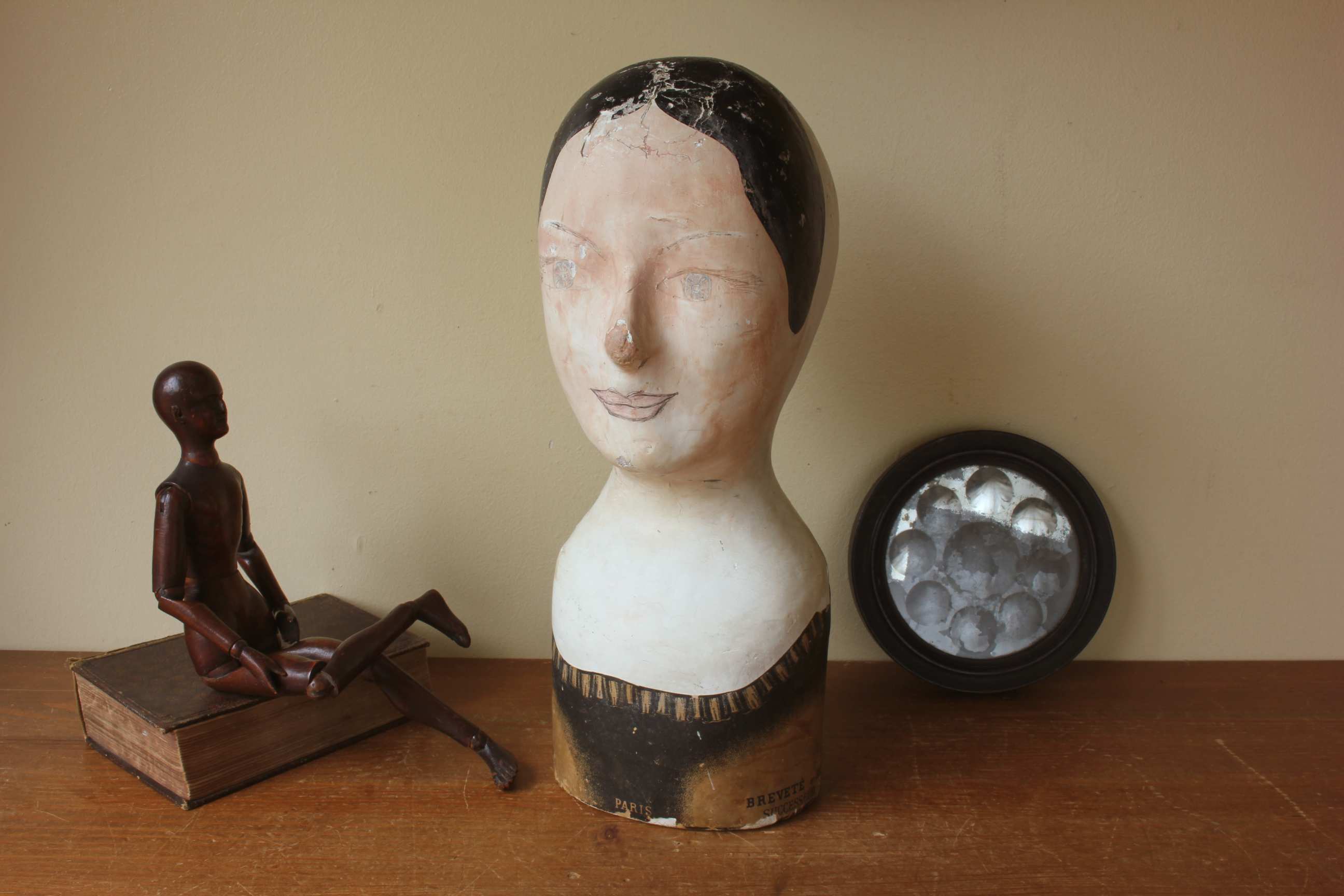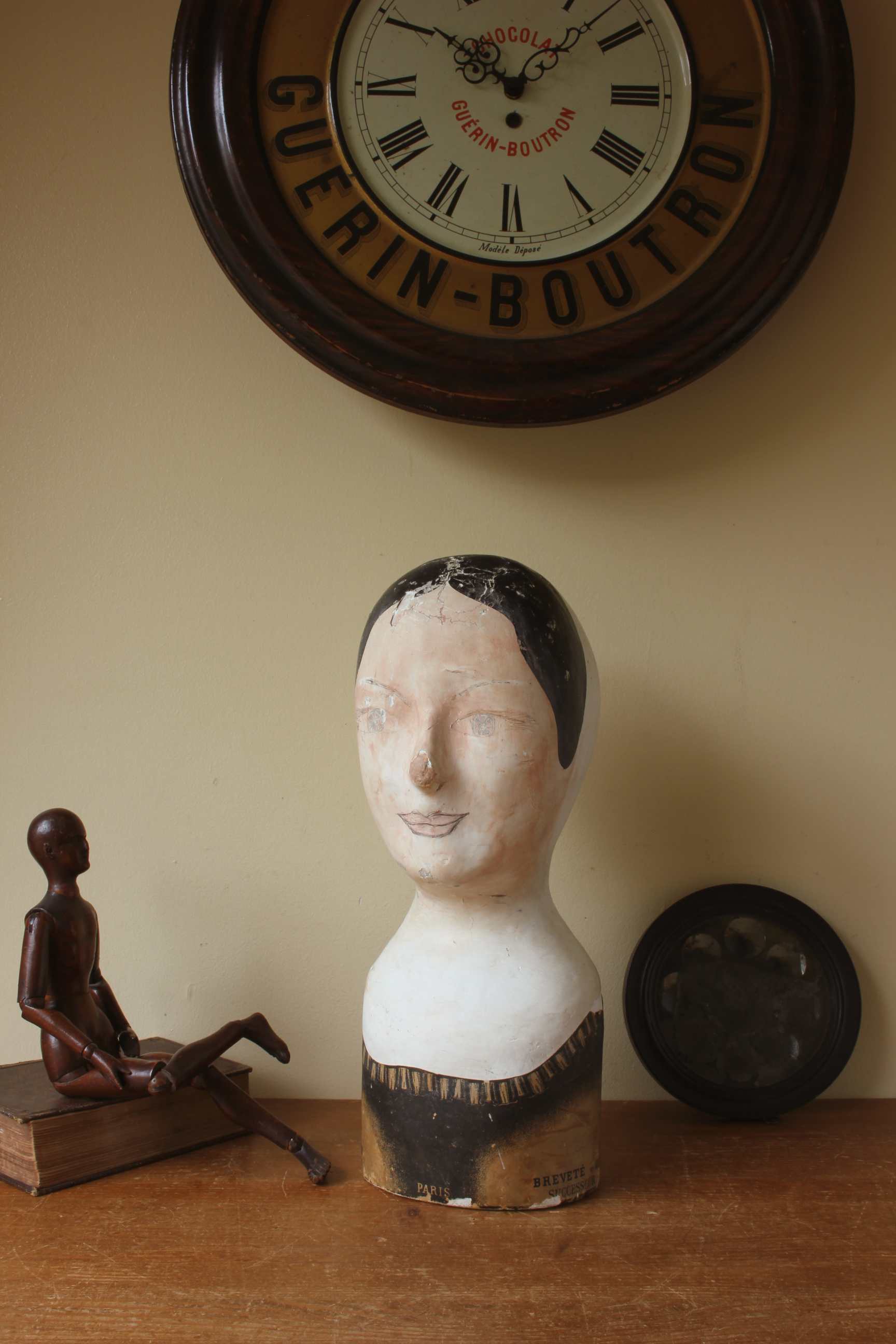 This antique hat display which is in the form of a ladies head is painted and marked with the maker's details of Danjard. L. Vincent, Paris.
