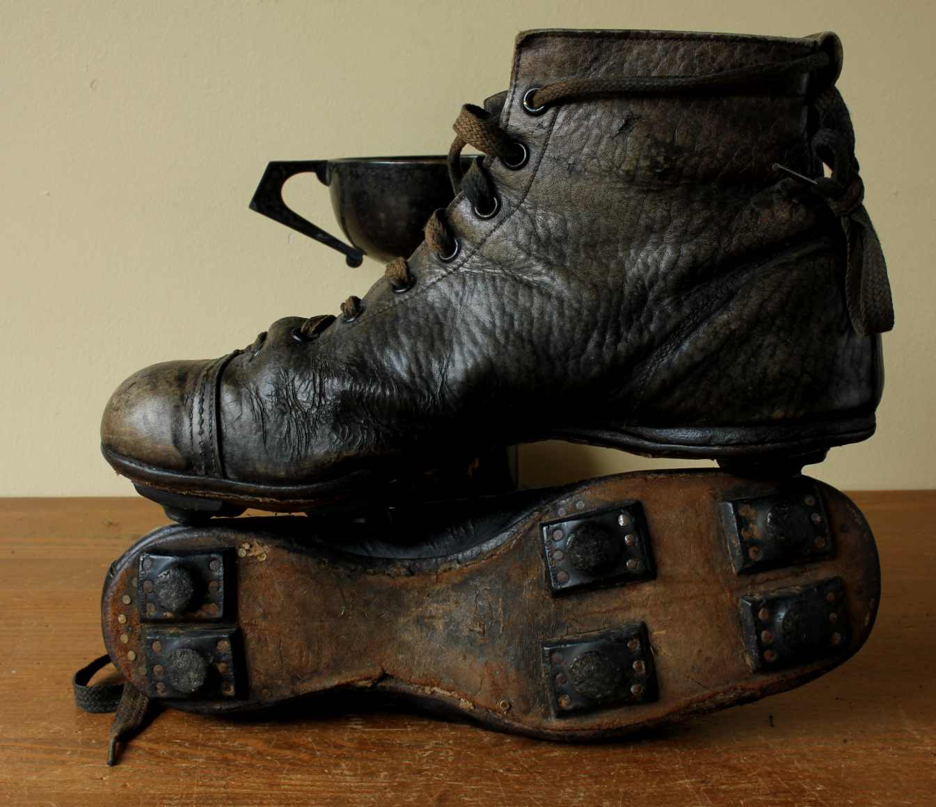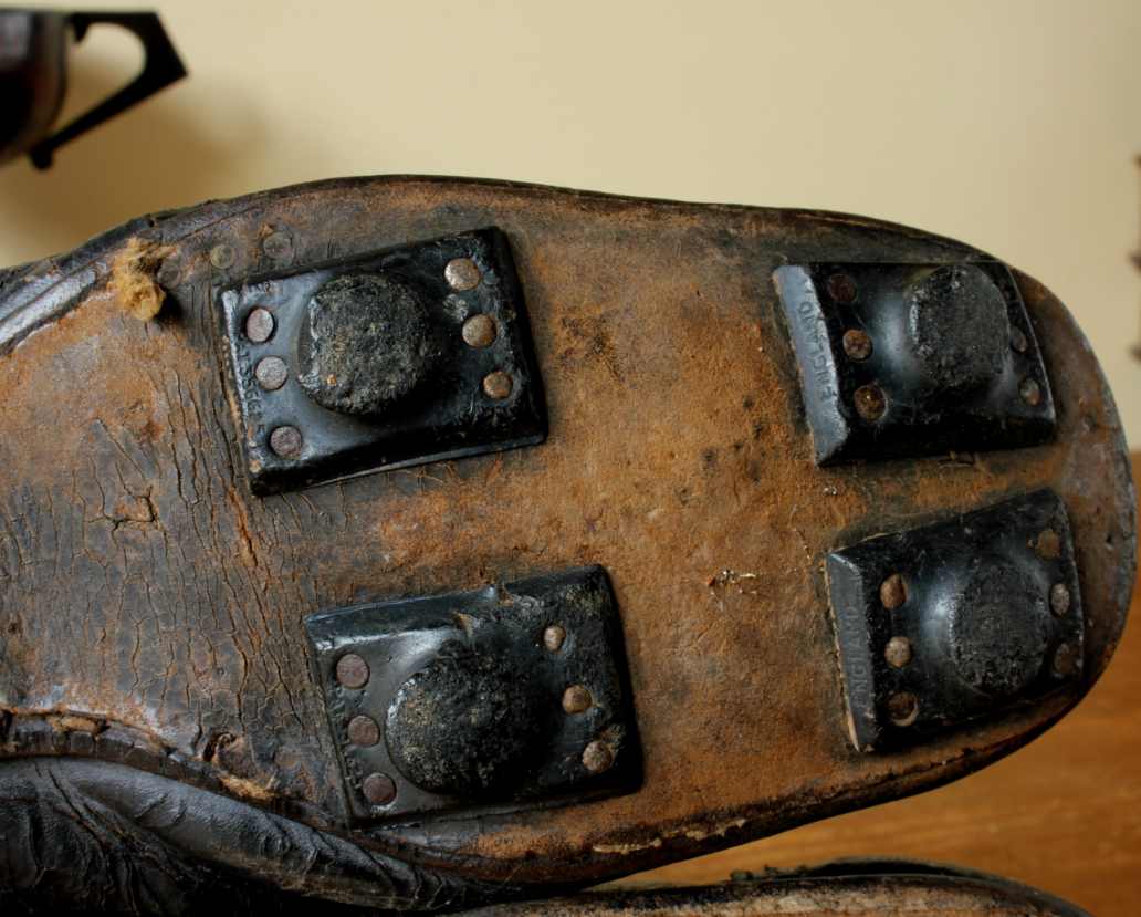 This very nice pair of vintage football boots which are made of dark brown leather with leather soles and nailed on rubber studs date from c1950 and are a large size being an adults size 7.