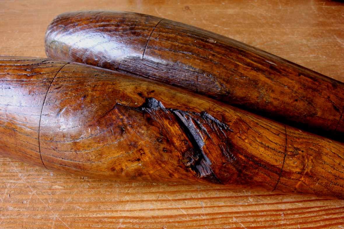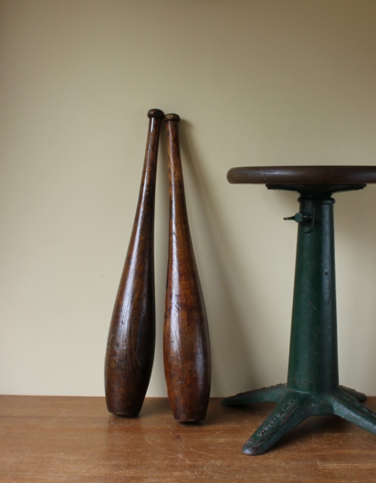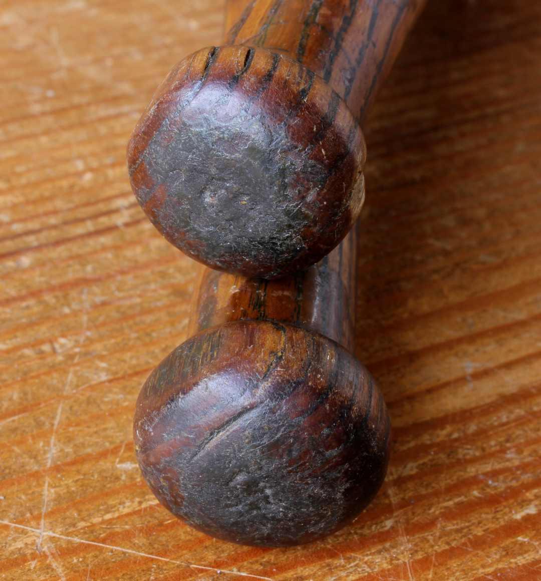 This handsome pair of antique wooden Indian clubs or exercise meels which were hand made in the late 19th / early 20th century have a wonderful dark colour and a ring decoration to the body.