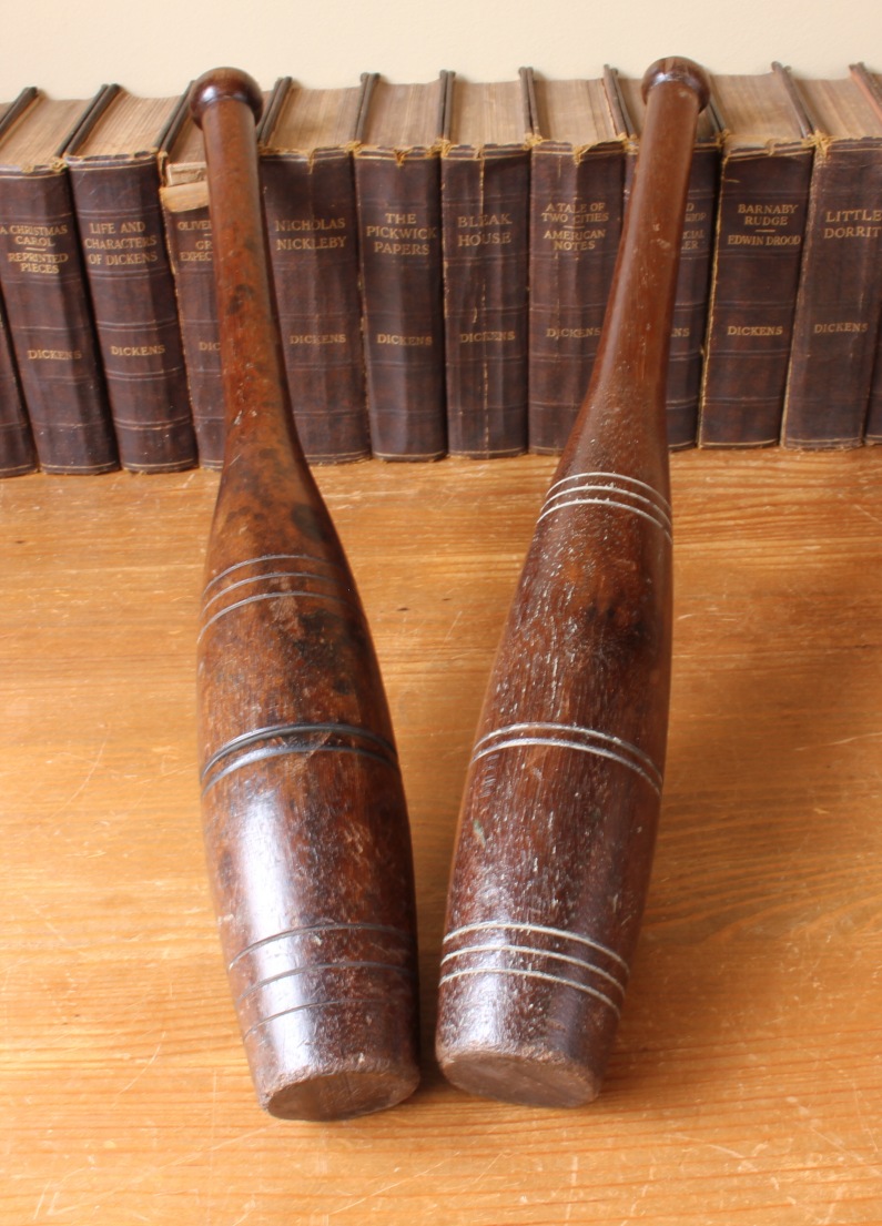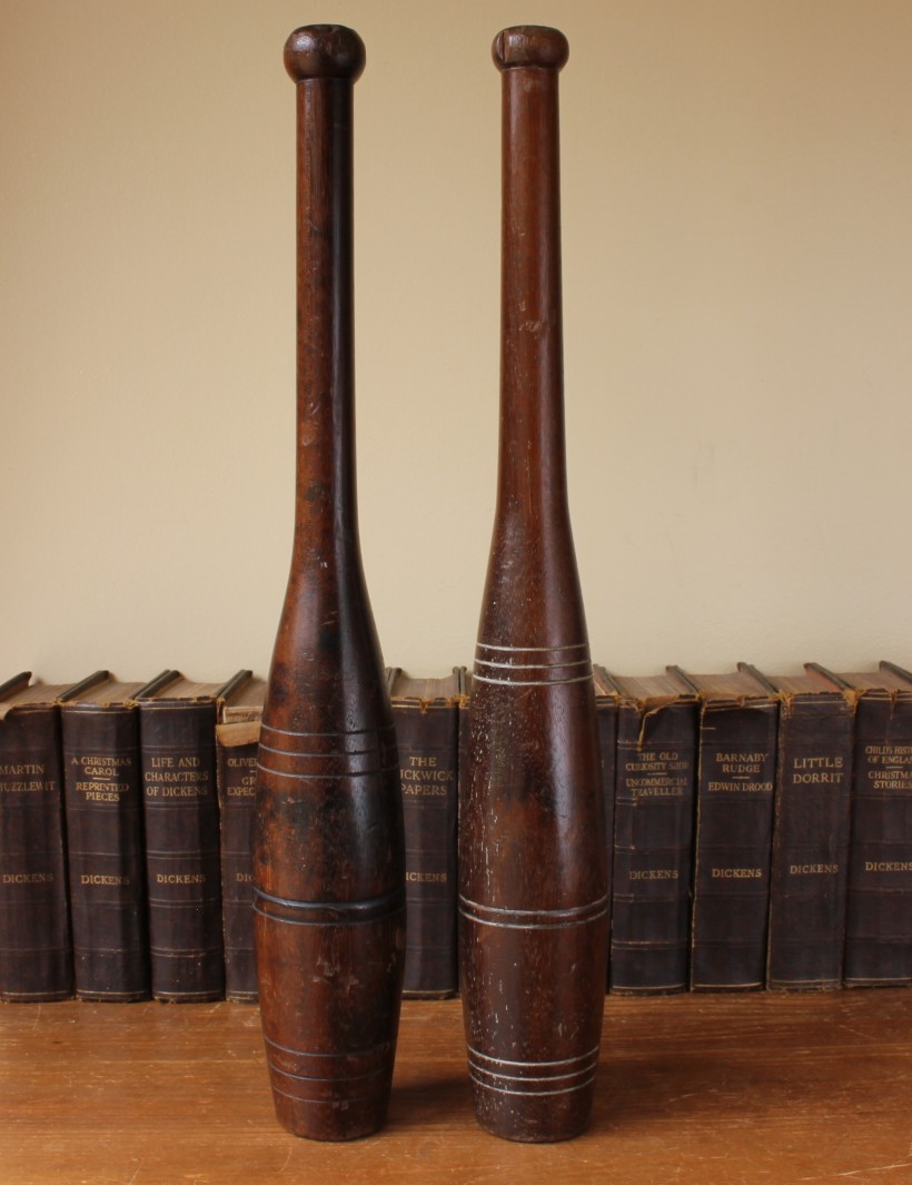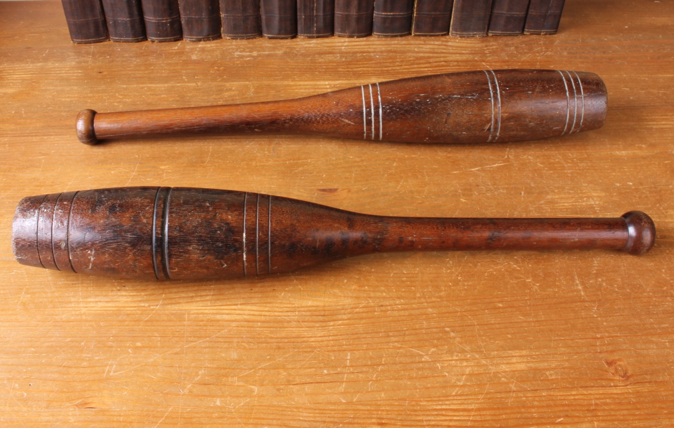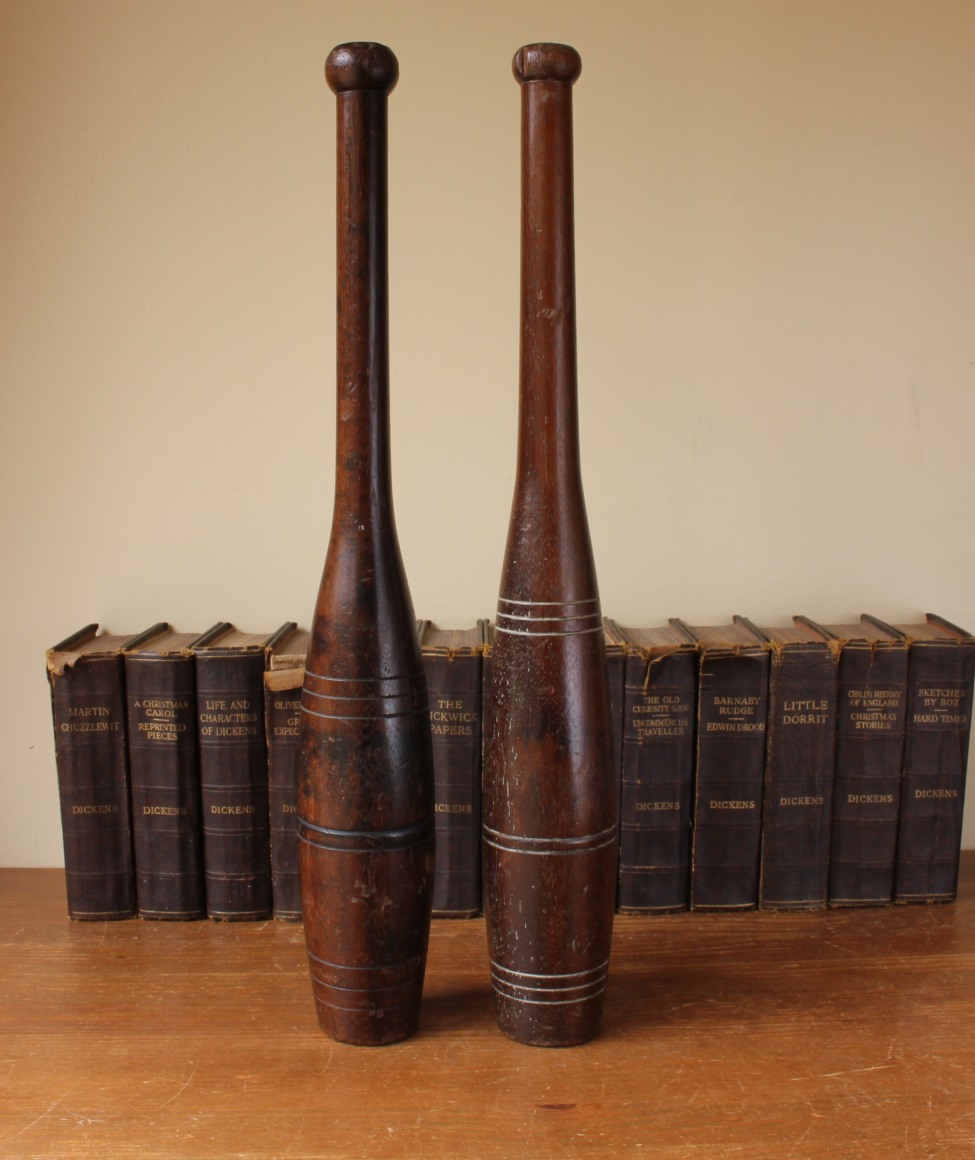 This handsome set hard wood Indian clubs or meels which date from c1900 are very attractive being made from a heavy dark grained wood and are approx 50 cm - 19 1/2" in length.