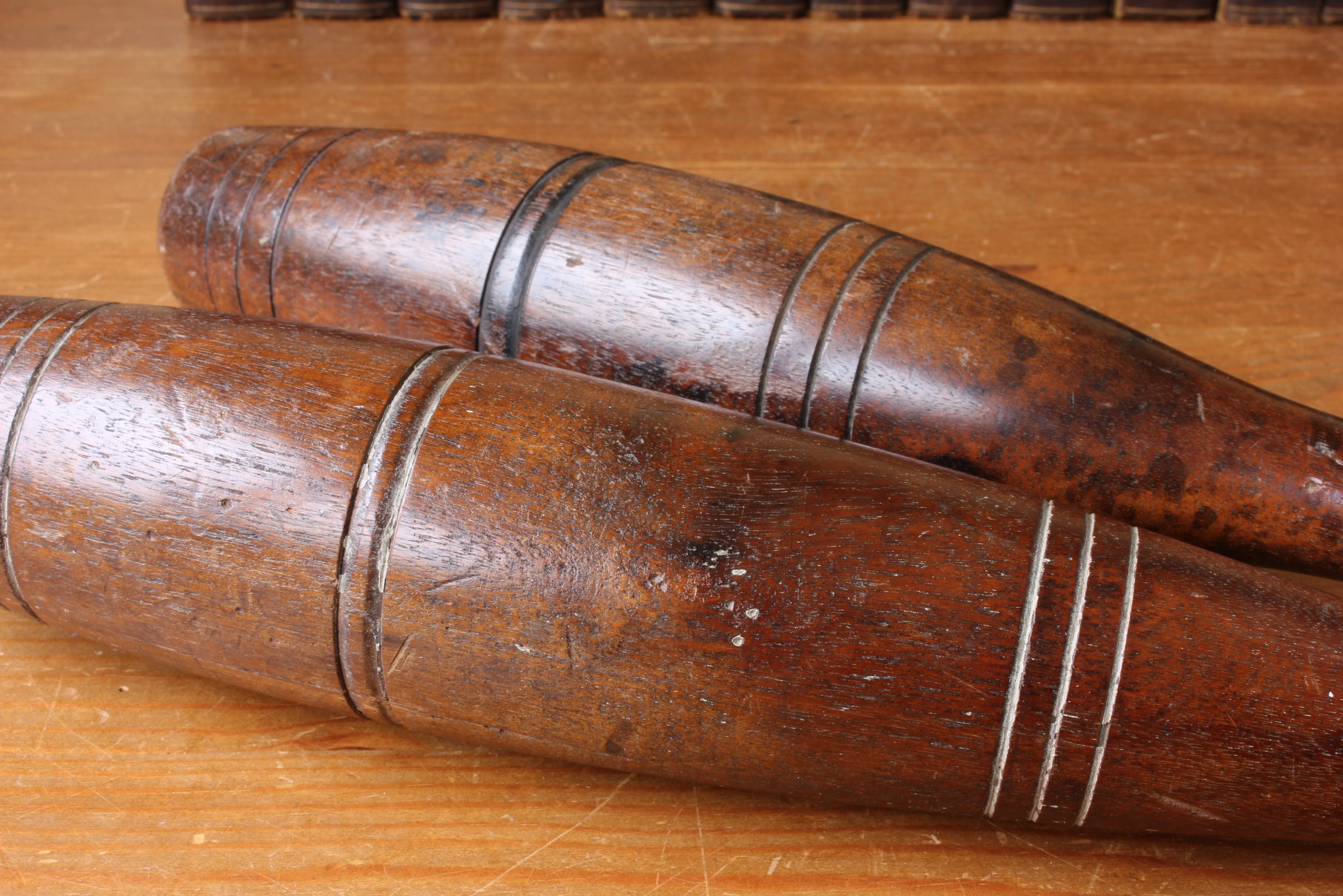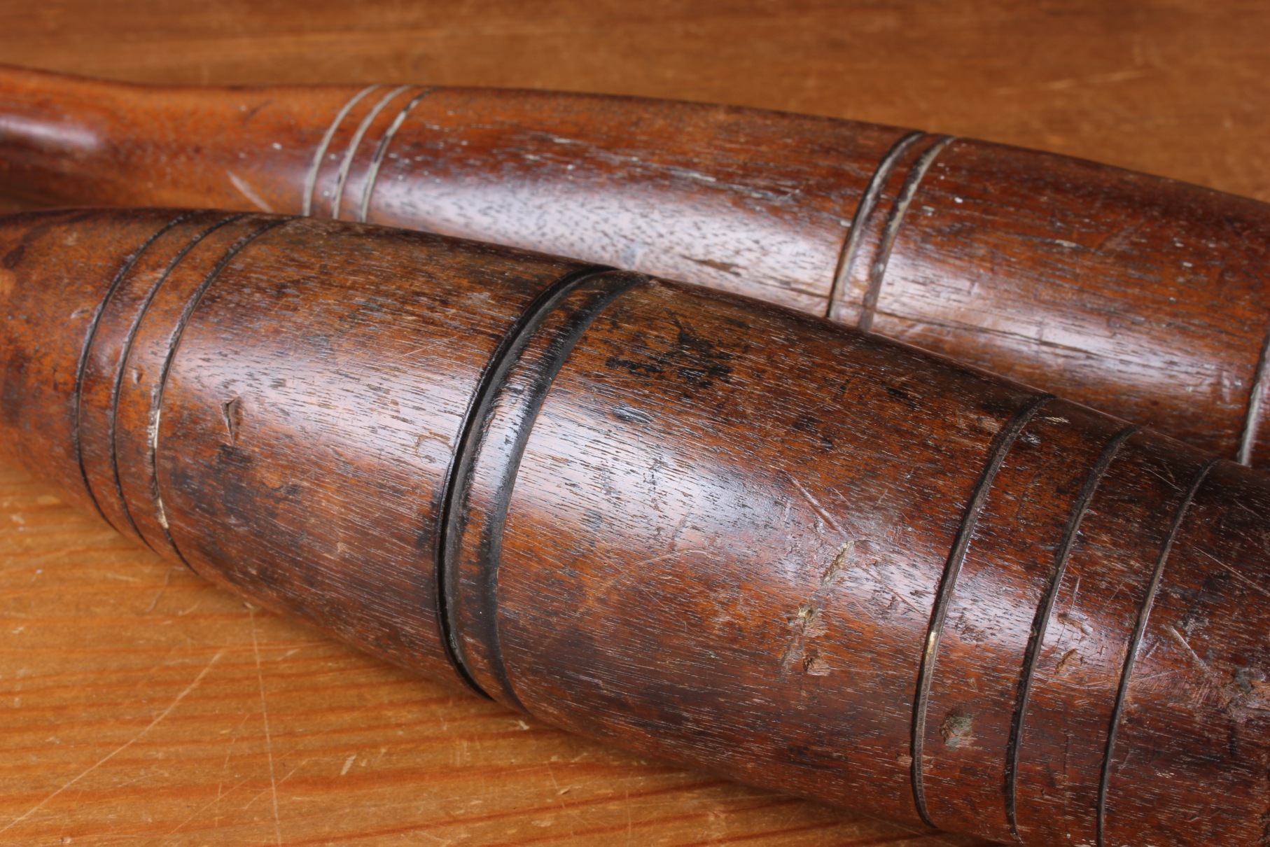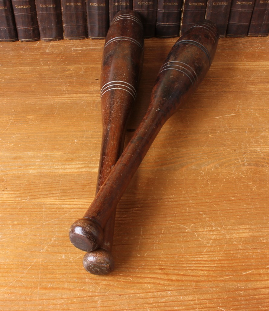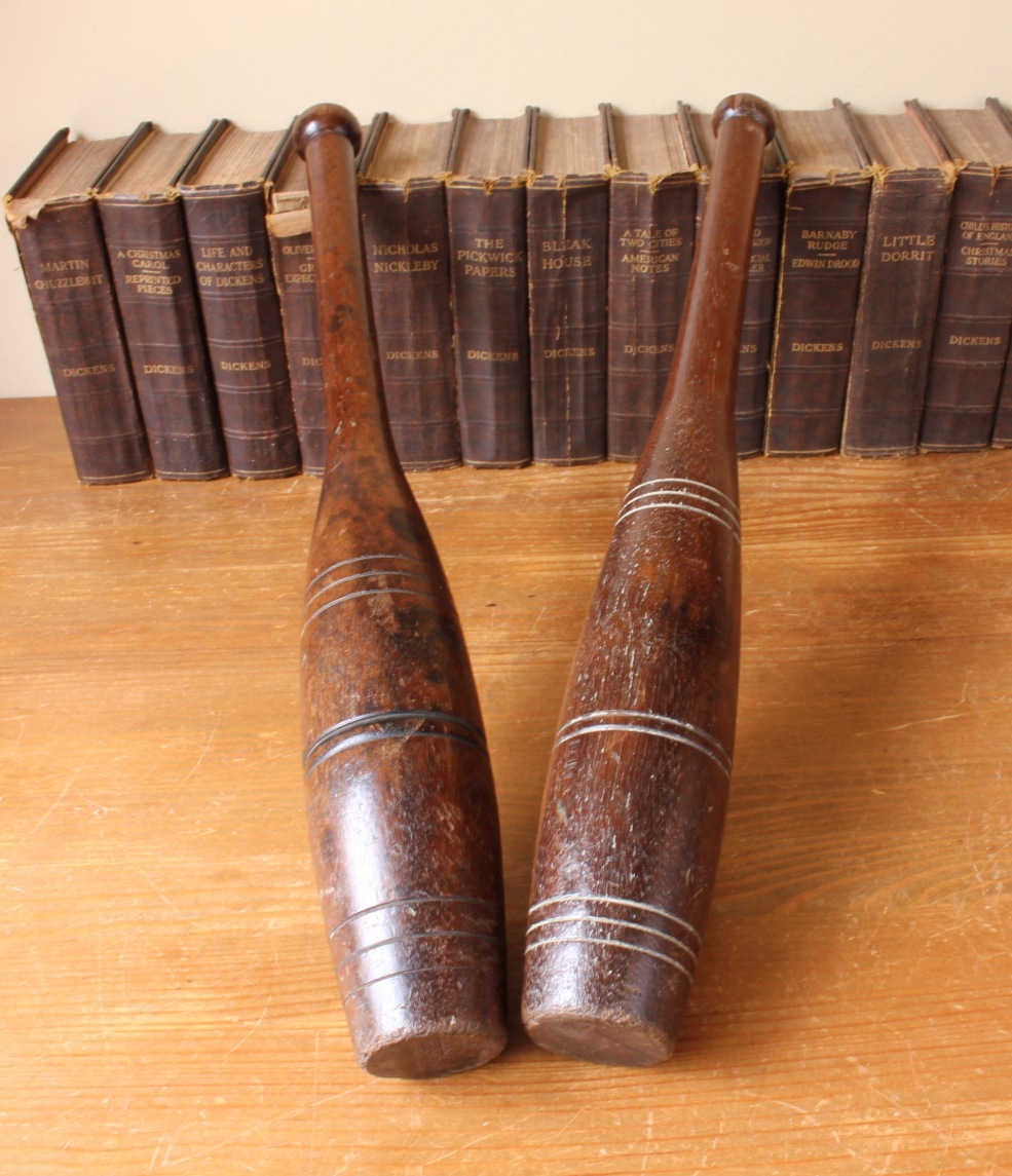 This handsome set hard wood Indian clubs or meels which date from c1900 are very attractive being made from a heavy dark grained wood and are approx 50 cm - 19 1/2" in length.