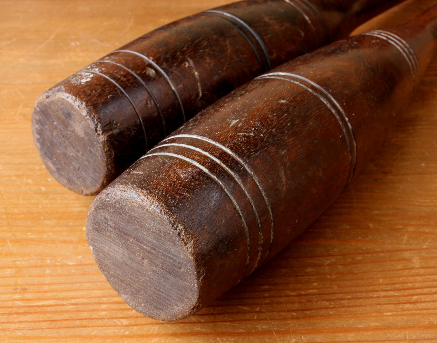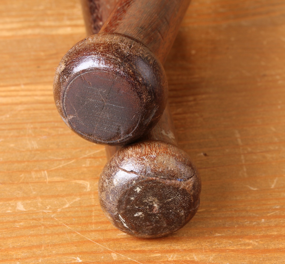Condition: Very good vintage/antique condition with the usual splits, chips, dents and wear leaving a great look. Interesting display items, home decor, or gym or decoration. The are some differences between the two clubs like the carved rings. Please see pictures.