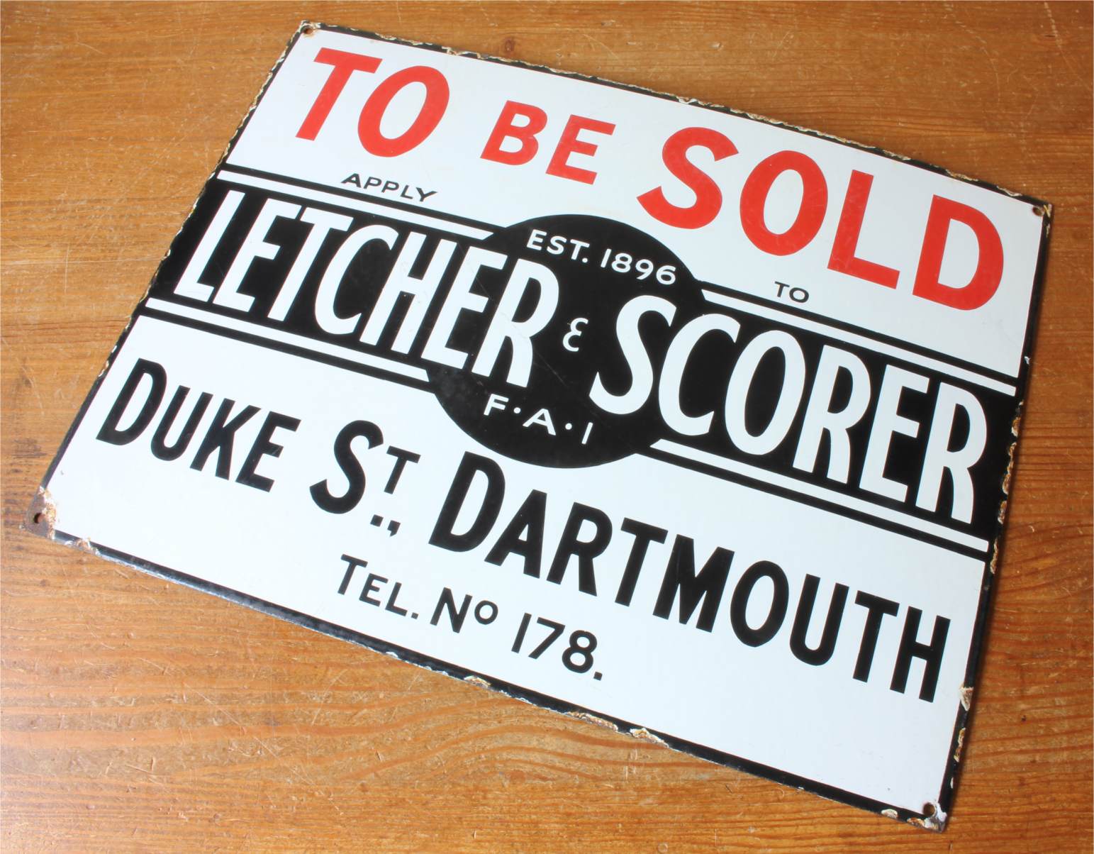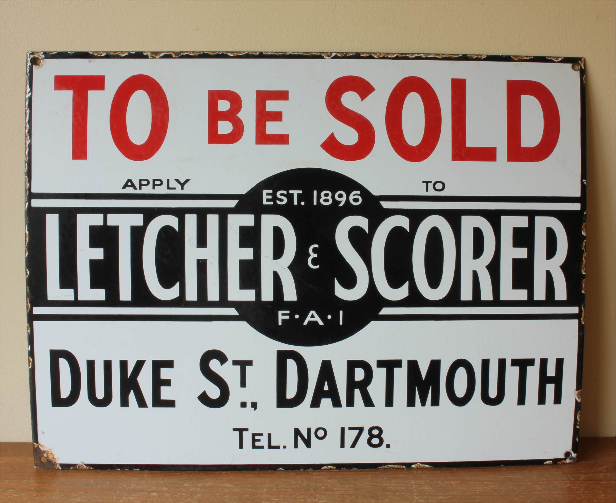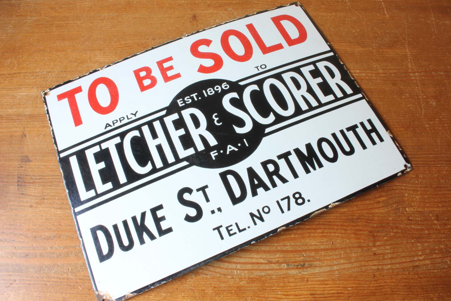 To Be Sold. Apply To Letcher & Scorer. Est 1896. FAI. Duke Street Dartmouth. Tel No. 178.