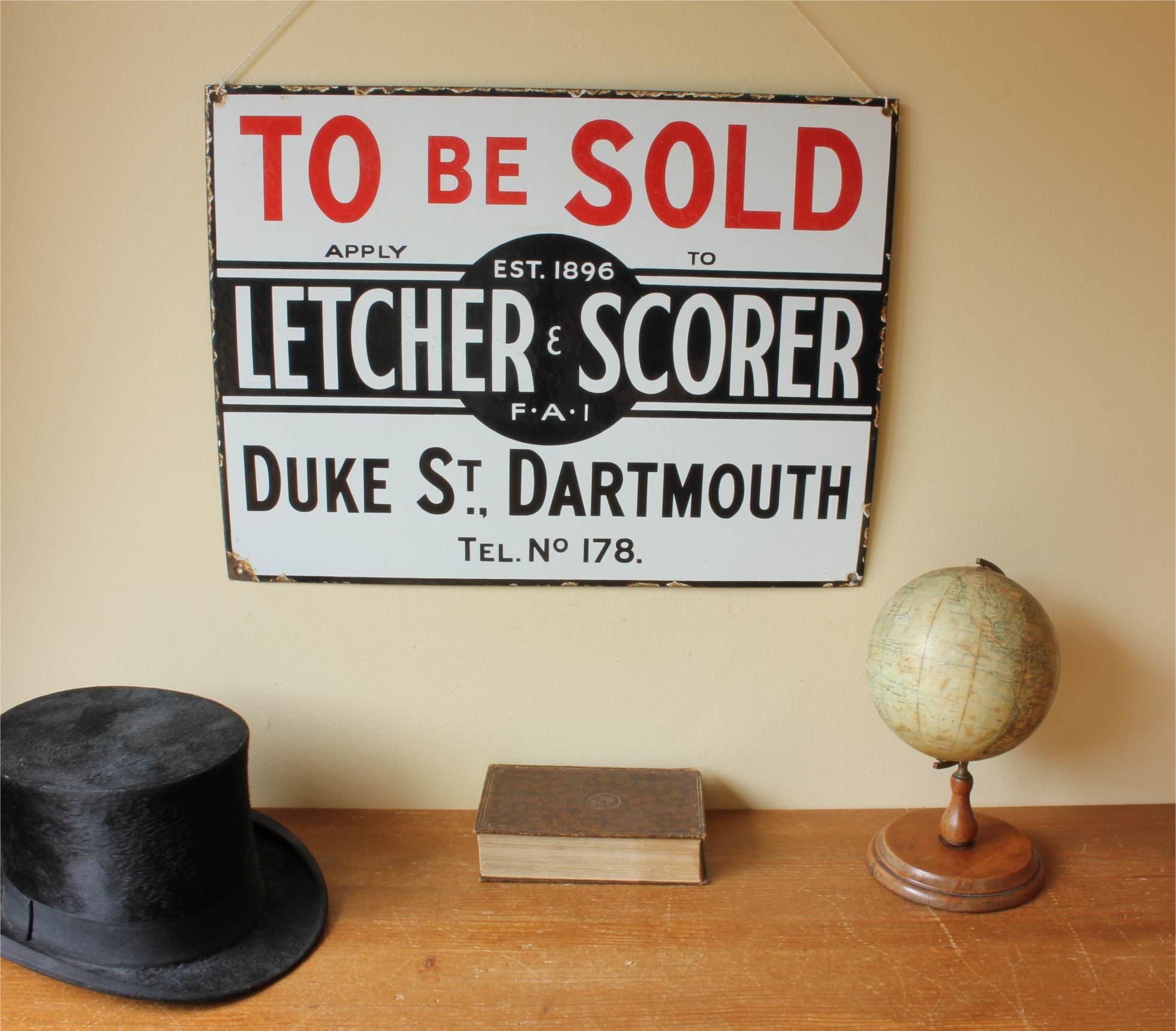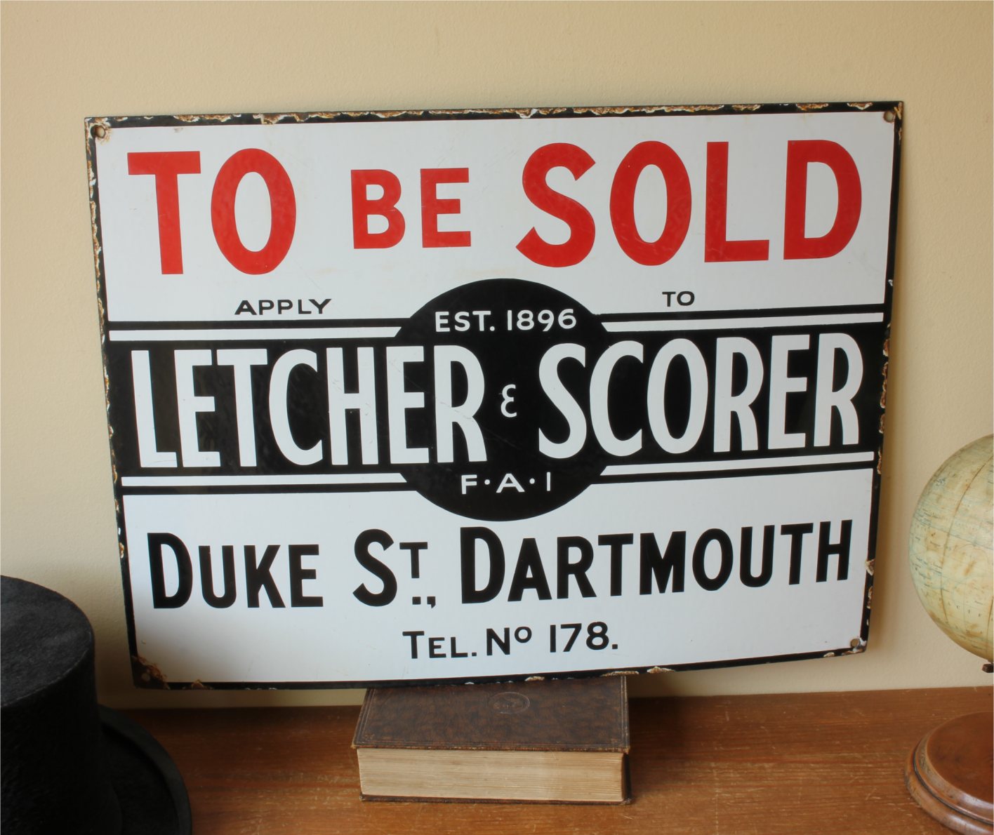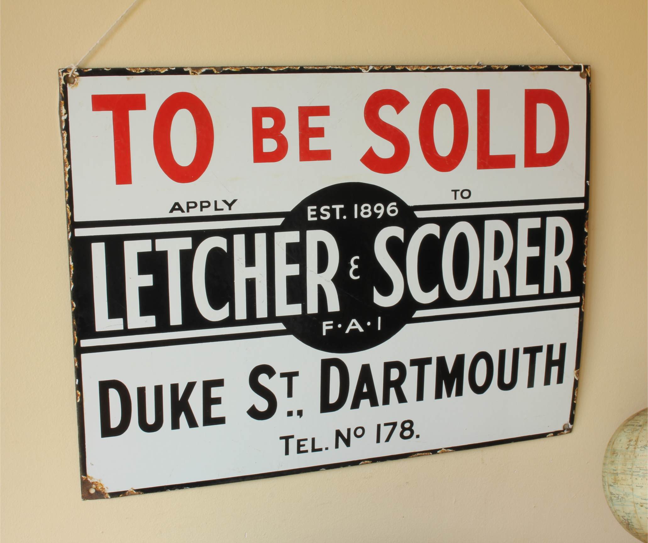 To Be Sold. Apply To Letcher & Scorer. Est 1896. FAI. Duke Street Dartmouth. Tel No. 178.