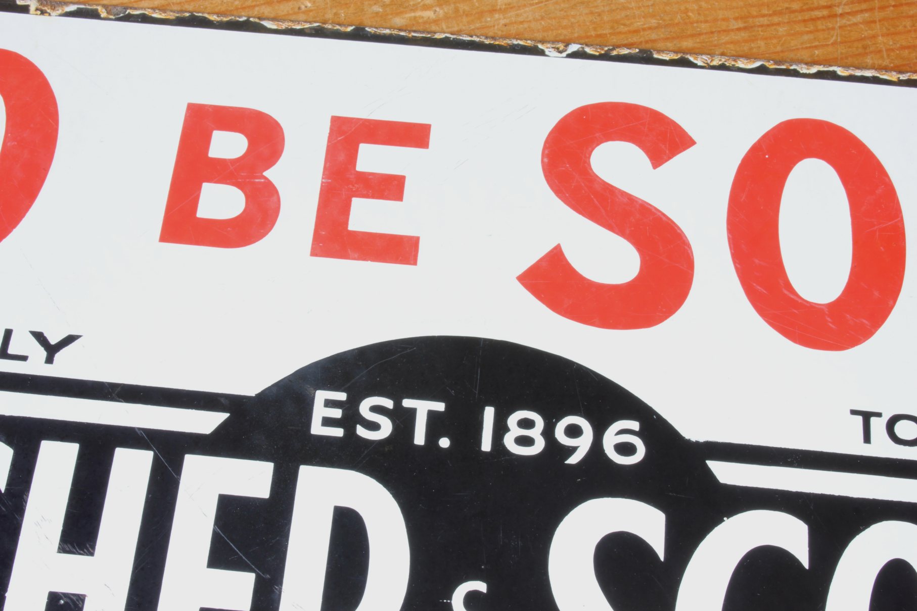 This original antique / vintage enamel metal sign which dates from the first half of the 20th century has a white background with black and red lettering which reads