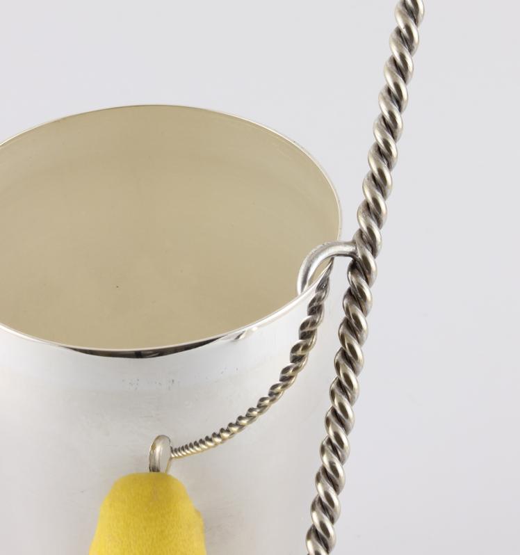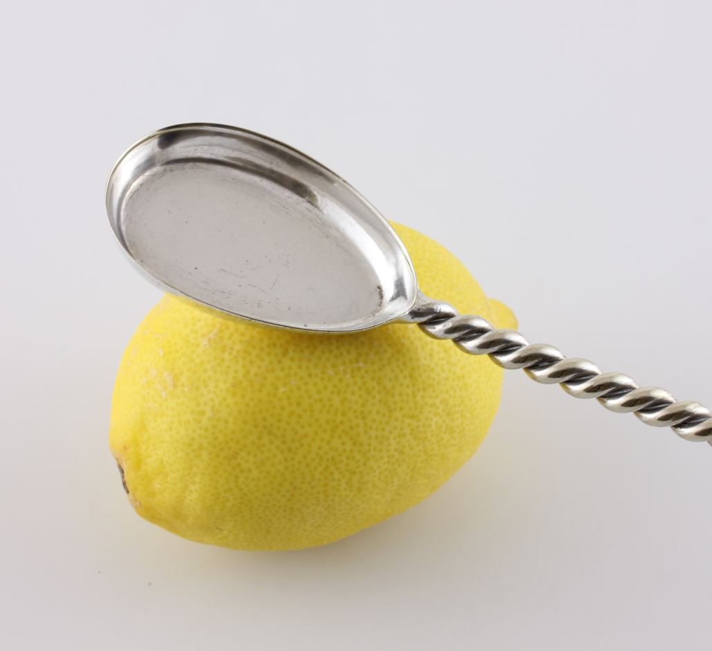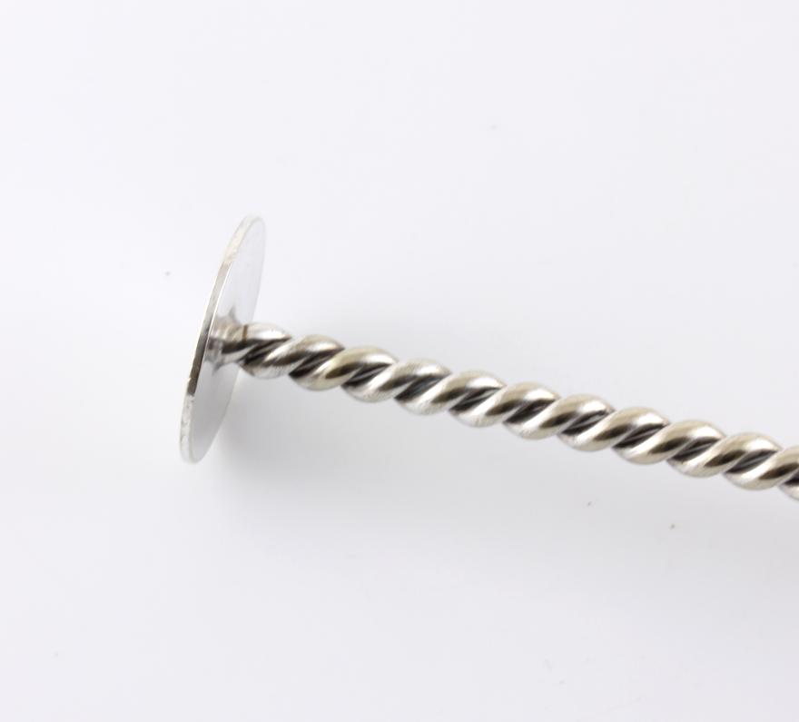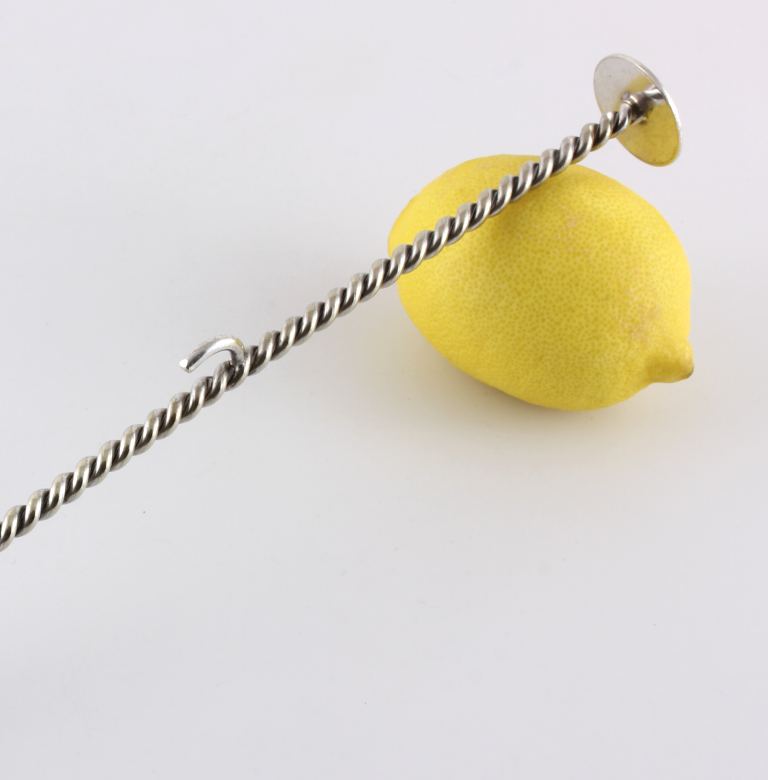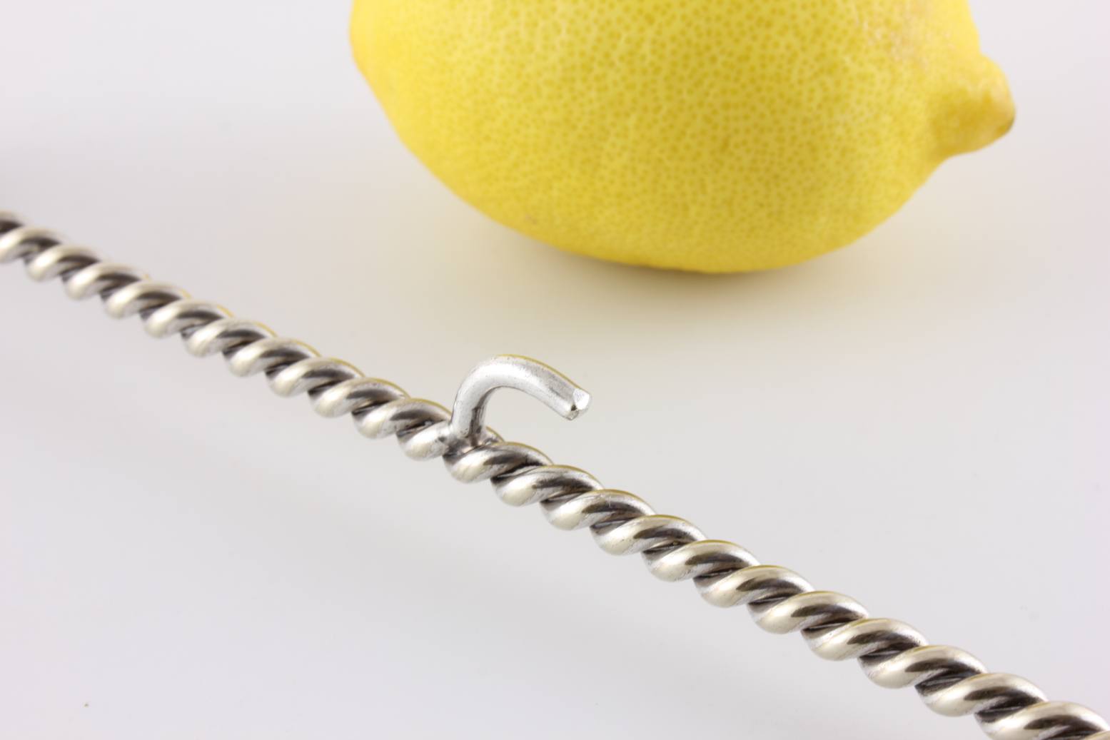 This long silver plated cocktail stirrer spoon which dates from c1920 has a twisted design with a central hook to hang on your cocktail shaker or ice bucket, a spoon to one end and a muddler for crushing your cocktail ingredients at the other.