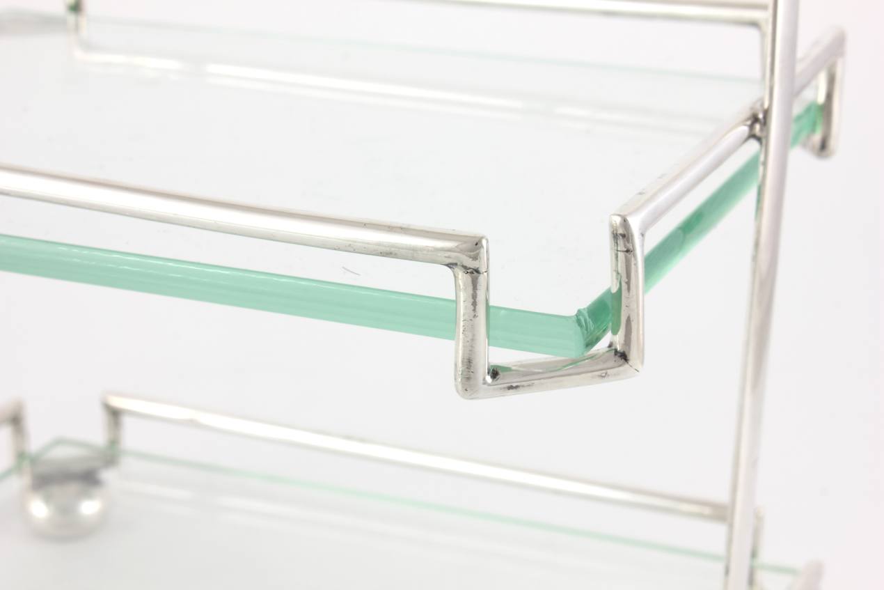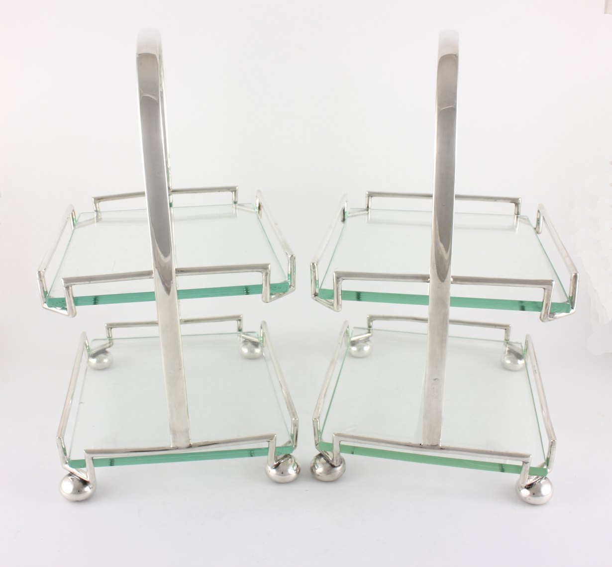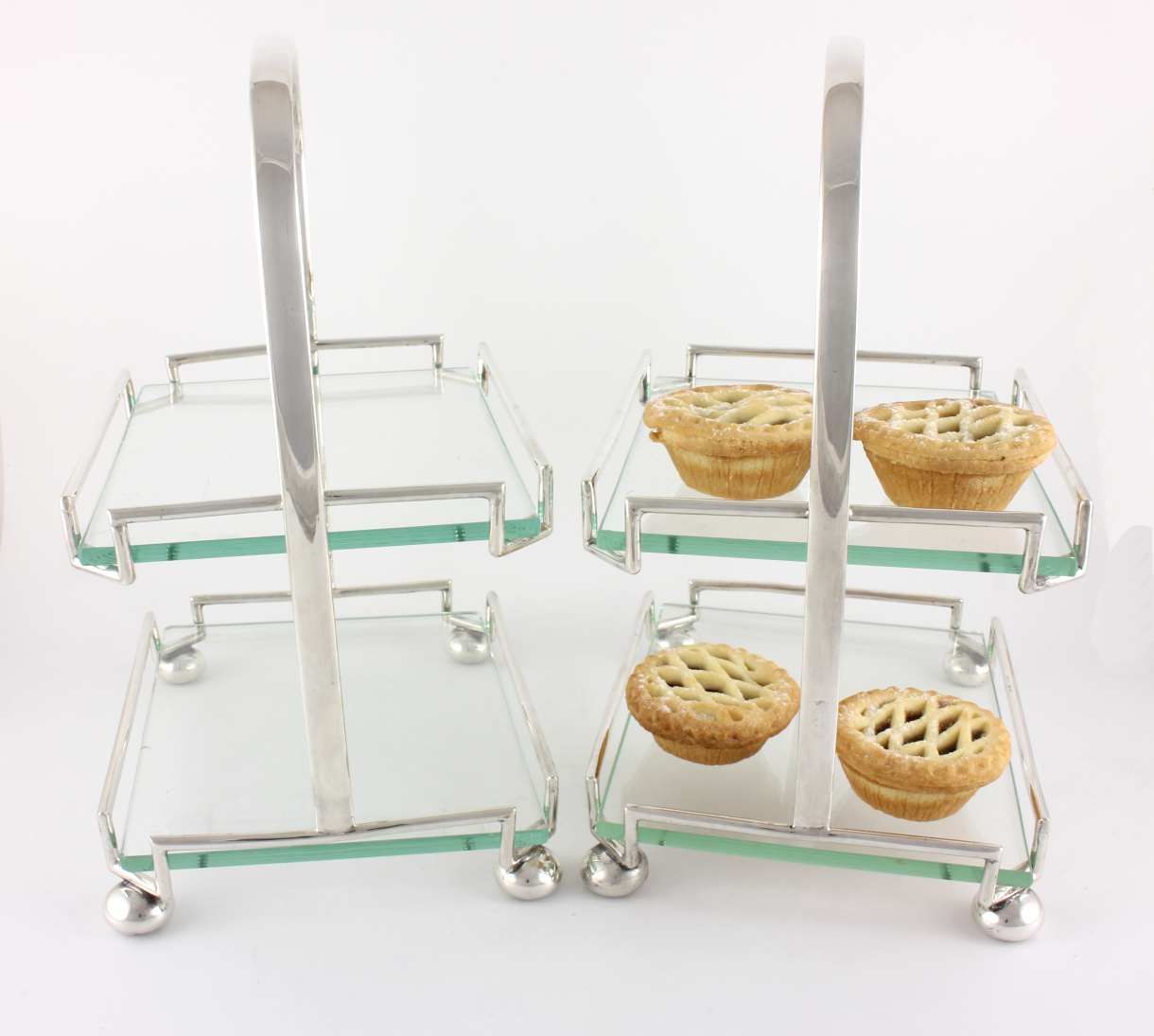 These two quality cake stands which date from the mid 20th century are made of silver plate and come complete with their original thick green tinted glass shelves.