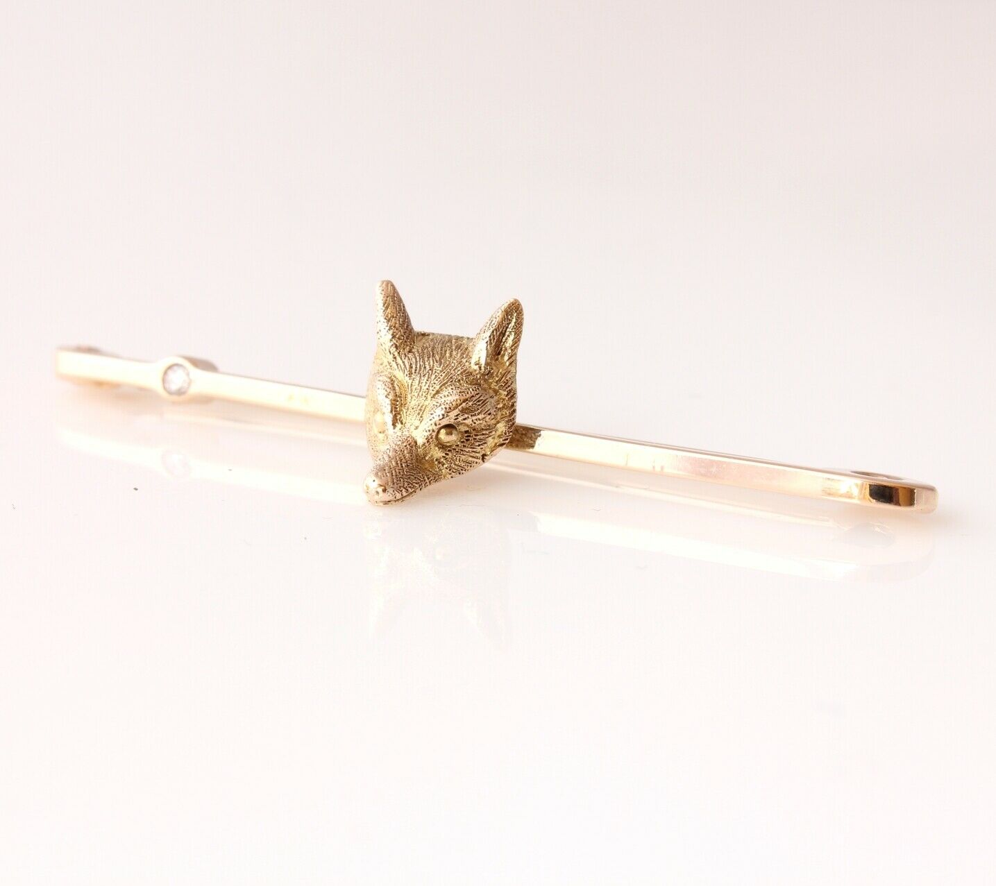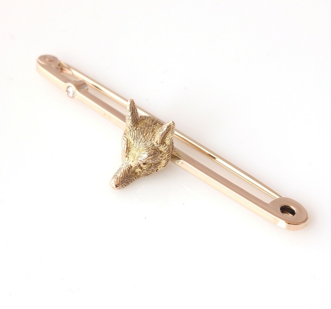 This lovely antique brooch / tie pin is crafted in 9 ct yellow gold and features a handsome fox mask mounted on a gold bar that is set with a clear, sparkly natural diamond.