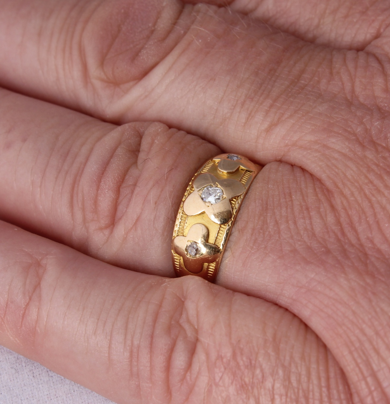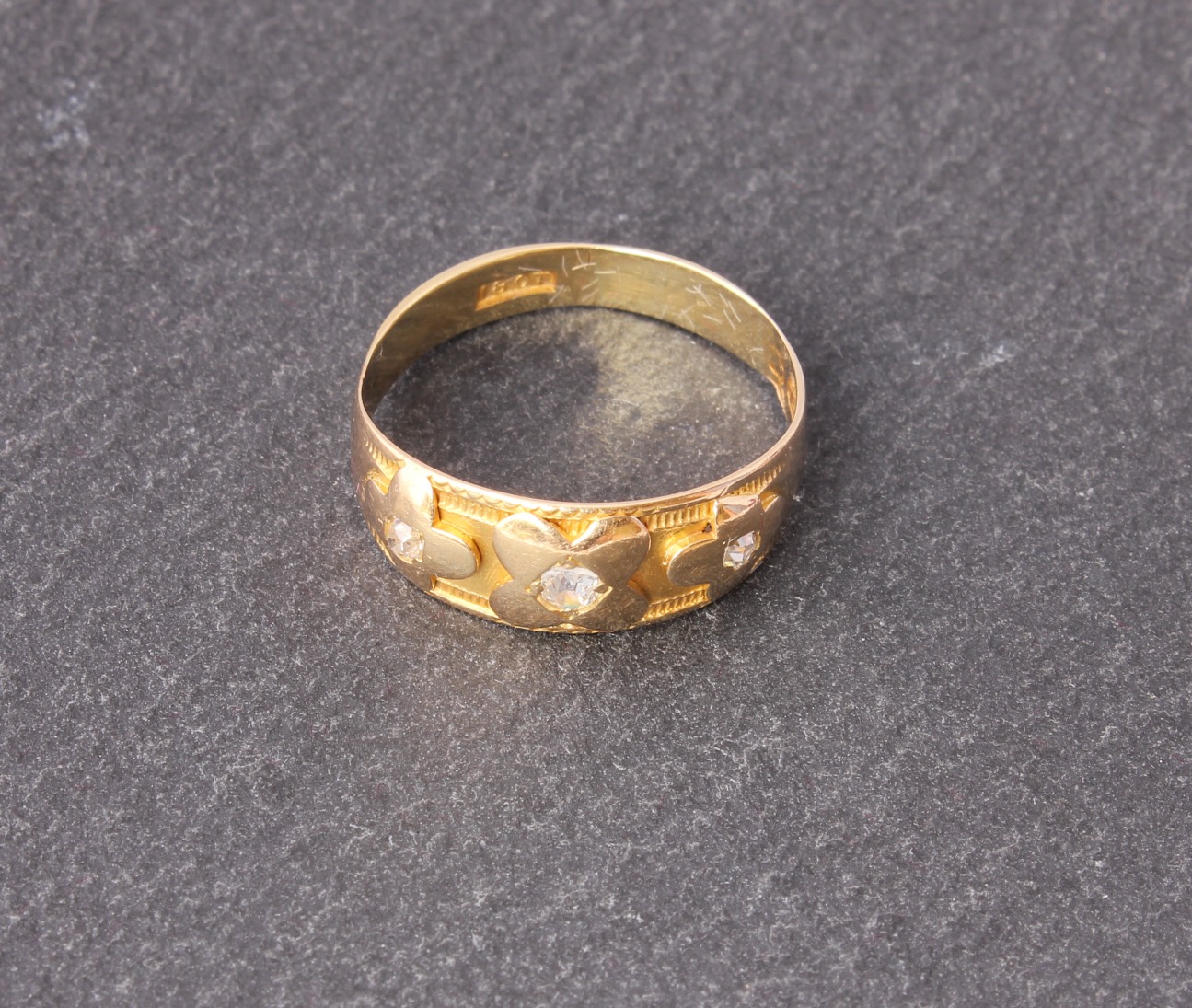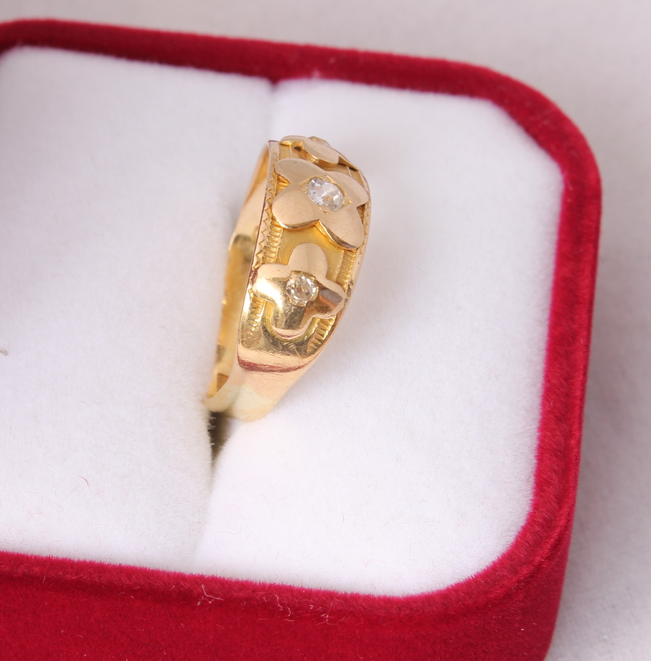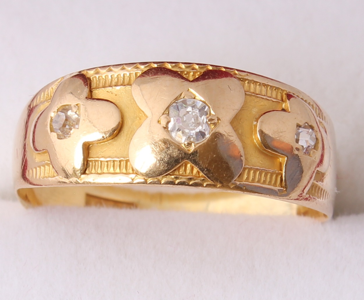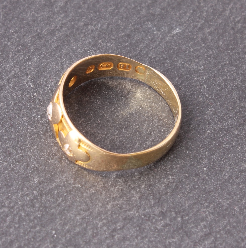 This beautiful antique Gypsy ring is crafted in 18ct gold and is set with three diamonds in a flower shaped design. The ring is fully hallmarked for 18ct gold with the date letter for 1890.