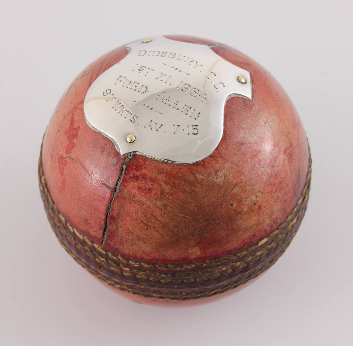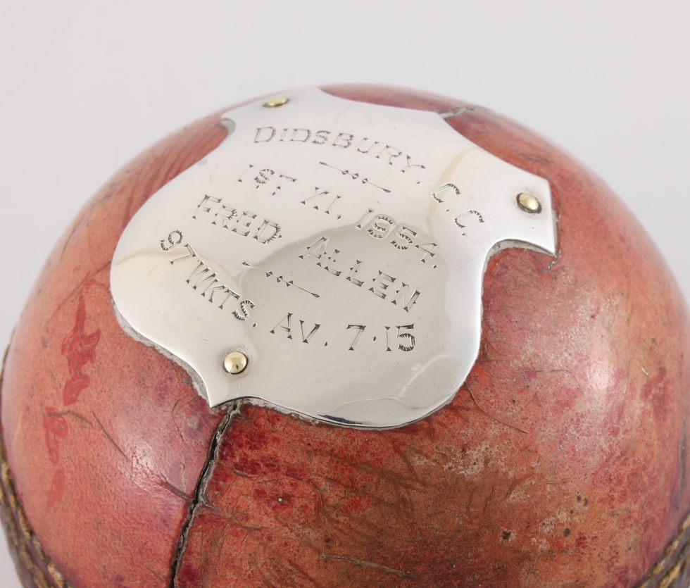 This interesting cricket ball trophy which has a silver coloured plaque is engraved with details of the cricket match it was used in and the shield is engraved with: