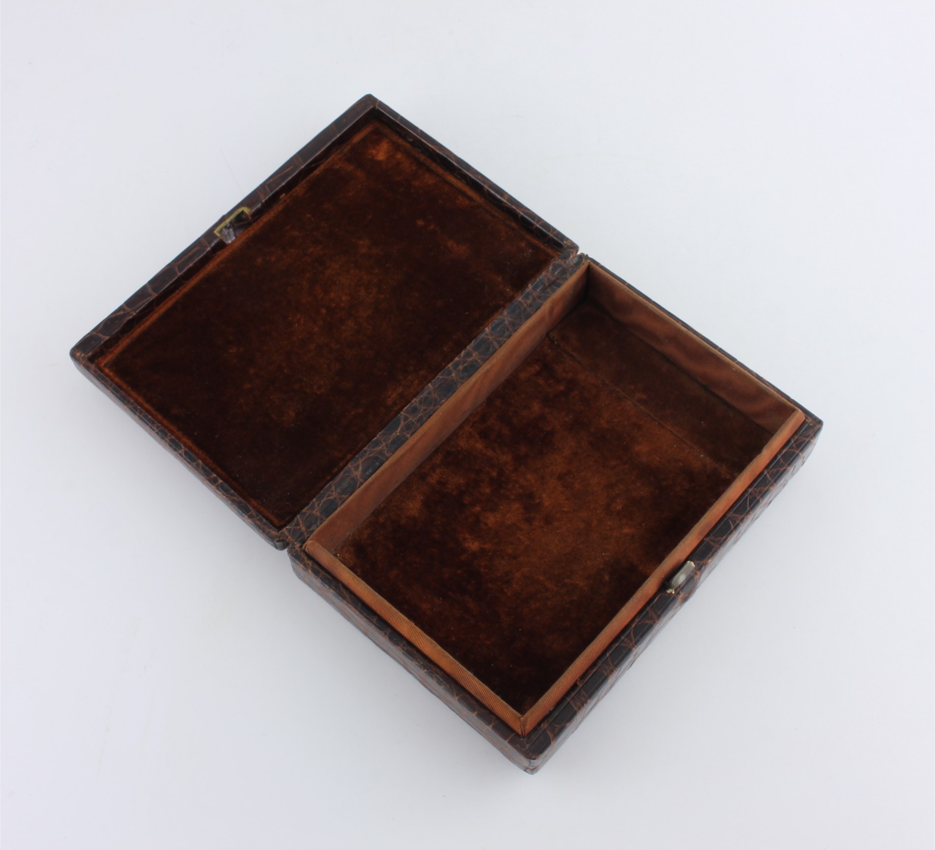 The interior of the box has a brown velvet lining, the underside is embossed in gold with the maker's details and this case has a concealed push button clasp.
