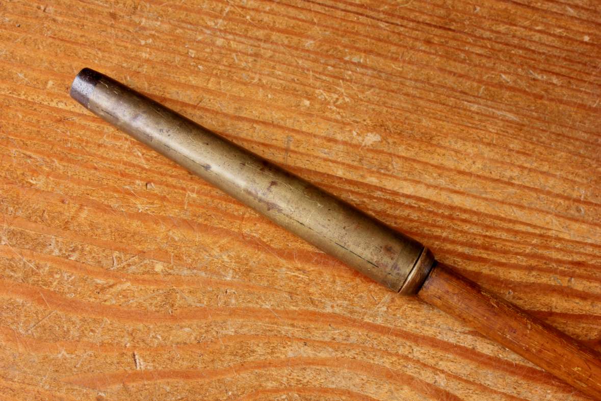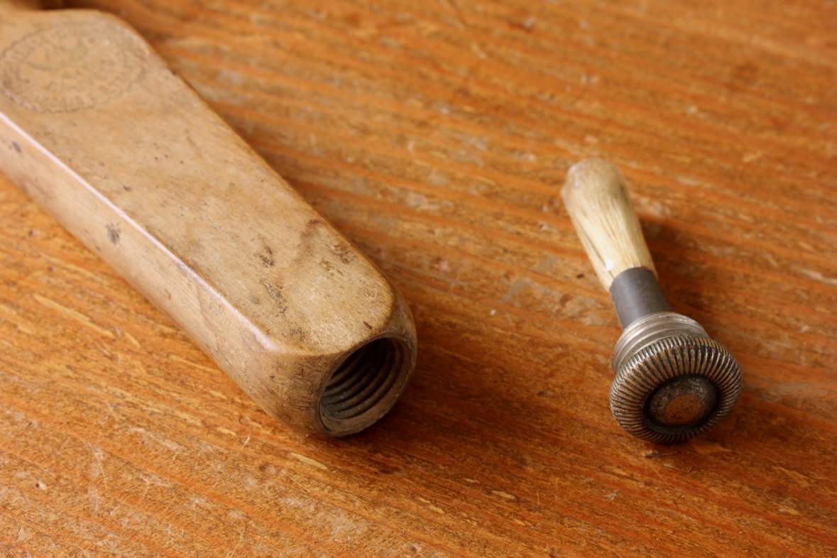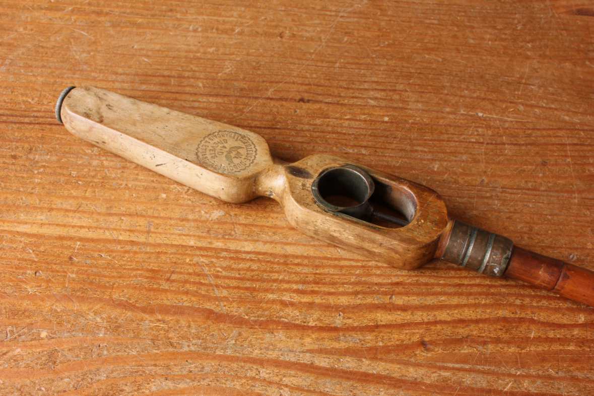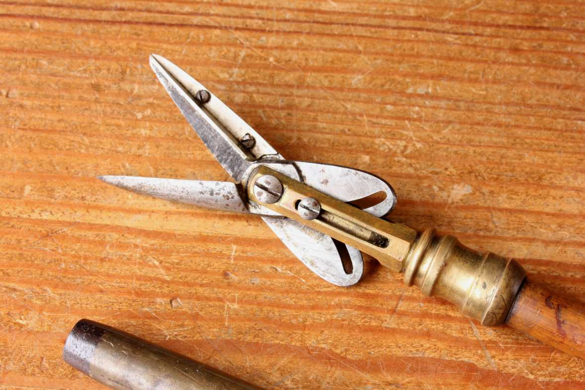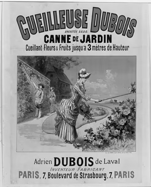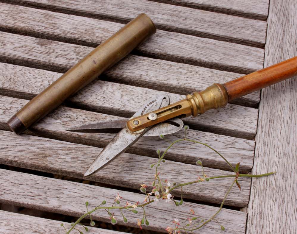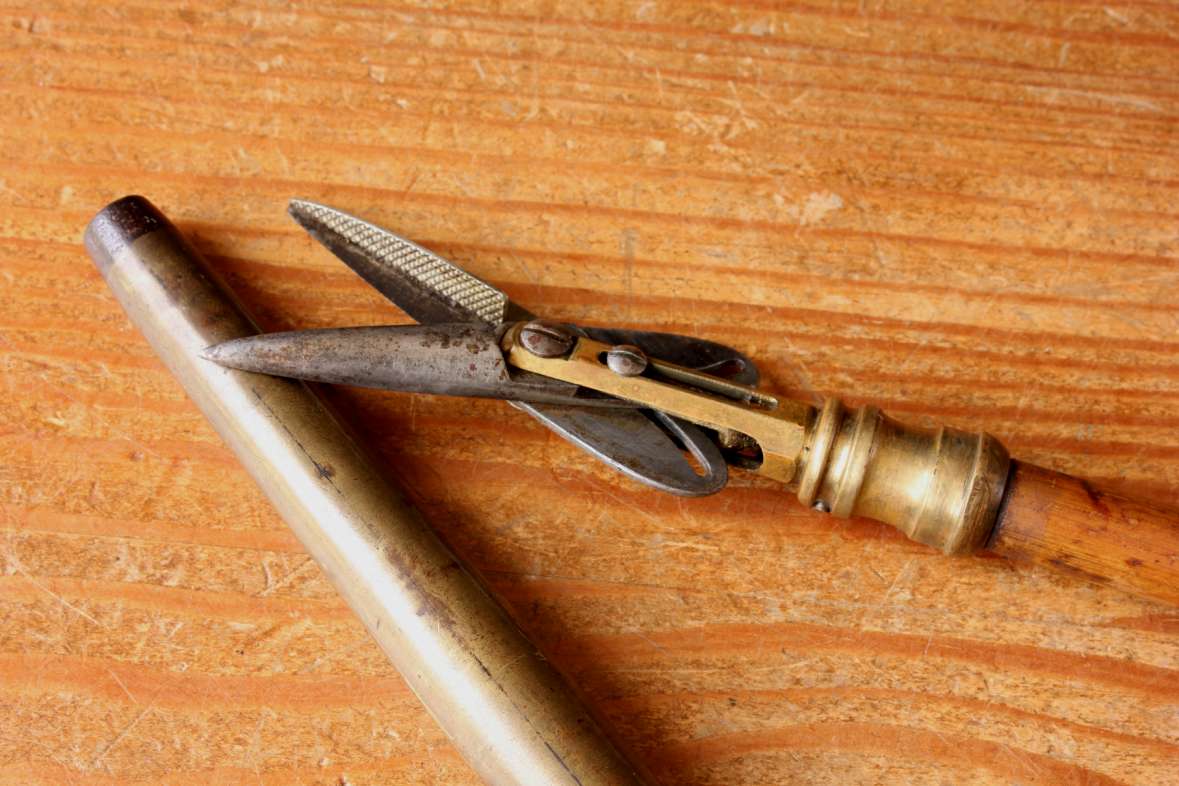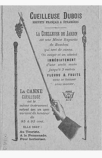 This flower / fruit picker has a fruitwood handle which is marked with Fleurs to one side and Fruit to the other. This handle is fitted with a trigger which when pressed opens and closes the scissors grips at the other end of the cane to cut and hold your required specimen from a high or hard to reach area, remove buds or can also be used to remove caterpillar nests in high places. This is also embossed with the inventor and maker's details for Adrien Dubois and the Patent mark.