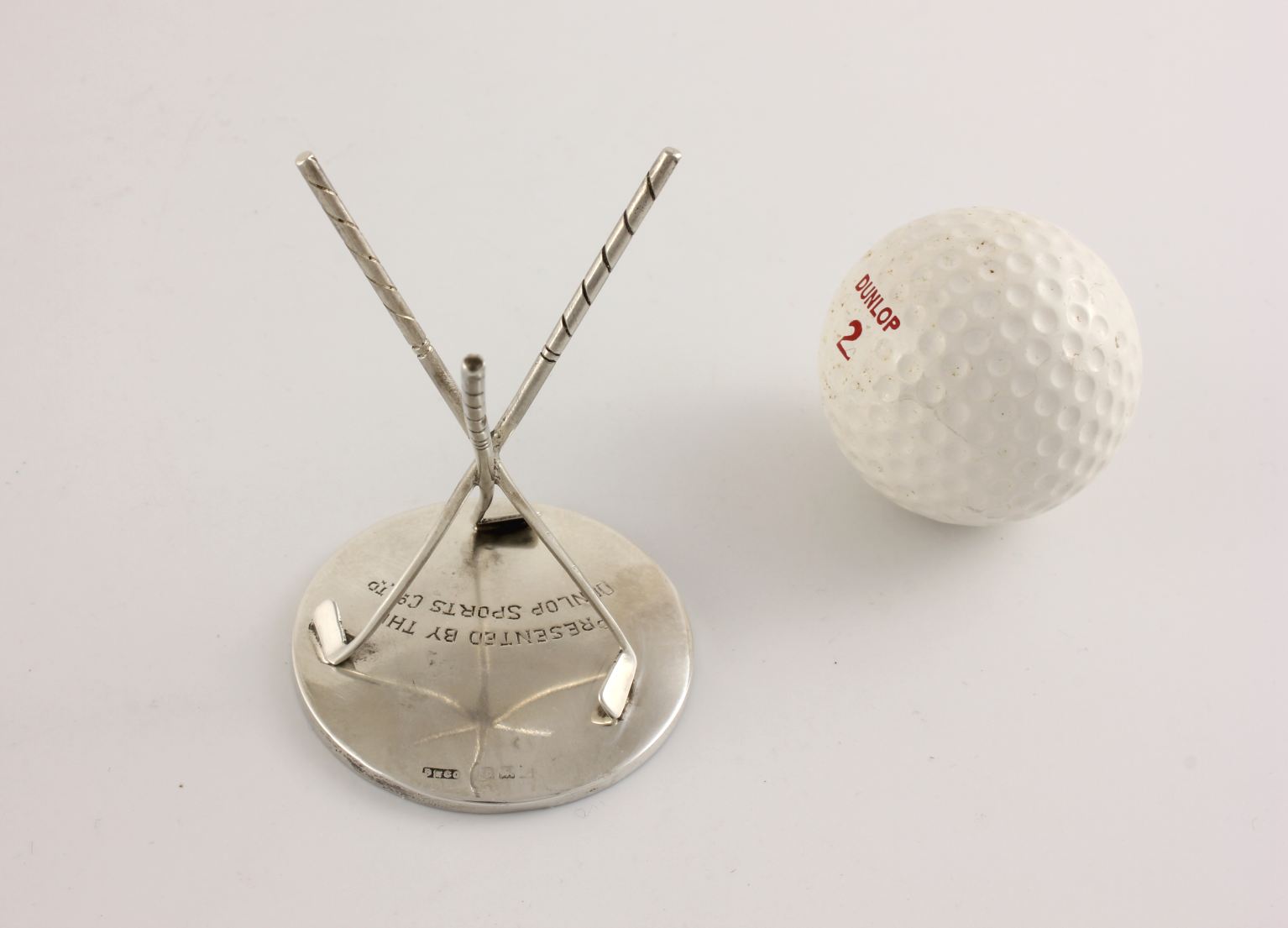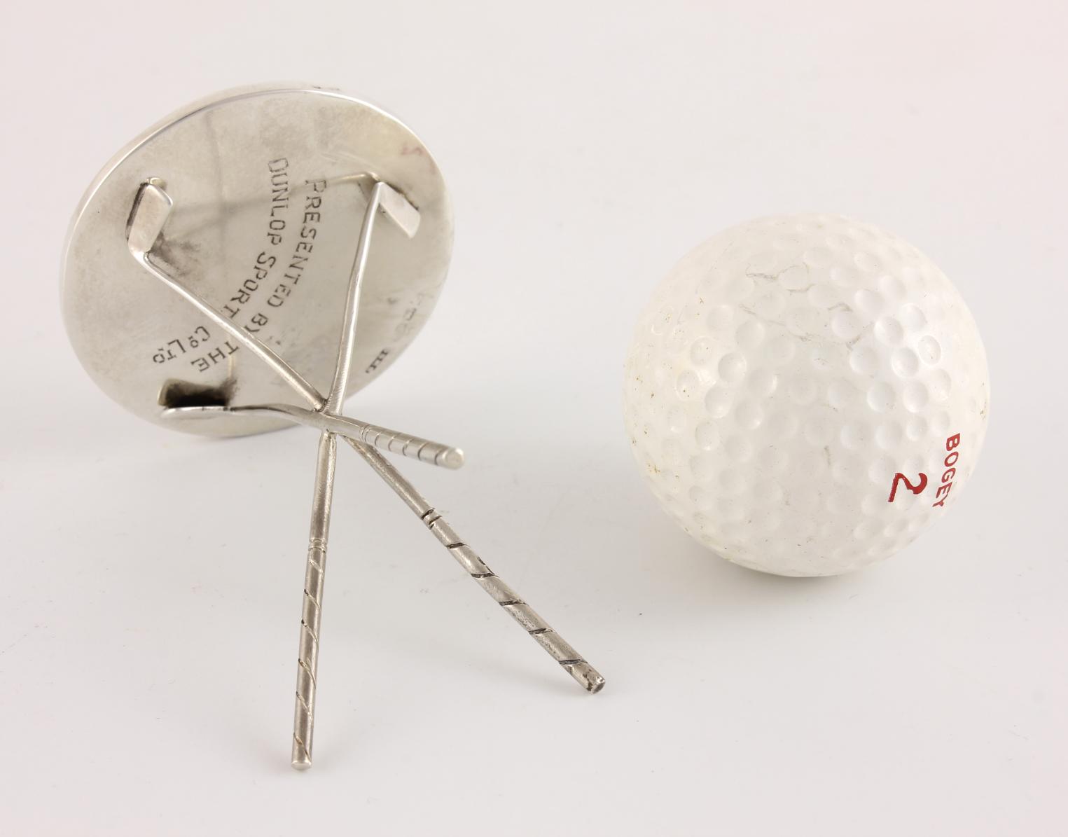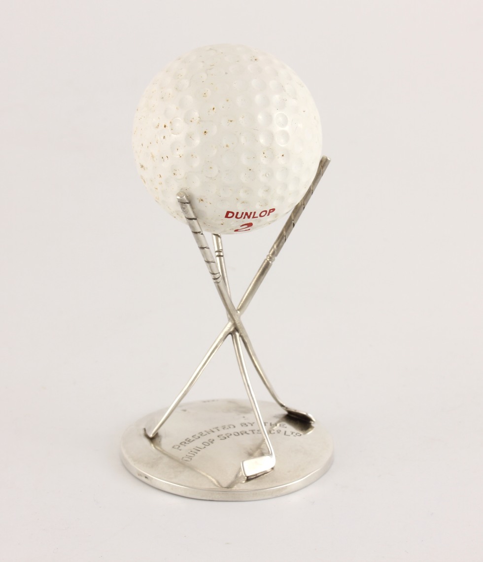 This charming Dunlop Hole In One trophy which is made of solid silver, features three crossed golf clubs that hold the golf ball and is fully hallmarked for Birmingham 1927.