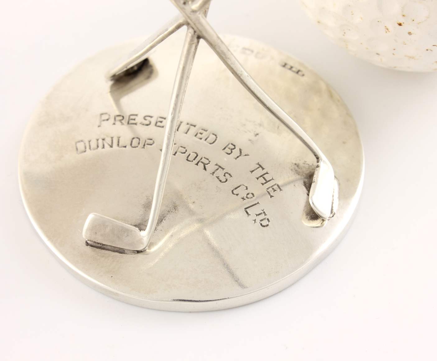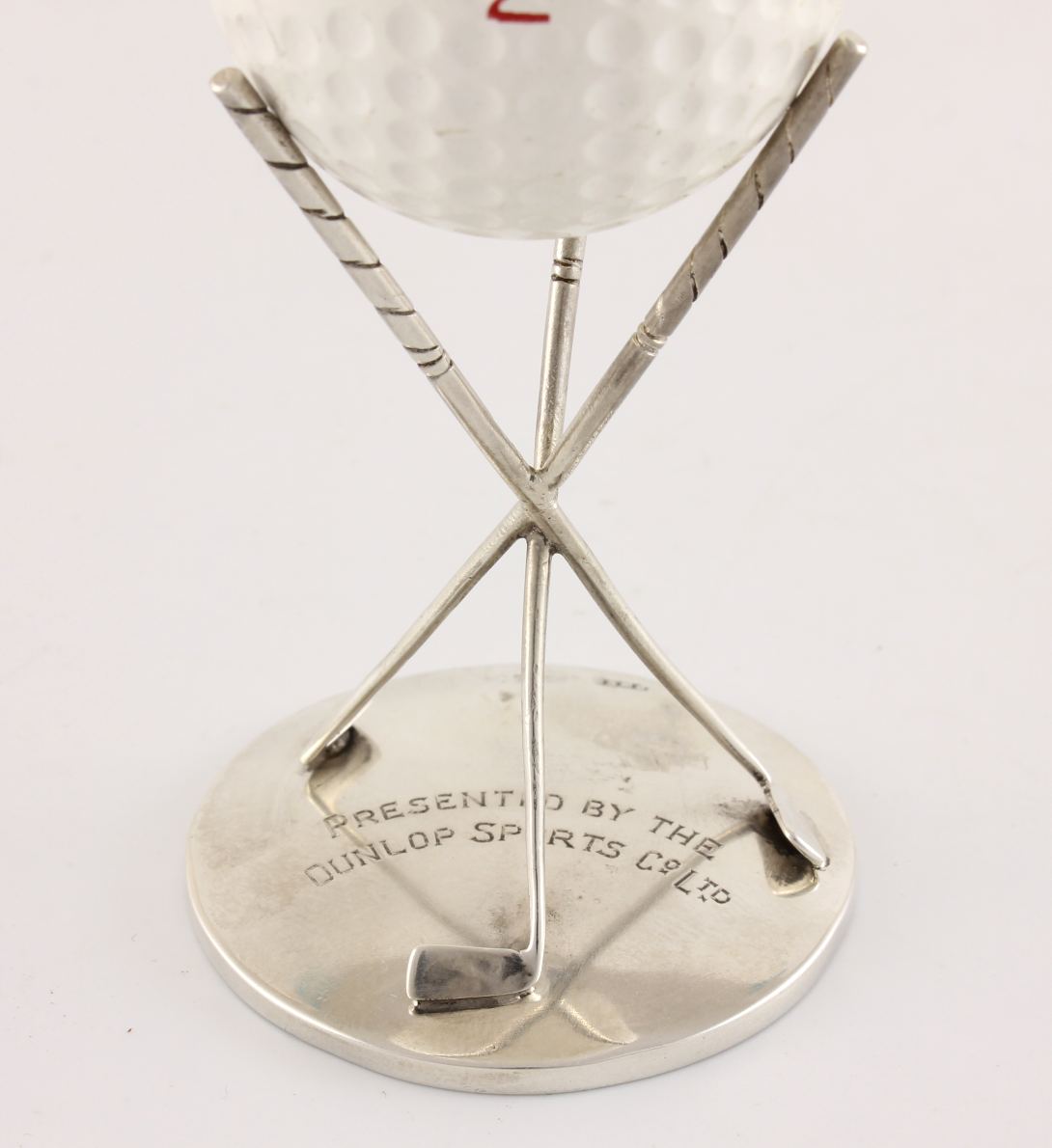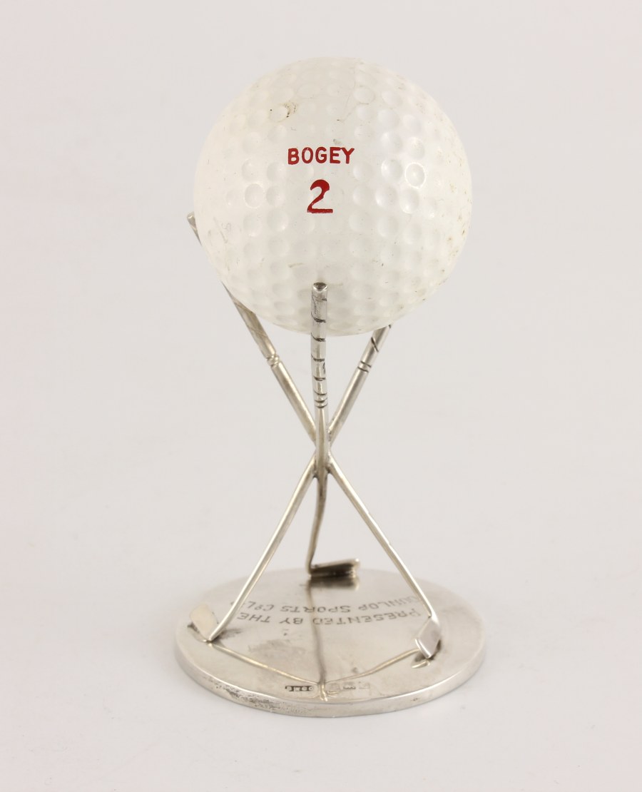 This charming Dunlop Hole In One trophy which is made of solid silver, features three crossed golf clubs that hold the golf ball and is fully hallmarked for Birmingham 1927.