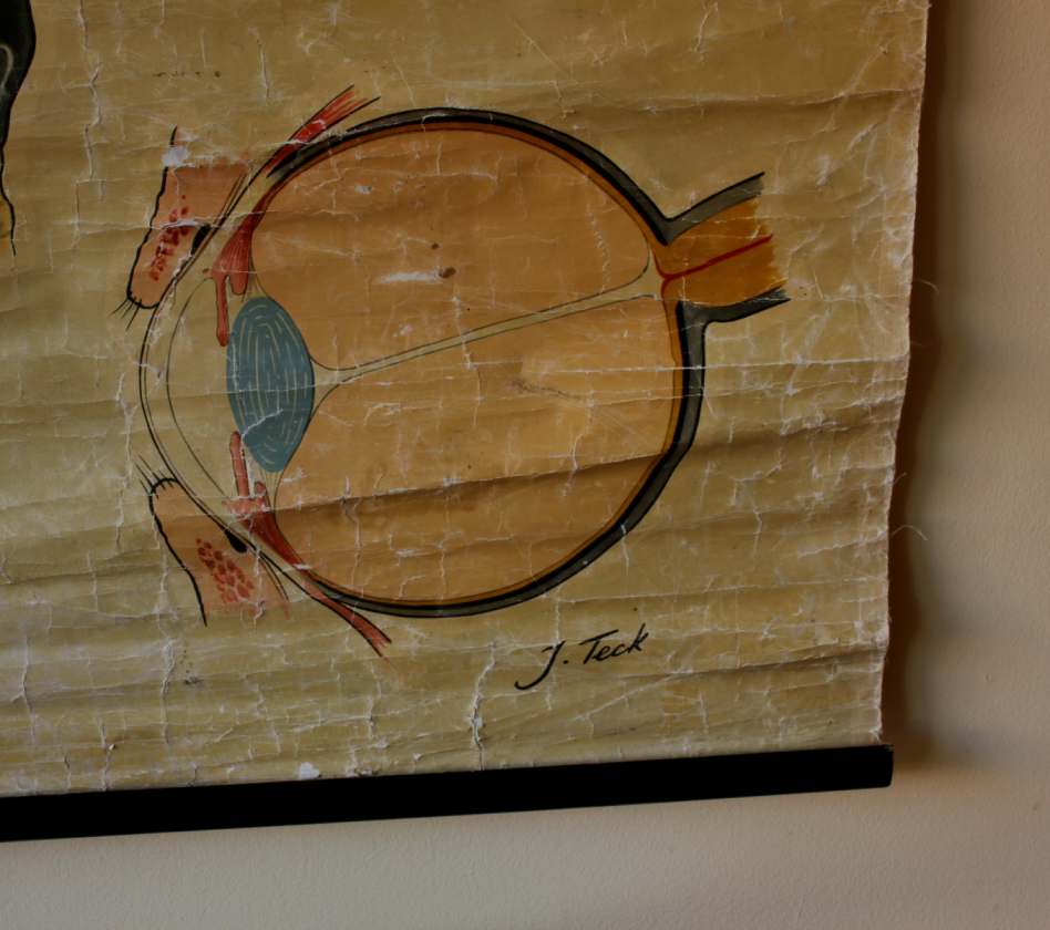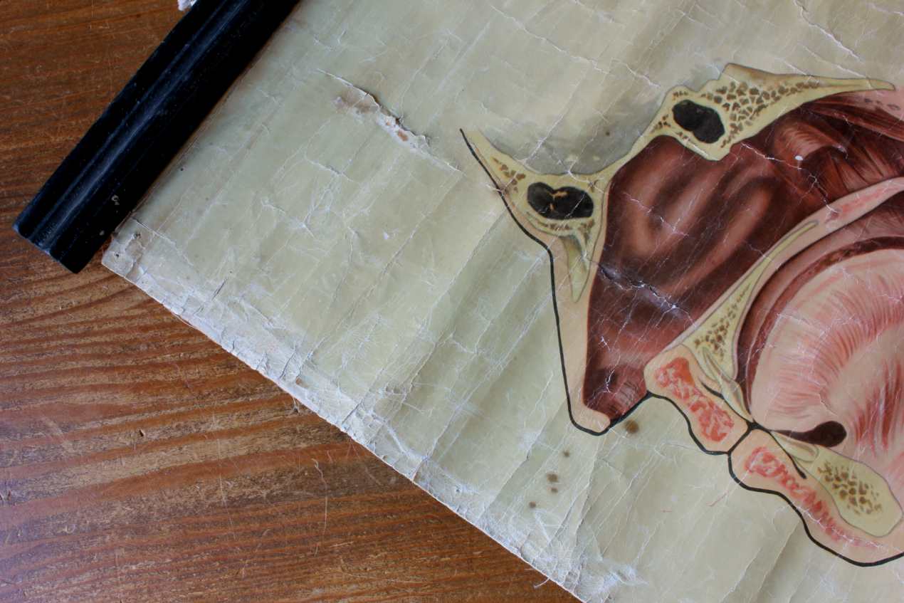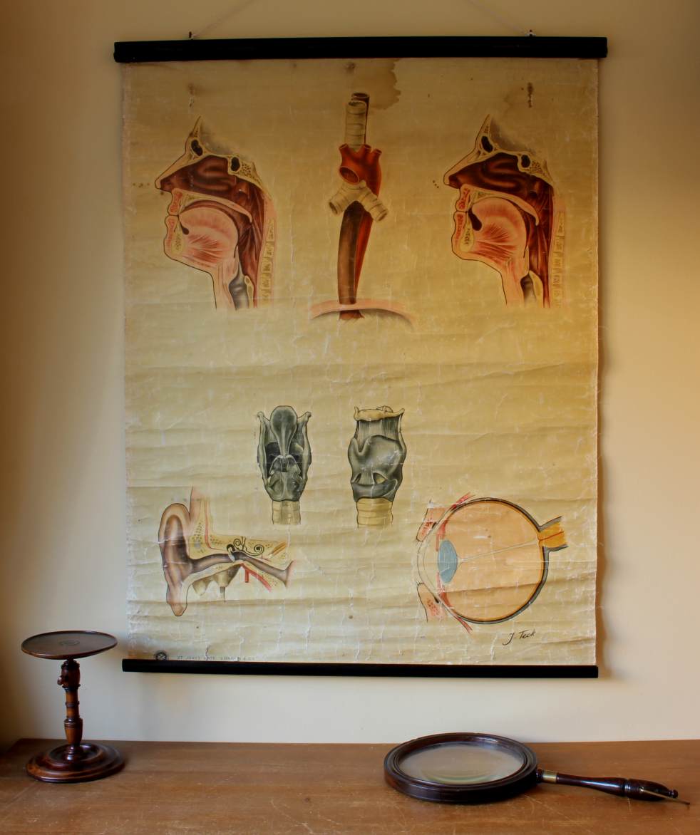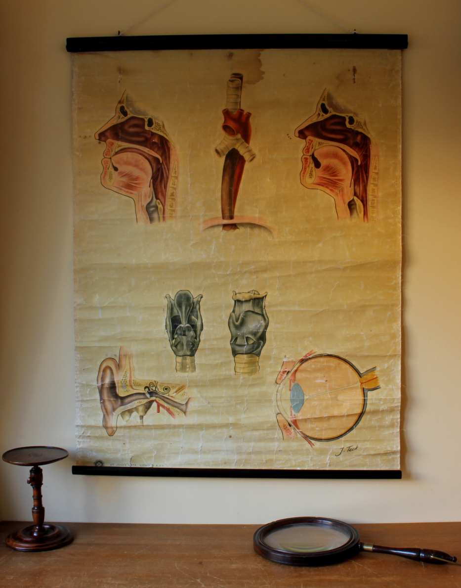This vintage St John Ambulance wall chart shows the ears, nose and throat in nice detail and has lots of age related wear which gives it a great decorative look.