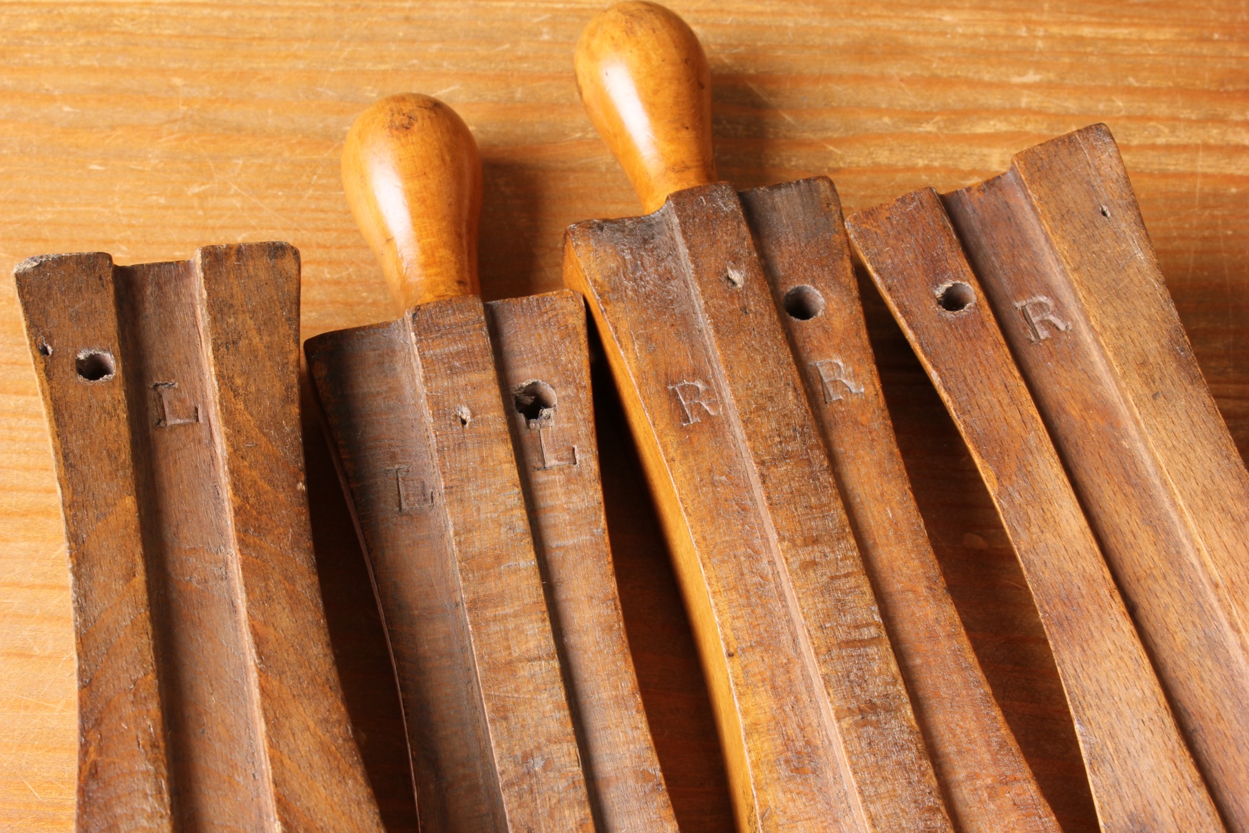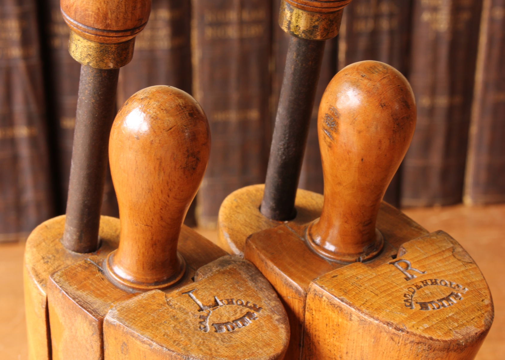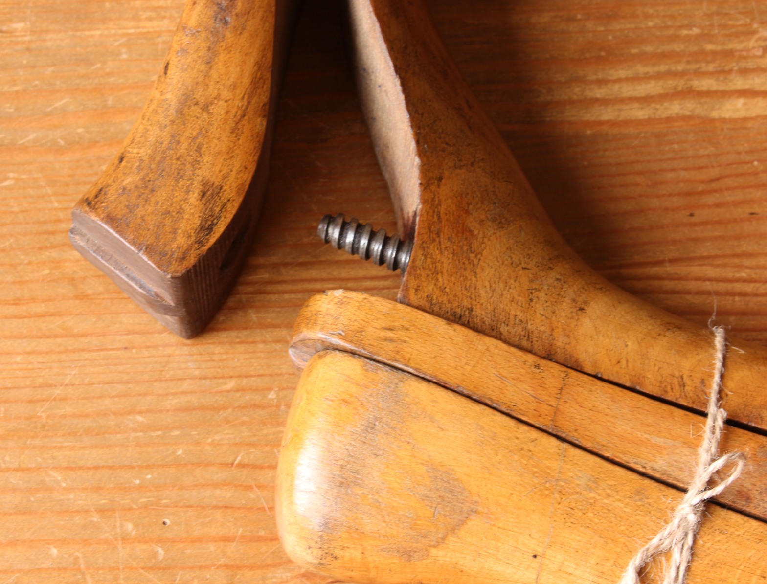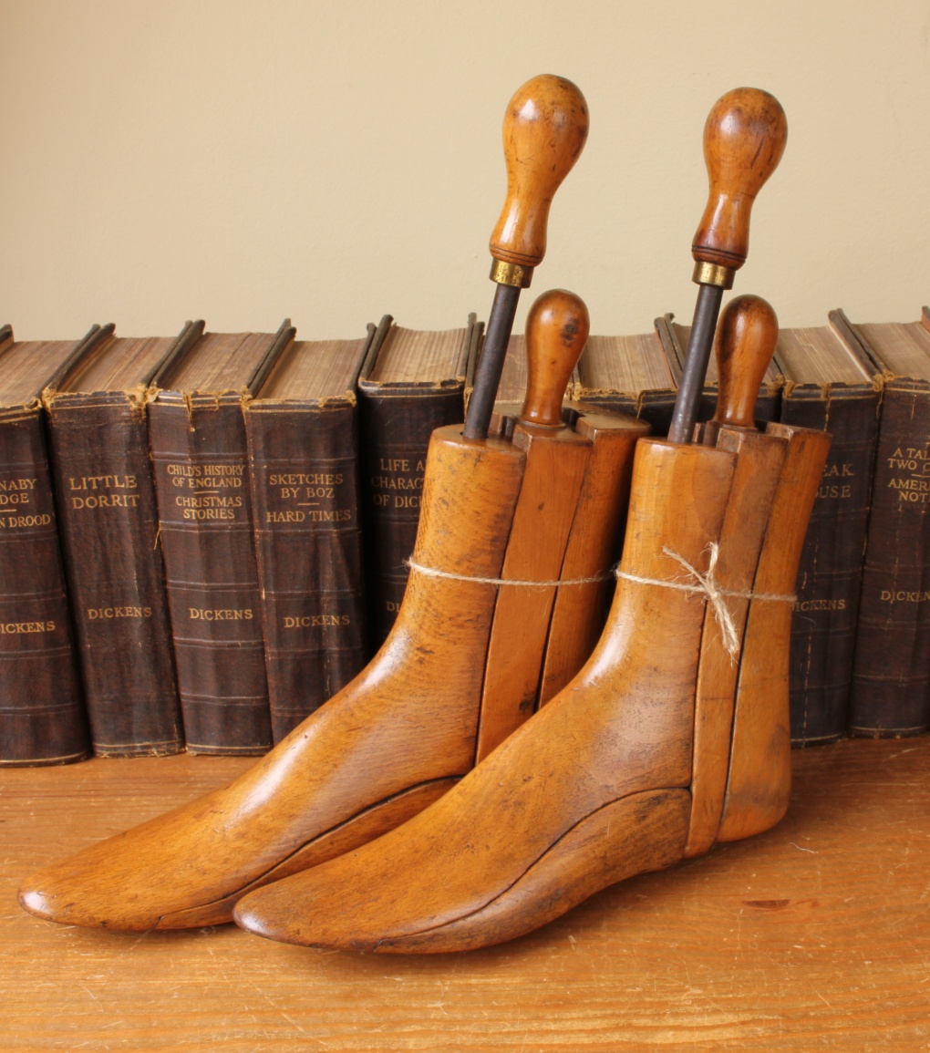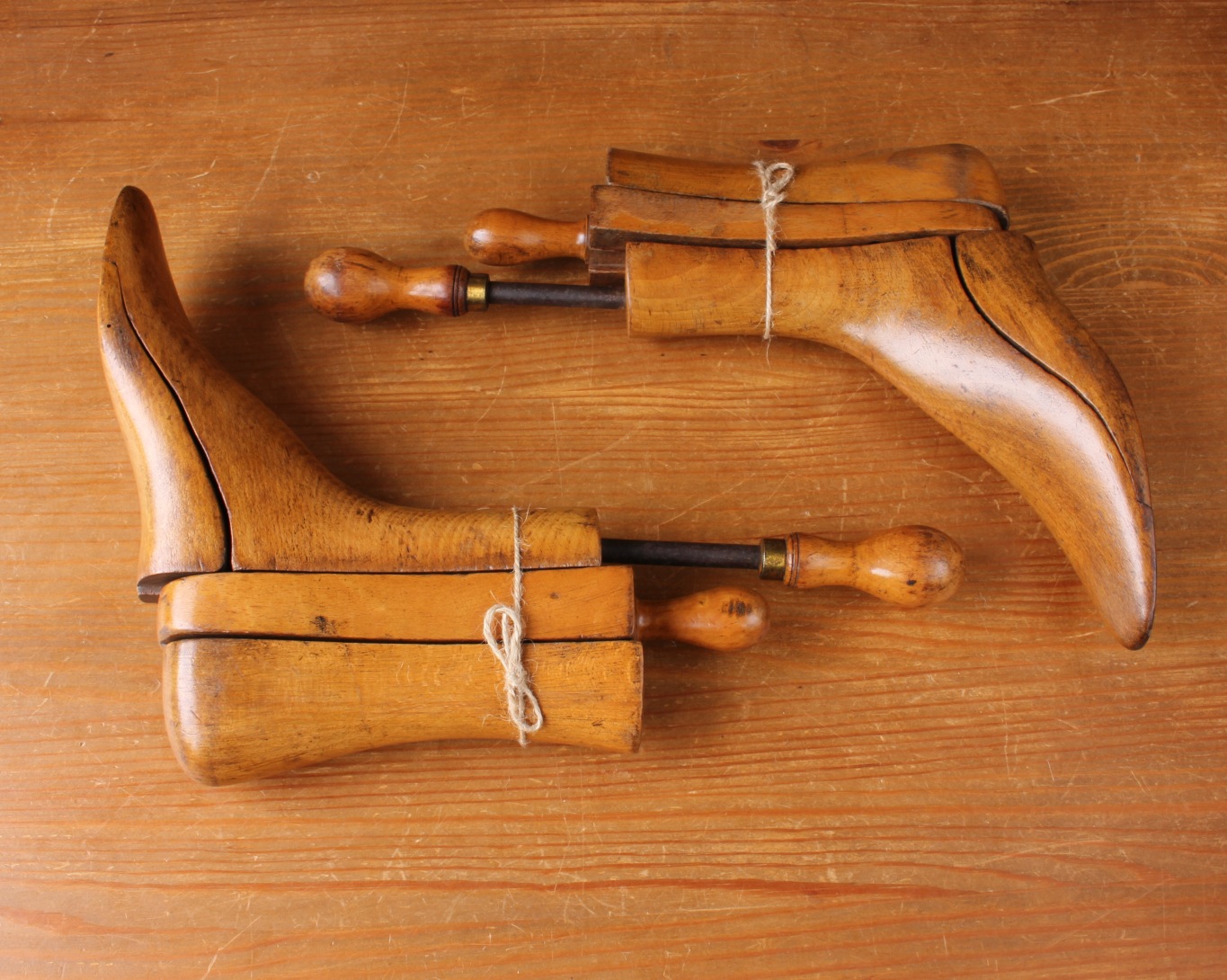 This stunning pair of antique wooden boot lasts which come in 3 parts to each foot - the heel, front and middle have an adjustable hinged bottom section that moves up and down by screwing the top bar. This helps the last slip into the boot easier and then tightens.