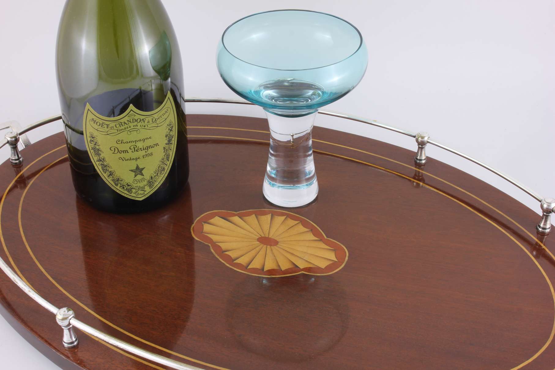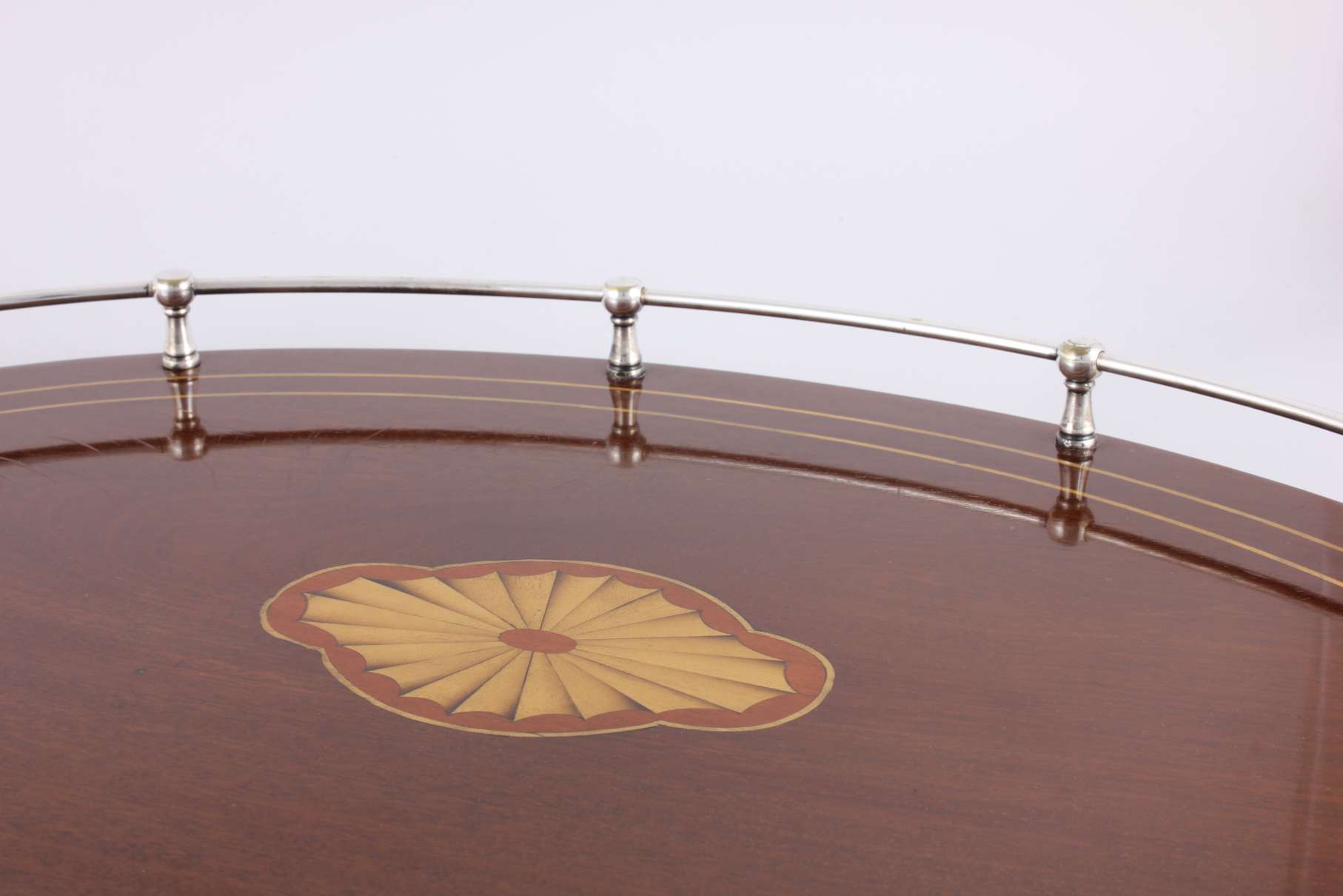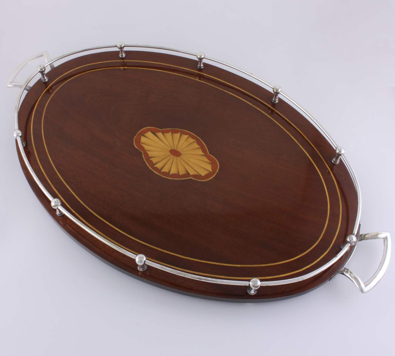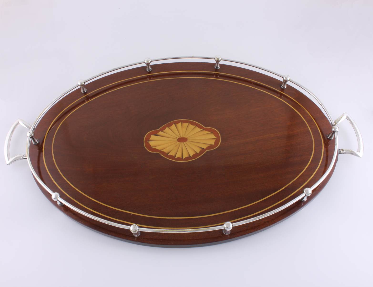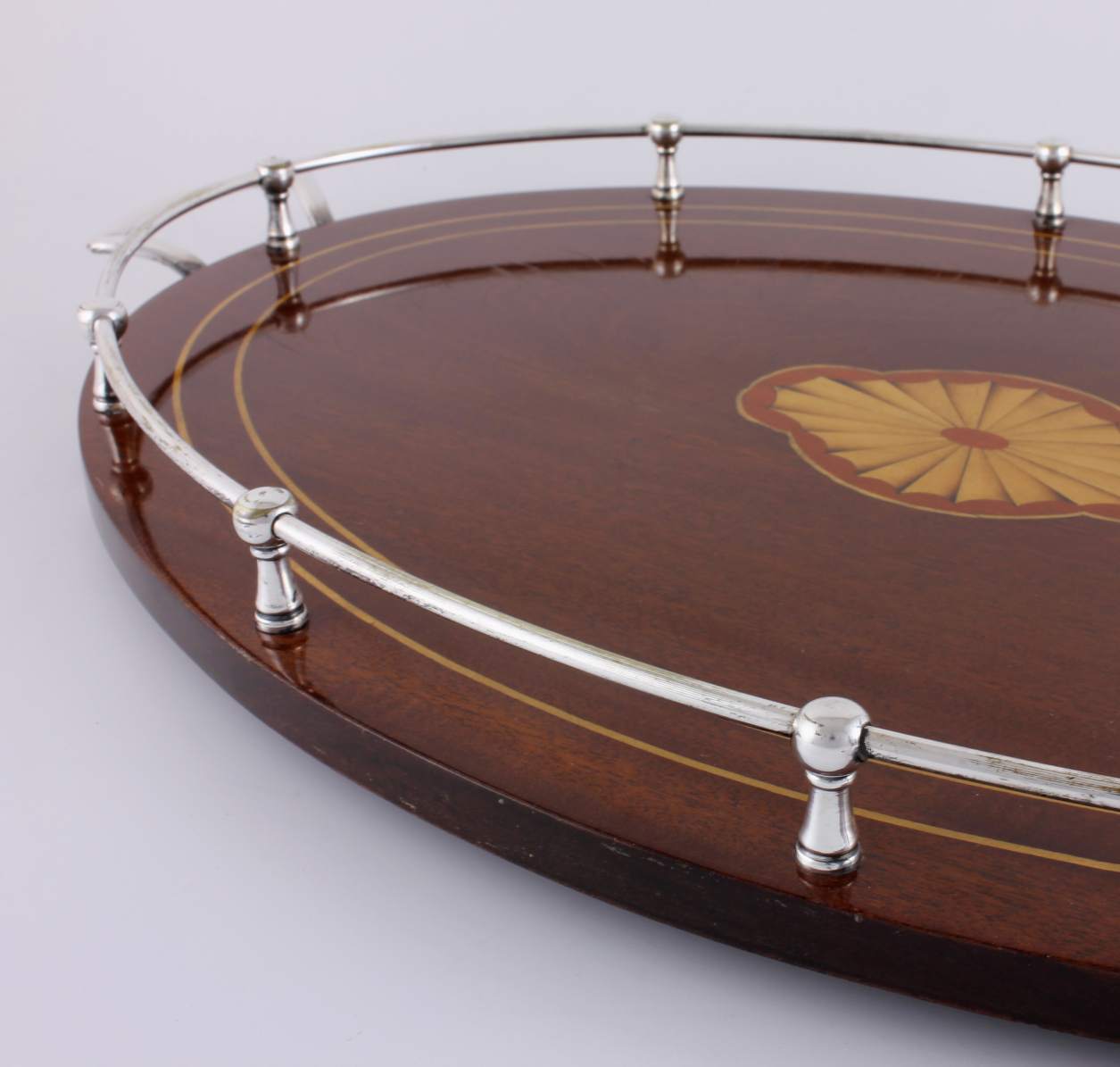 This oval gallery tray which is made of a dark wood has a central shell inlay design, silver plated gallery, ball feet and handles.