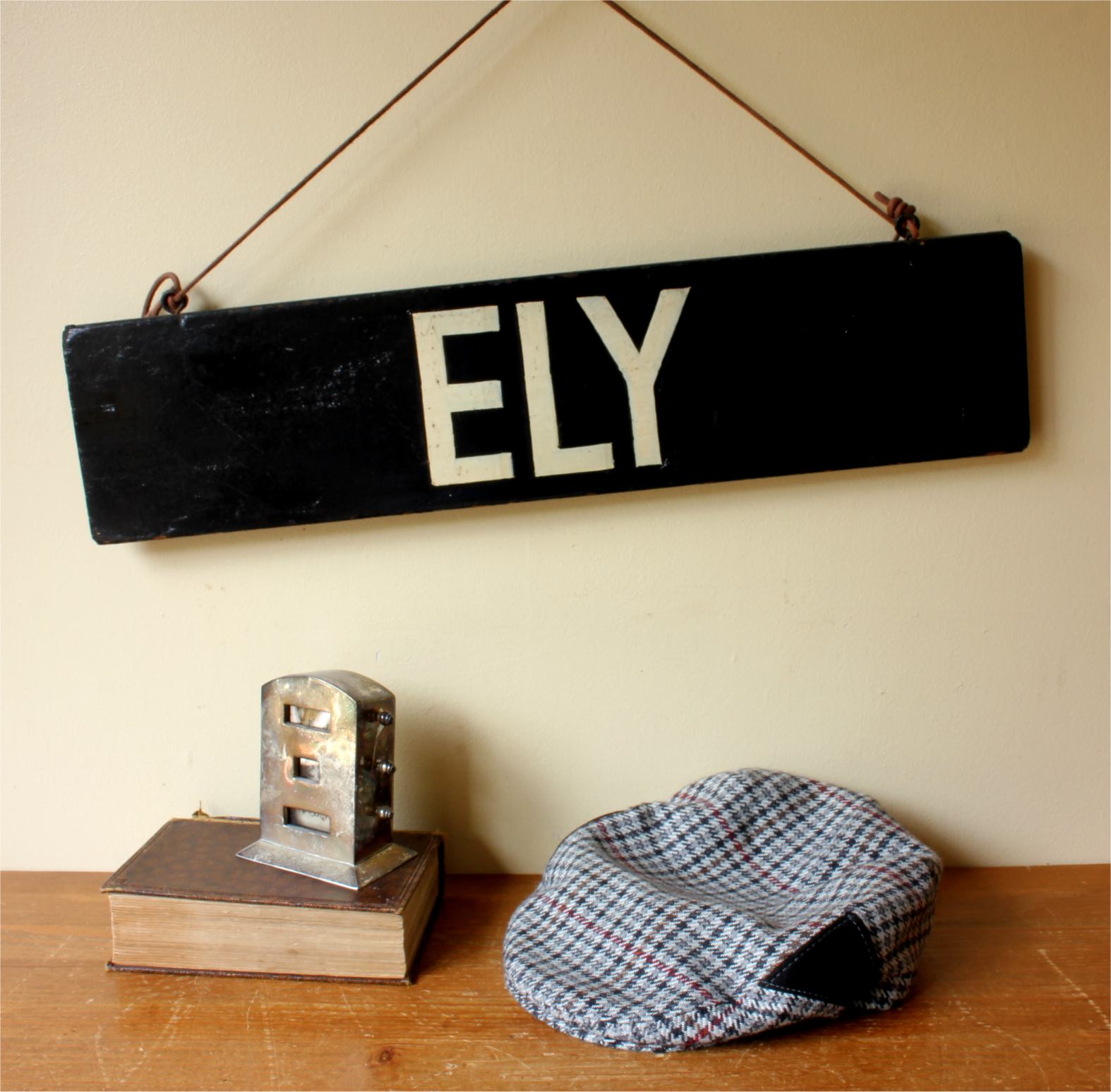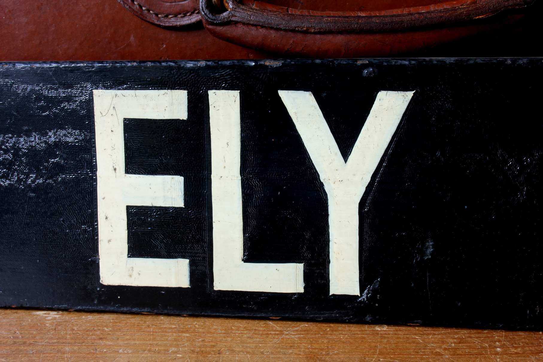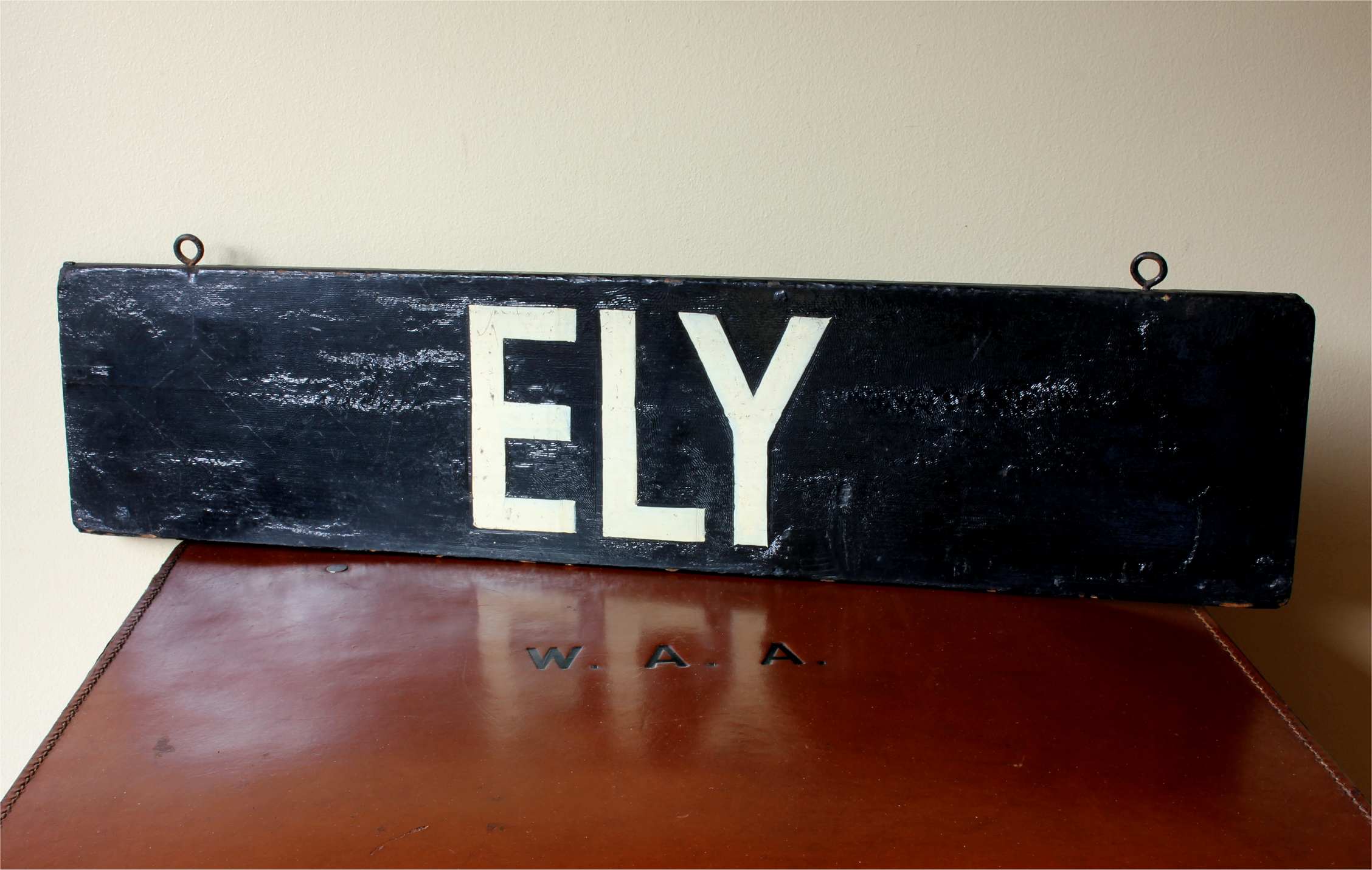 This original train station sign which dates from around the 1930's came from Liverpool Street Station, is made of wood and has a black background with the name of the destination station Ely in hand painted lettering to one side.