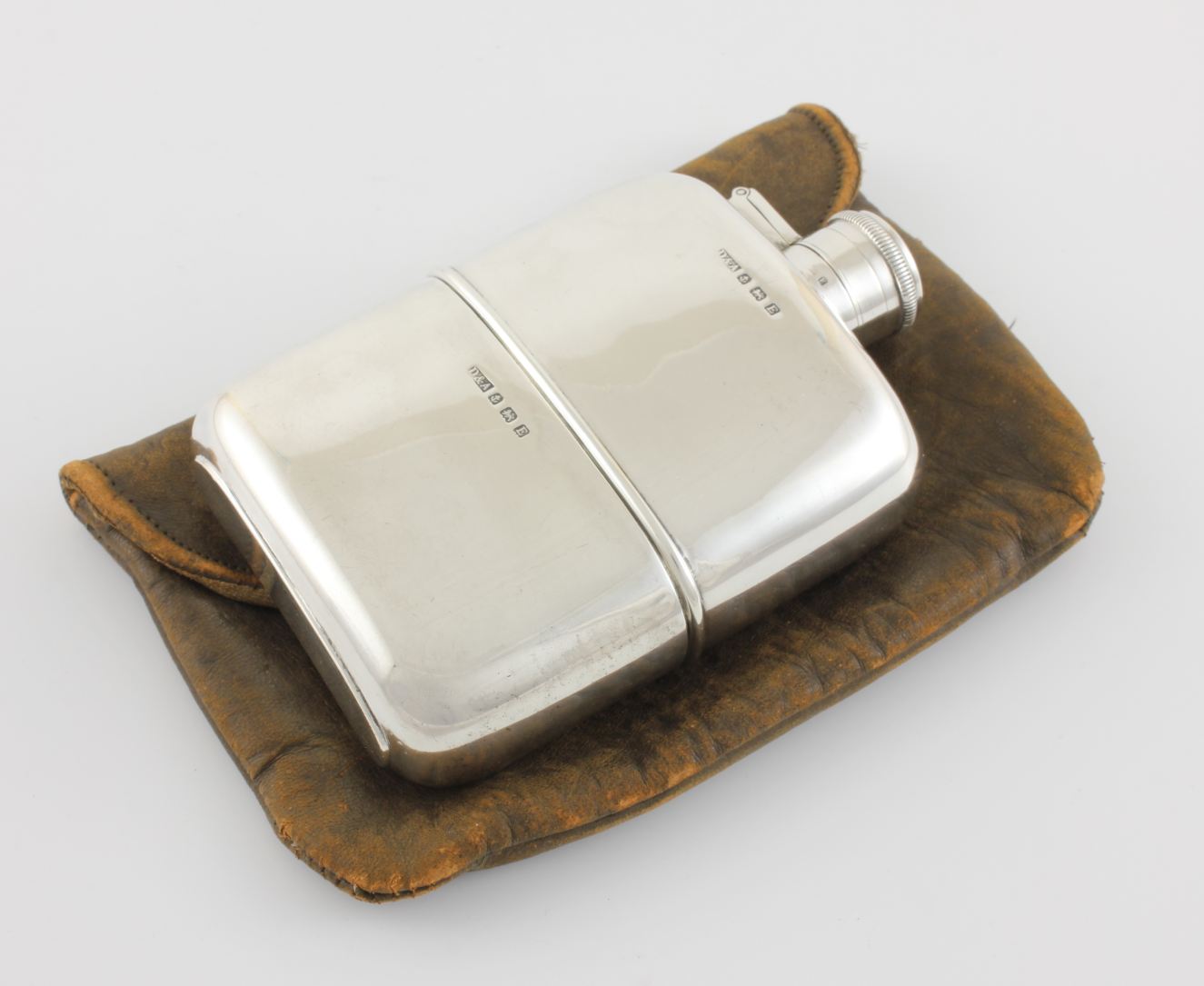 This flask has a detachable silver cup which is gilt lined, a hinged flip / bayonet top which is tight and seals well so does not leak and the flask comes in a charming leather pouch which is marked to the front with En Route.