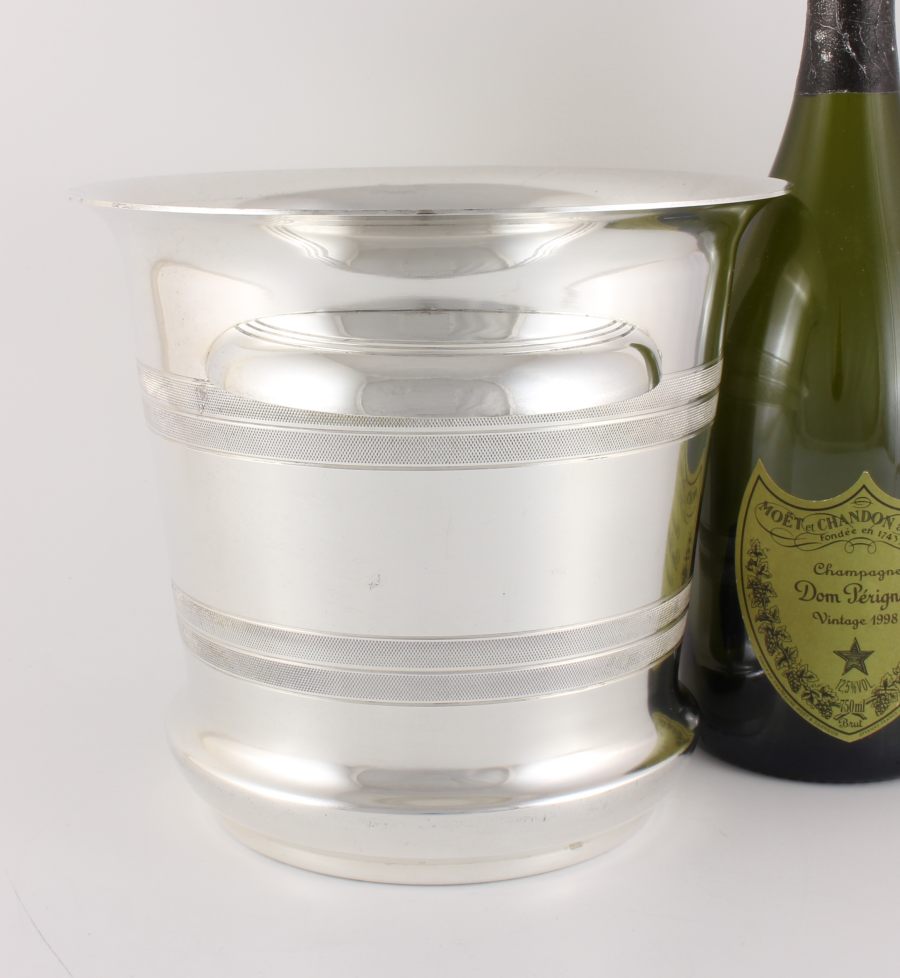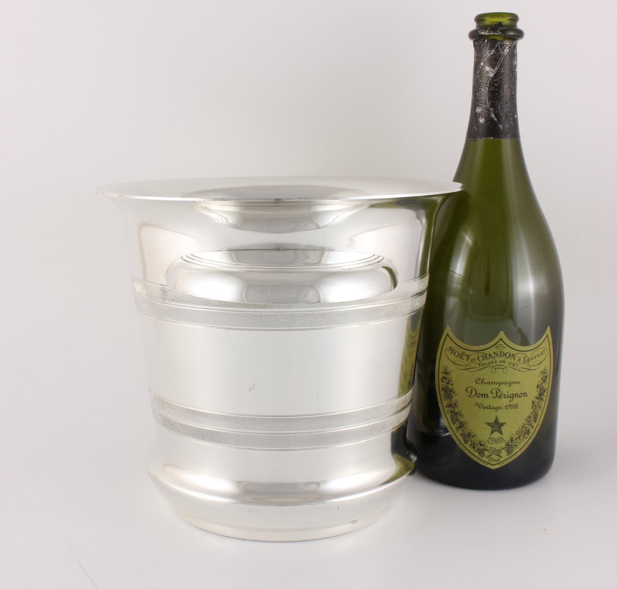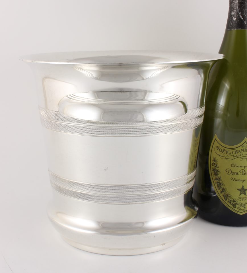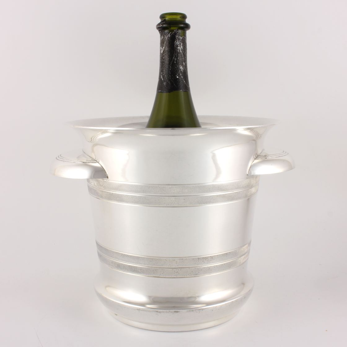 This handsome Art Deco silver plated French wine or Champagne cooler which dates from the first half of the 20th century features banded engine turning to the body and is marked to the base with the Maker's mark.