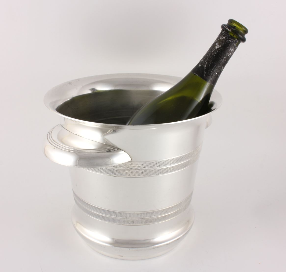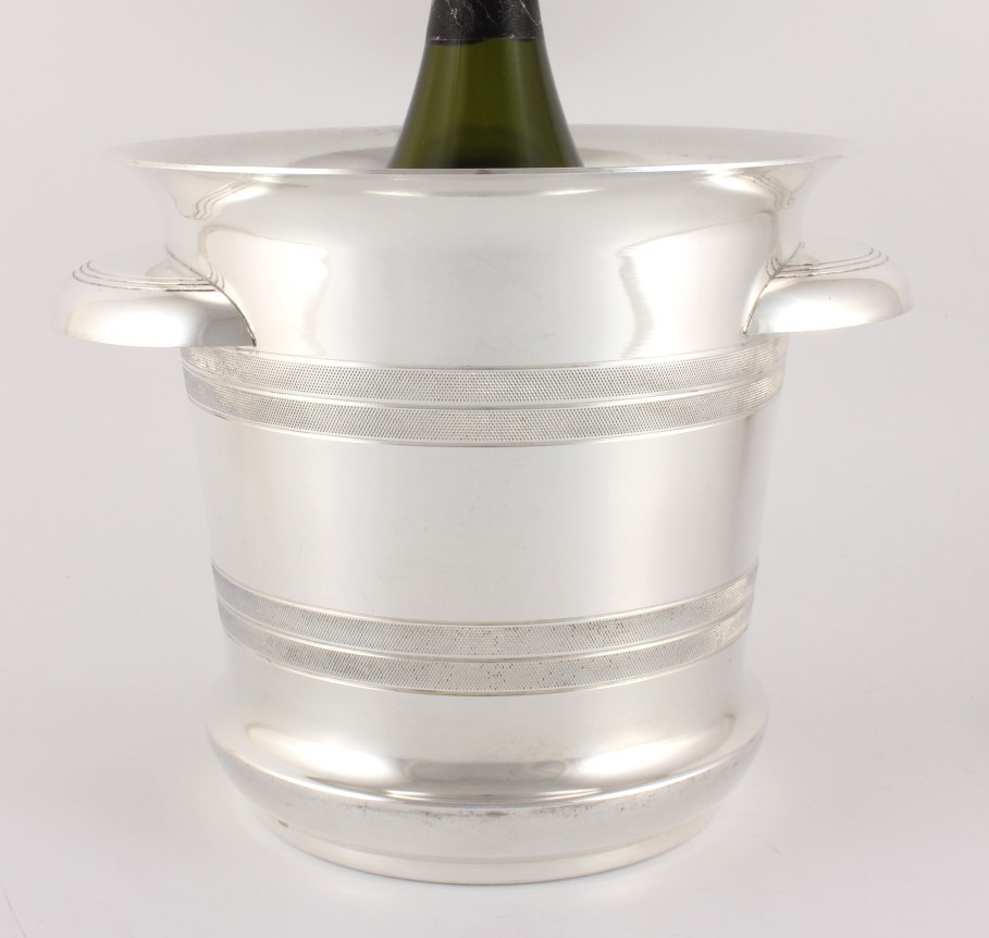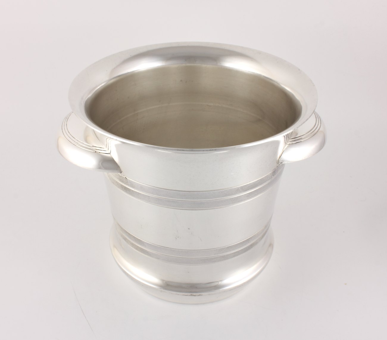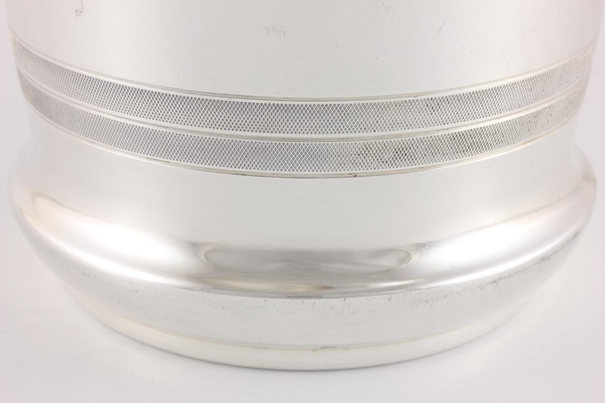 This handsome Art Deco silver plated French wine or Champagne cooler which dates from the first half of the 20th century features banded engine turning to the body and is marked to the base with the Maker's mark.