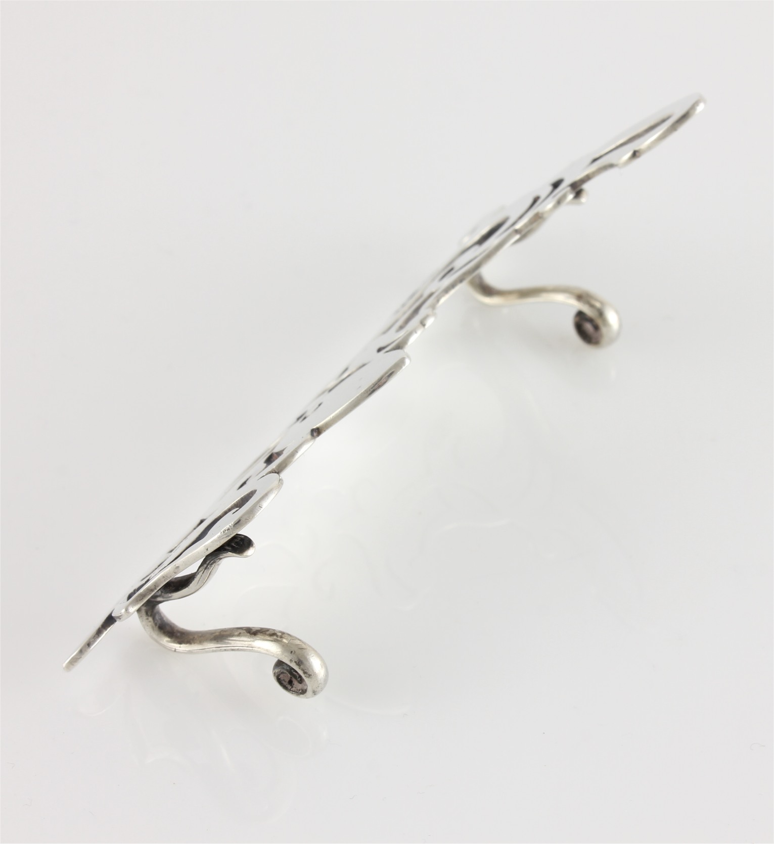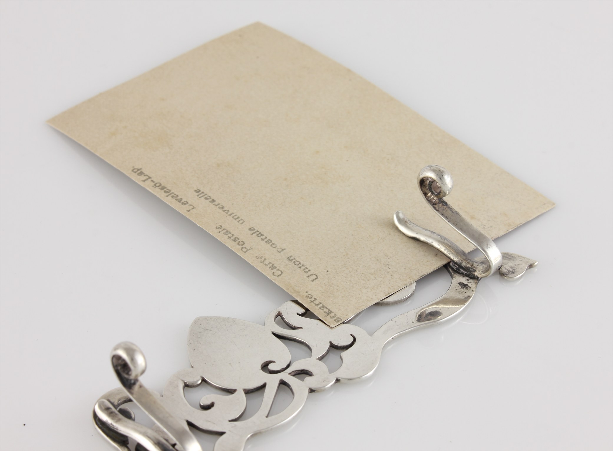 This stylish silver menu holder which is very nice quality was made by Charles Edwards, London in 1907 and has a fancy design with two clips to the reverse.