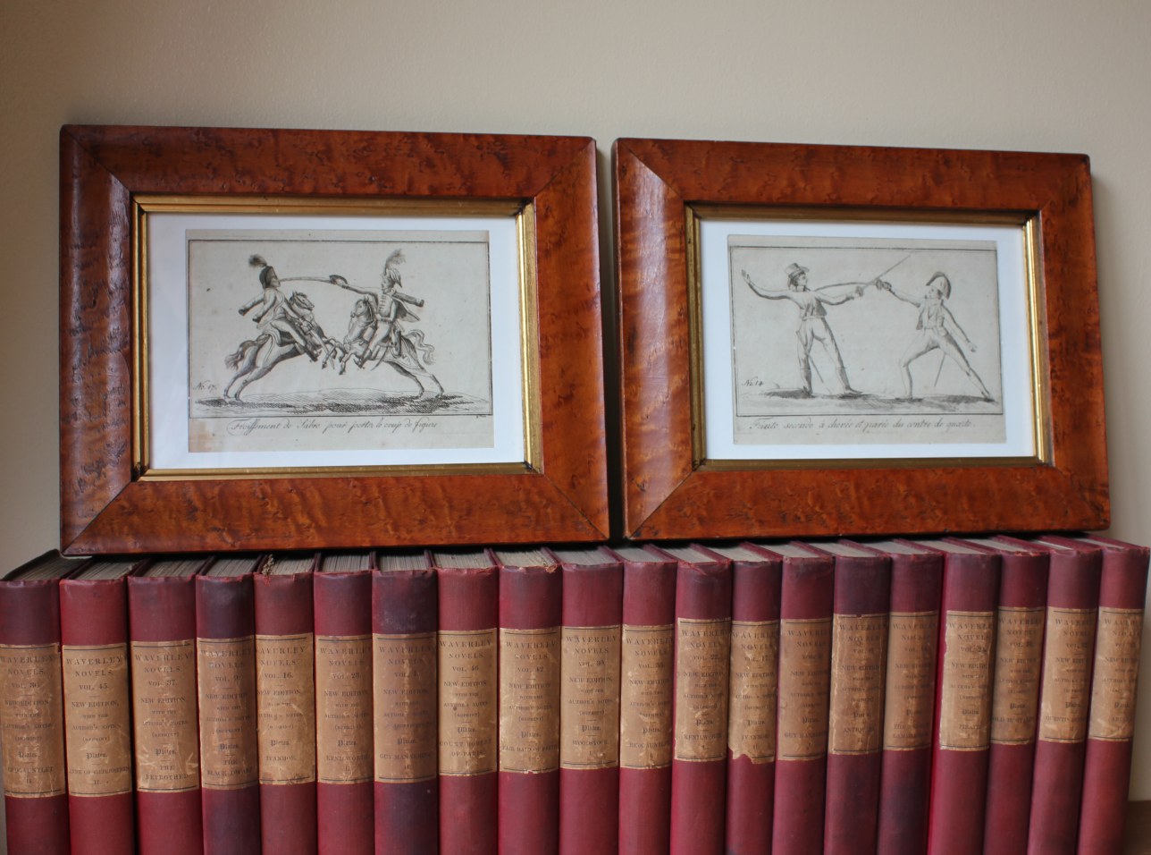 A pair of very nice and original antique engravings from 1804 which depict sword fencing, printed on handlaid paper. Later framed and glazed in maple veneer frames.