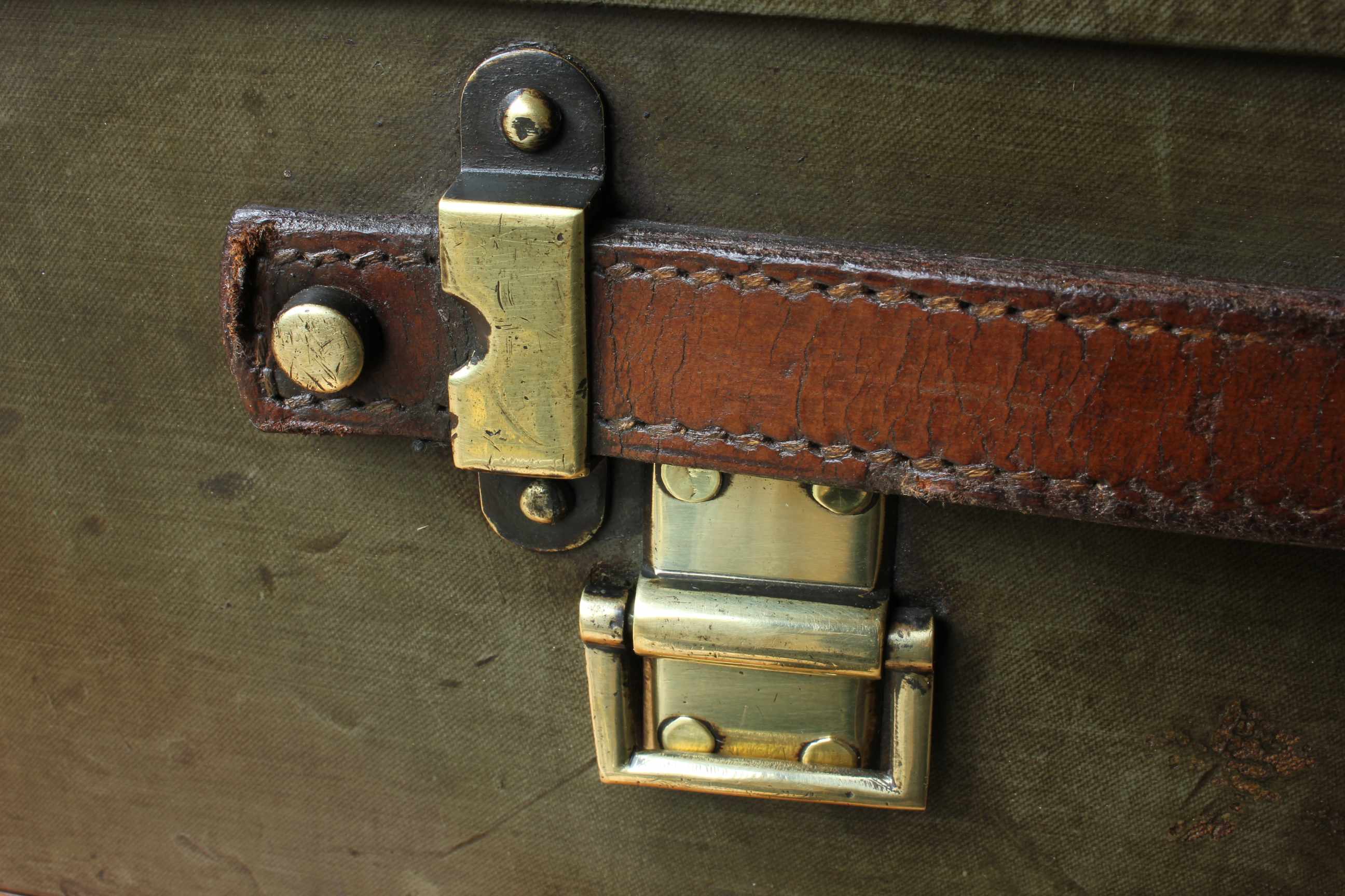 All fittings are brass which include three brass clasps to the front with the middle one beng double locking with a safety clasp. The other fittings include tethering rings to either side so the case so it can be fitted to a car, hinges, lock which is marked Finnigan's Ltd London and rivets all around the case which are all marked with an F (for Finnigan's).