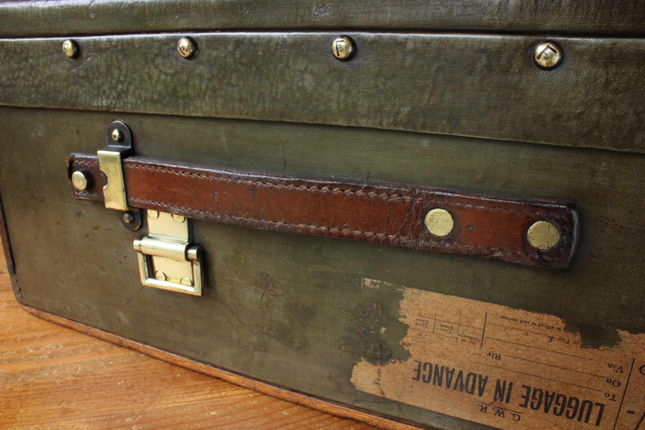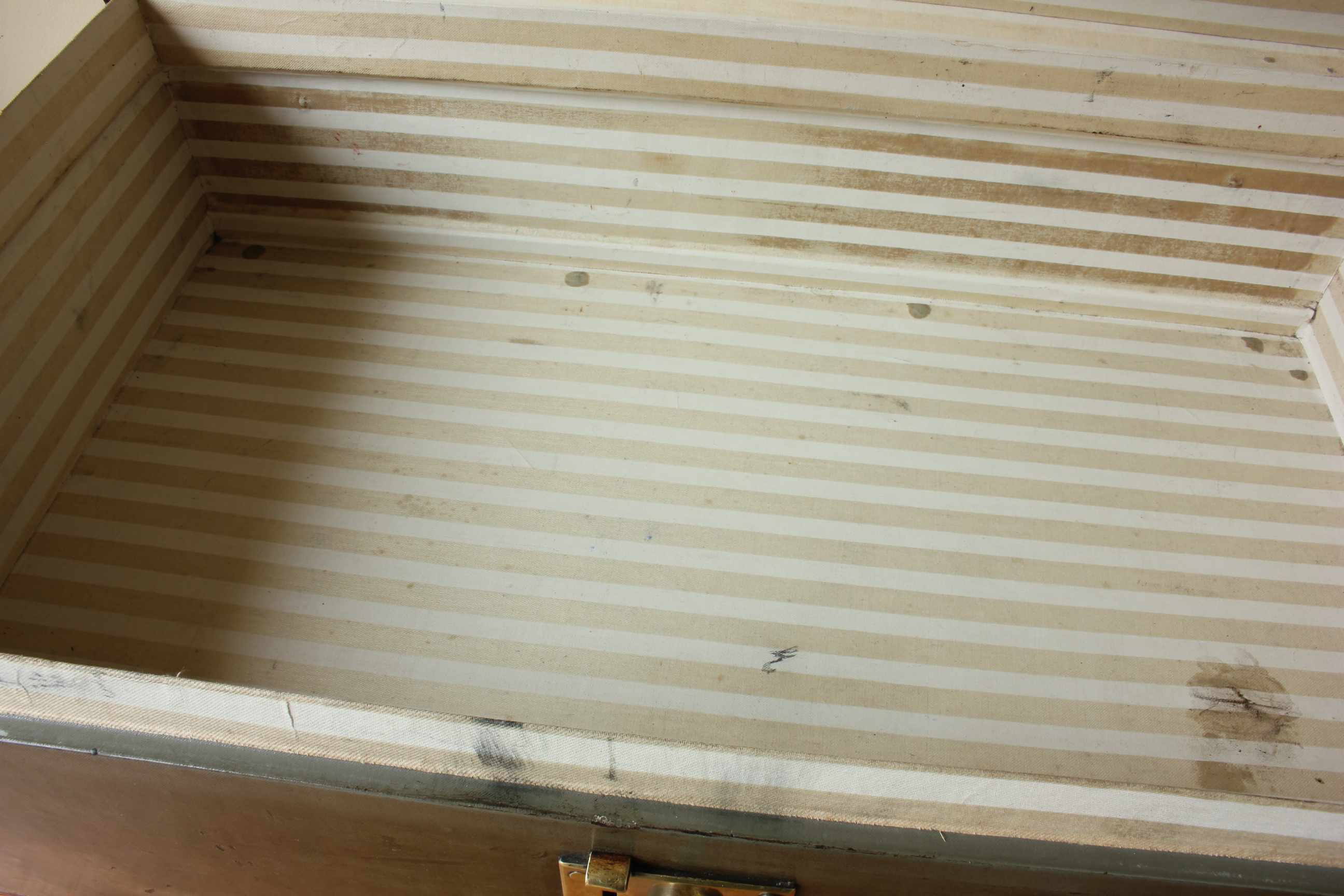 The lid of this high quality case can be raised and locked in it's upright position and inside is fitted with a striped beige canvas lining. The outside has a couple of old luggage labels such as GWR.
