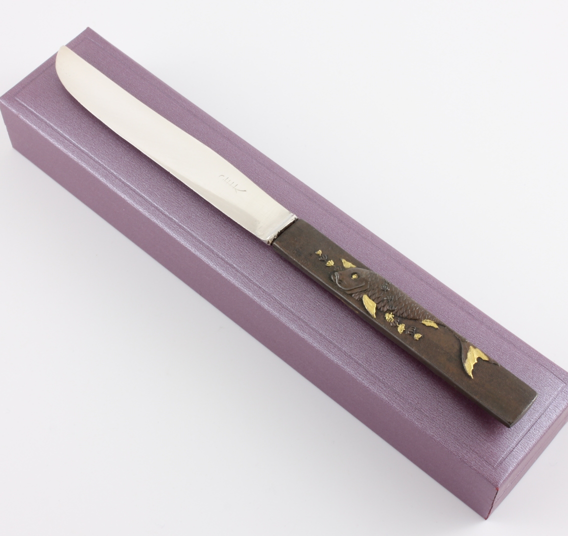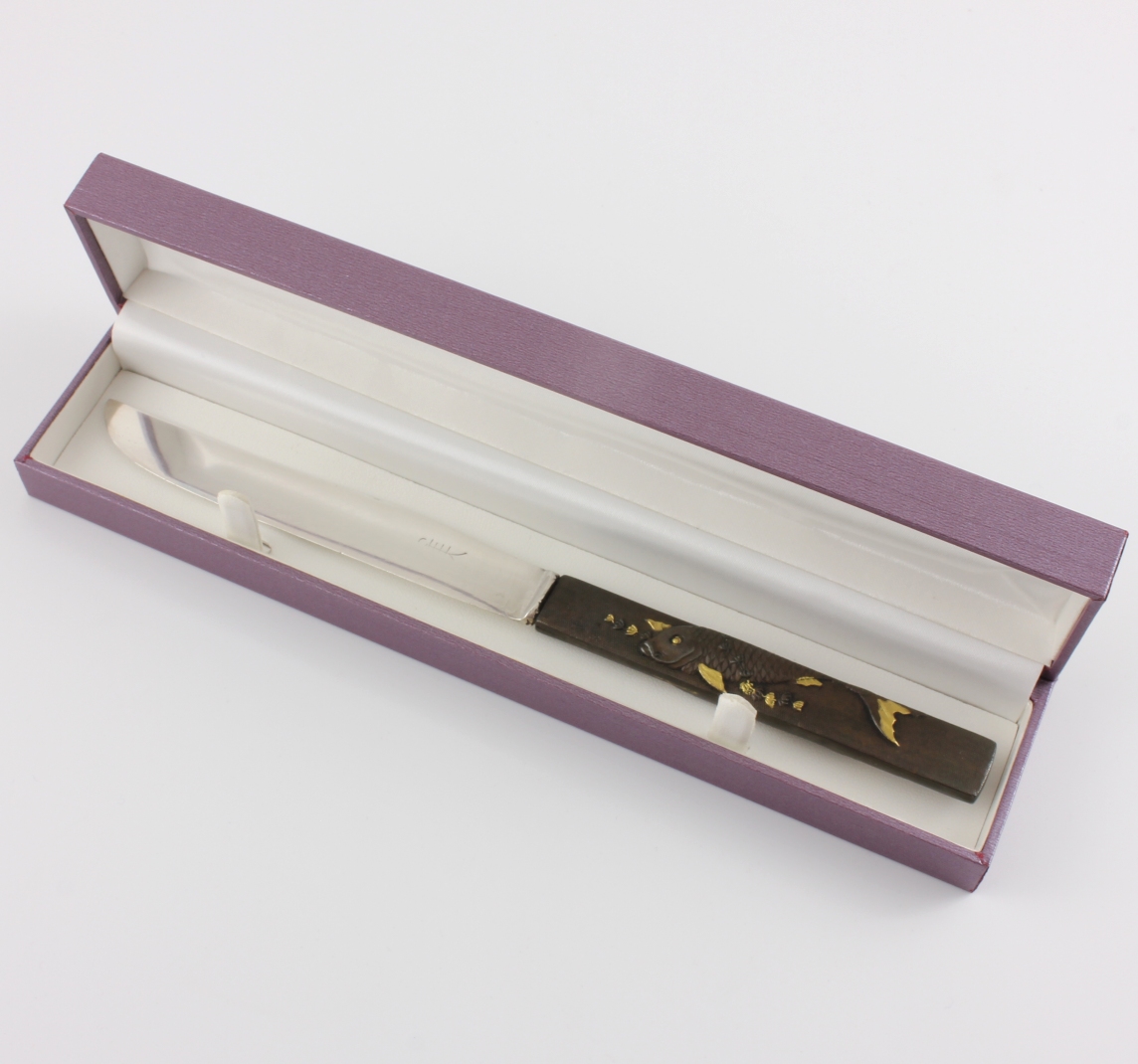 The beautiful bronze handle is wonderfully decorated on both sides with real gold highlights which show off the craftsman's skill for detail and this one features a carp swimming amongst weed.