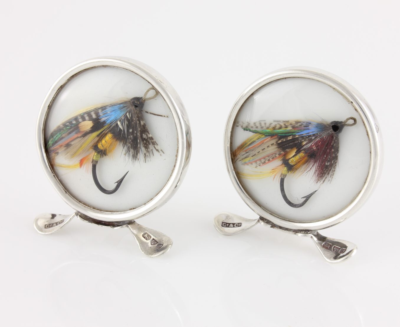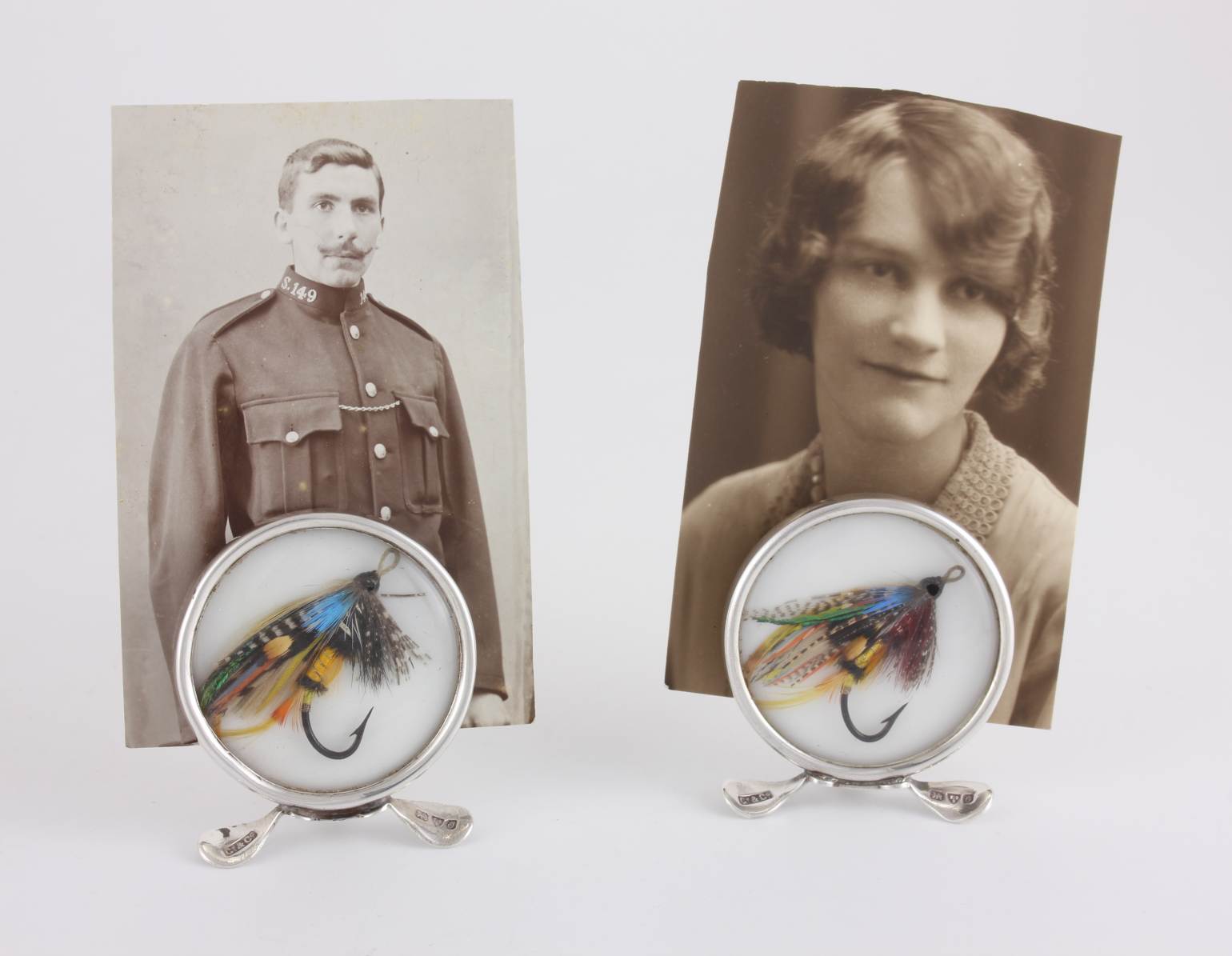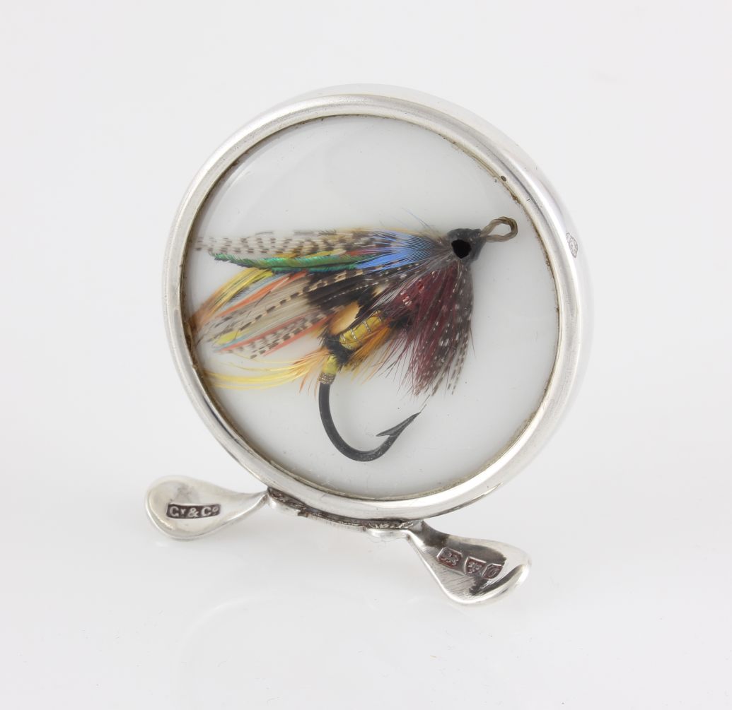 These circular menu holders feature colourful fishing flies that are set in the silver mount behind glass and sit on three feet.