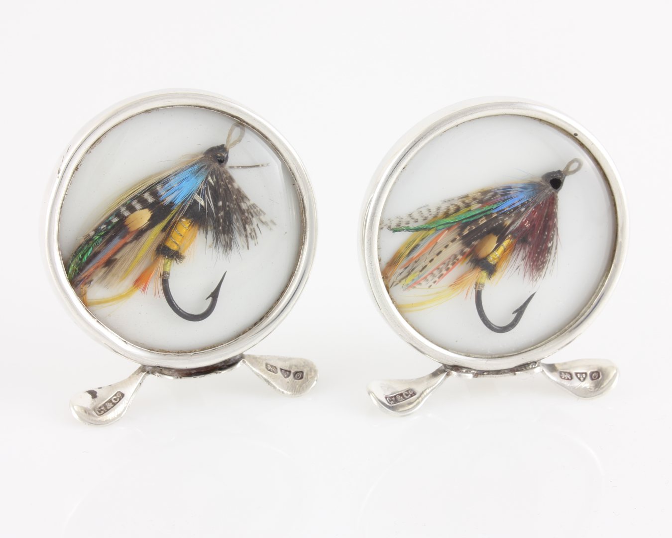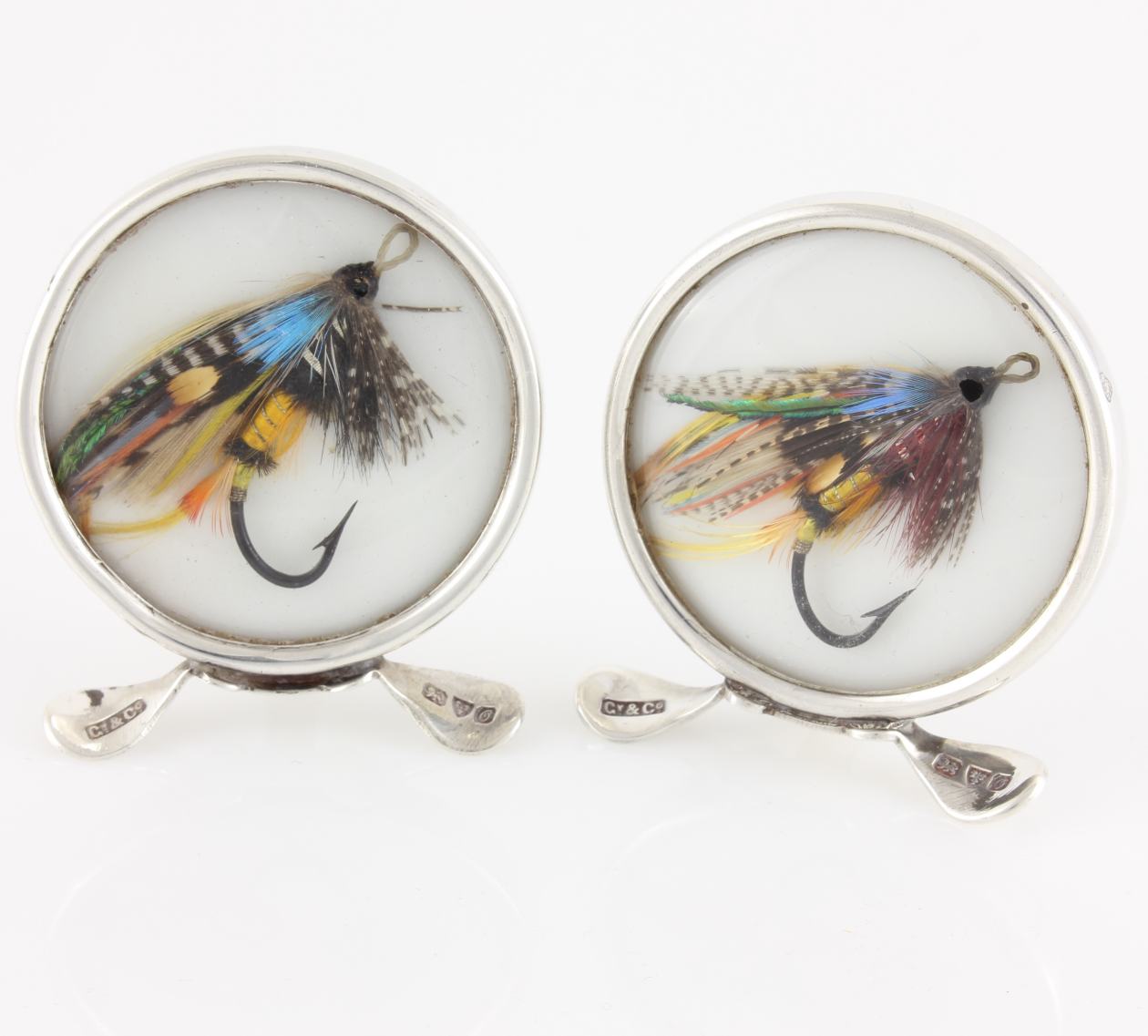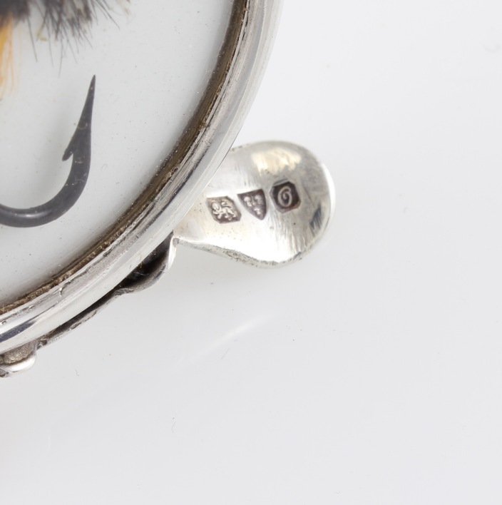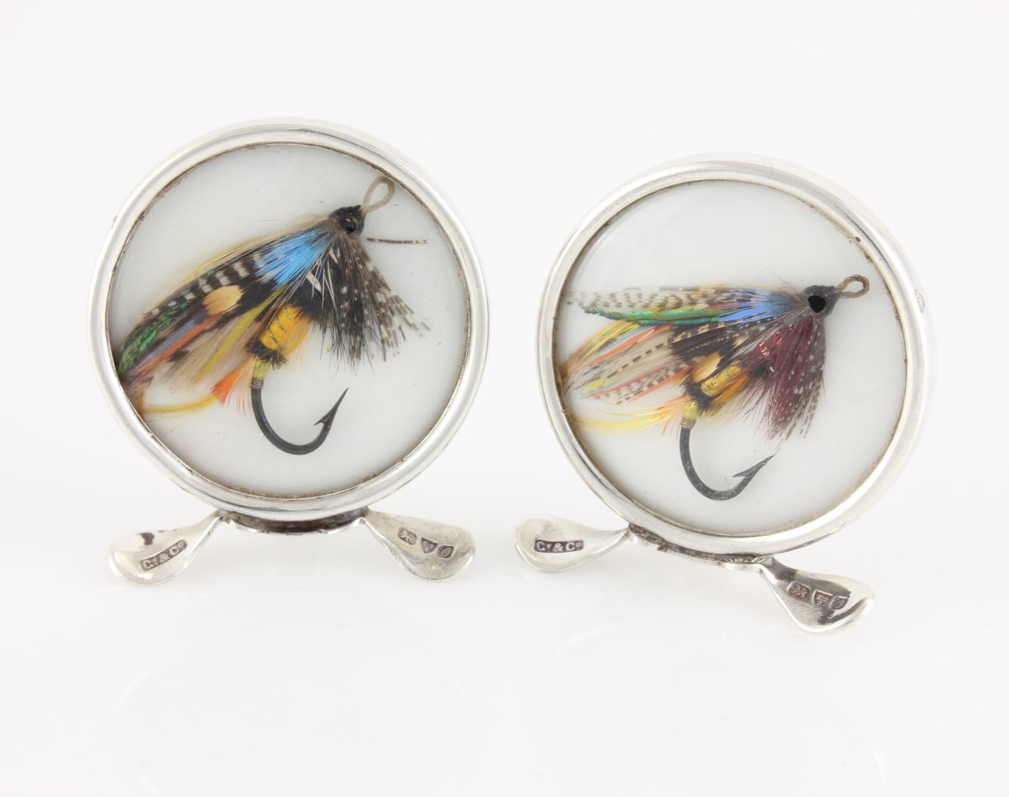 These circular menu holders feature colourful fishing flies that are set in the silver mount behind glass and sit on three feet.