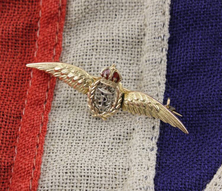 This charming vintage Royal Navy Fleet Air Arm Sweetheart brooch which is made of 9ct gold has a fouled anchor inside a laurel wreath with a red enamel King George VI crown to the top and two side wings.