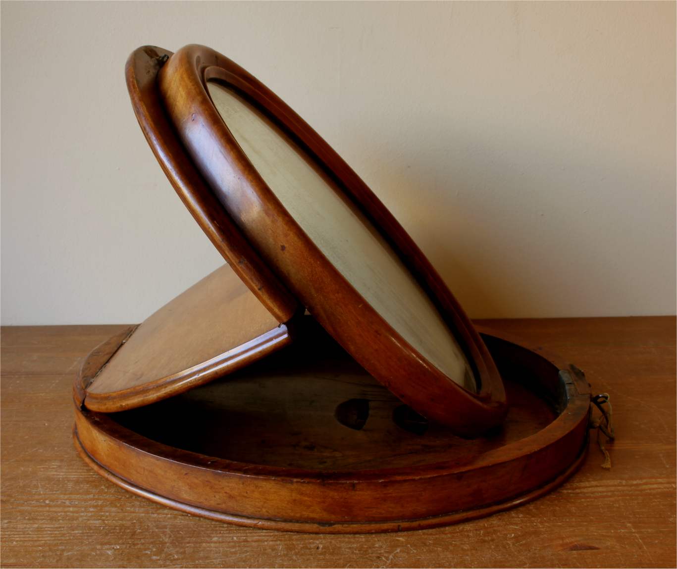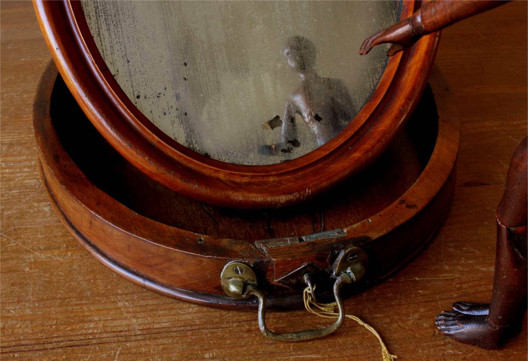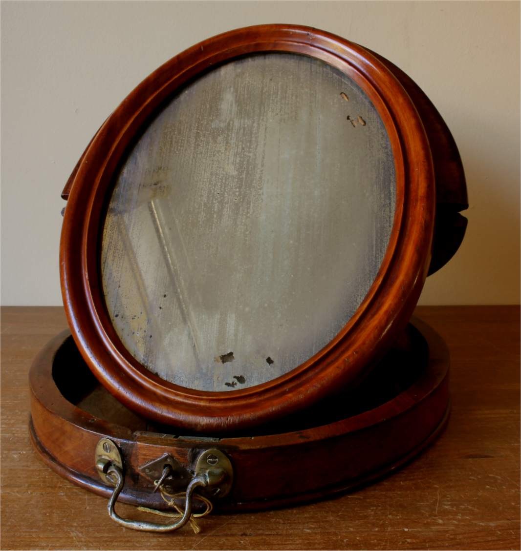 The wooden hinged case can be locked and unlocked by using the key and when opened folds back on to one of the three interior notches so the mirror can be used at different angles. The mirror has some wonderful distressing / foxing to the plate so has an attractive antique look.