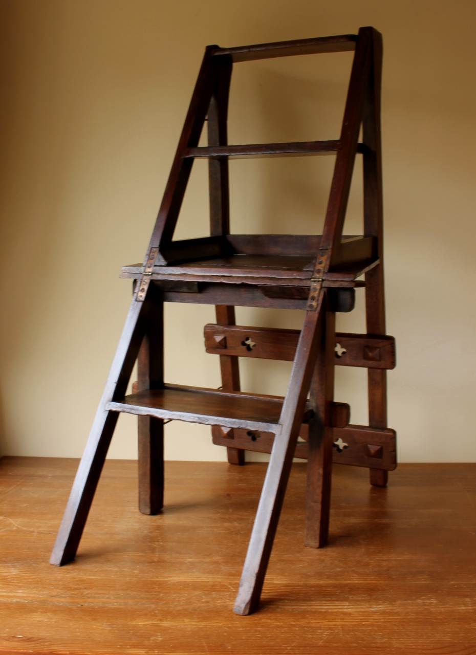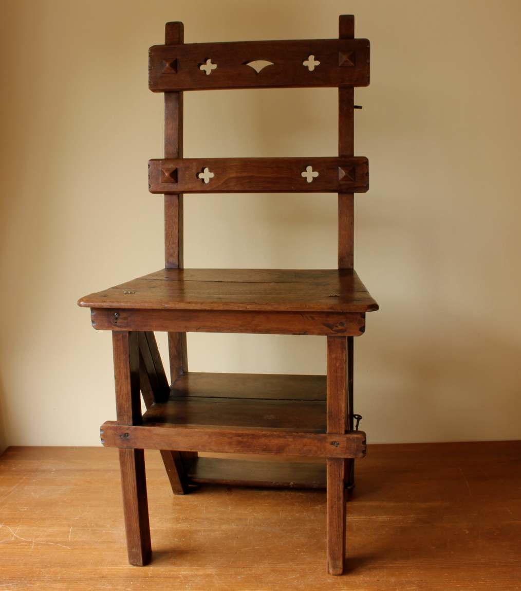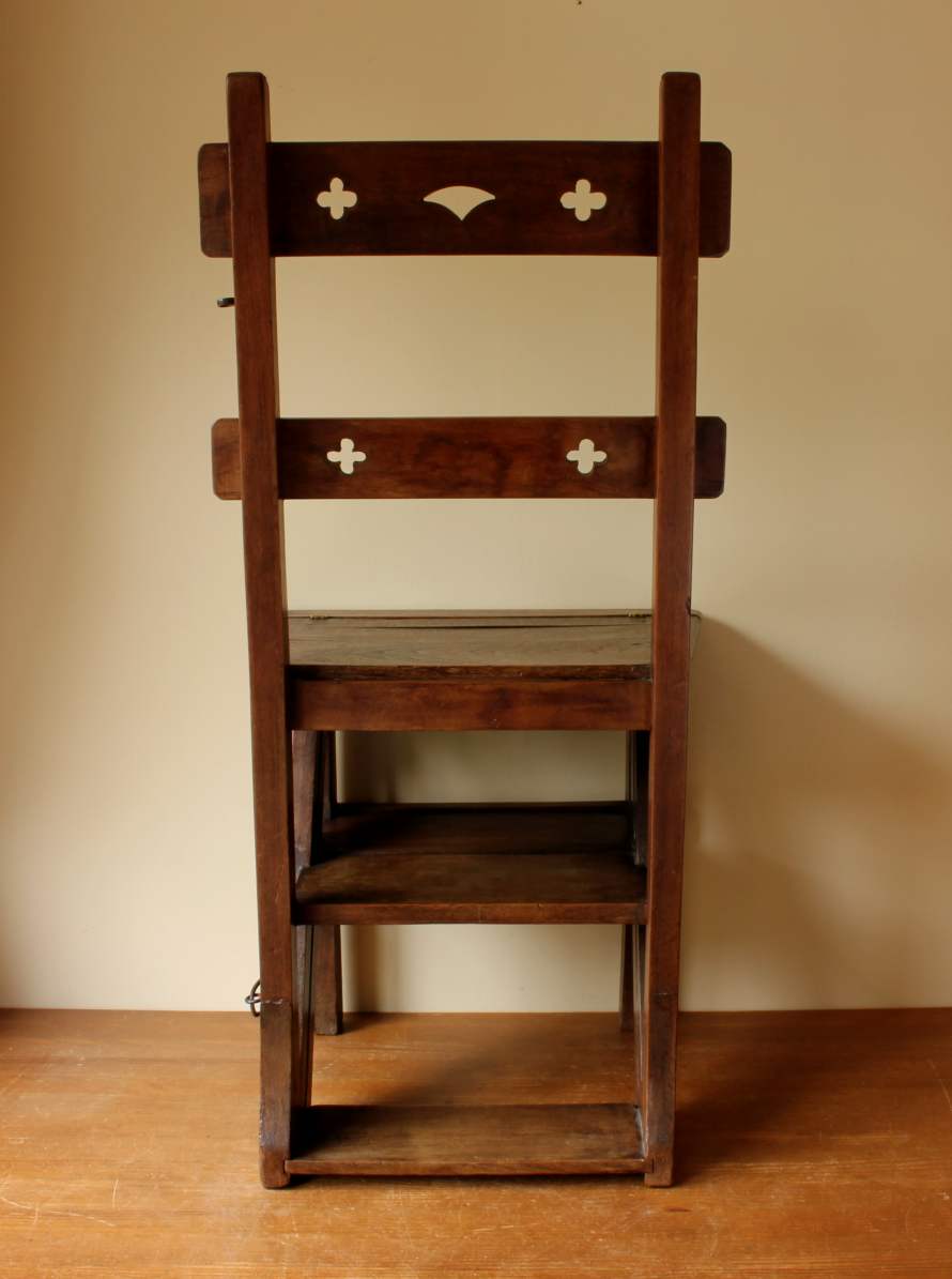 This well made chair has a beautiful ecclesiastical design similar to Pugin to the back rails, a hinged seat which folds and easily transforms into library steps by flipping over and securing with the metal bar/clasp.