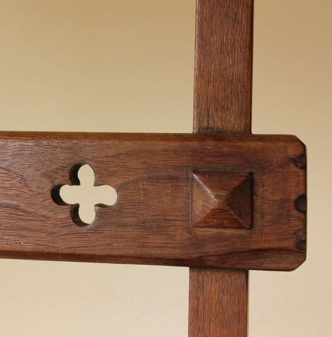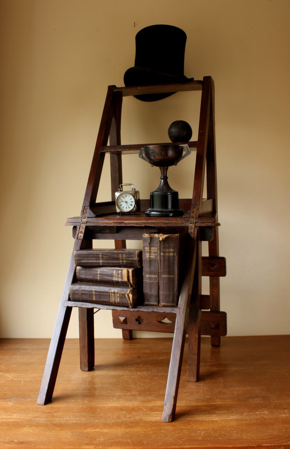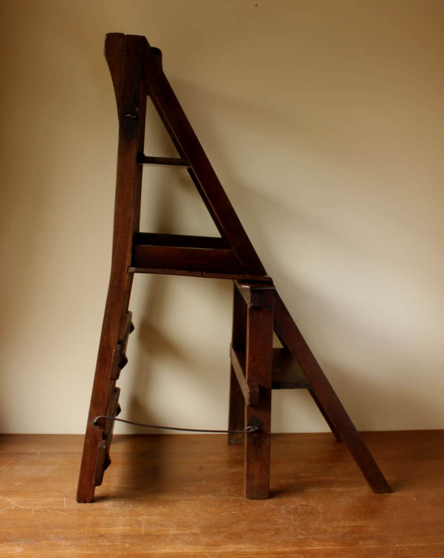 This well made chair has a beautiful ecclesiastical design similar to Pugin to the back rails, a hinged seat which folds and easily transforms into library steps by flipping over and securing with the metal bar/clasp.