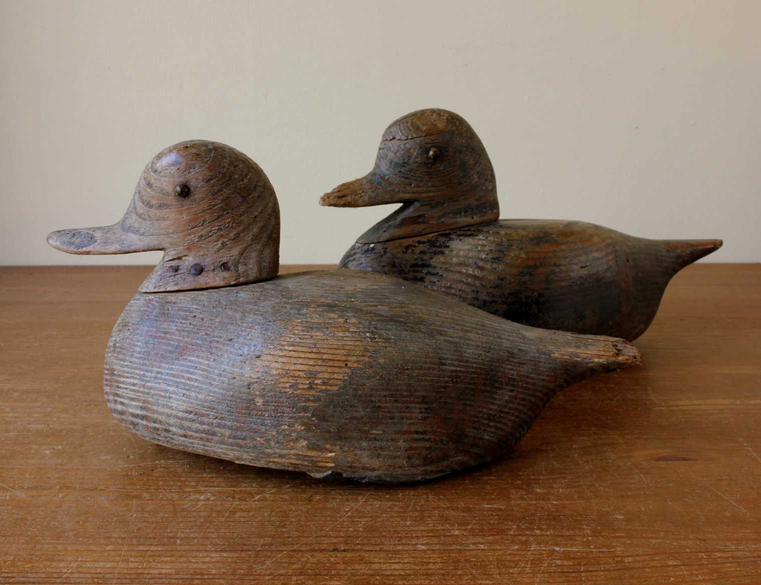 These two decorative and original antique decoy ducks which are made of wood still have some of the remains of their original paint showing, have painted metal eyes, are fitted with bottom balance weights and are nice early ones.