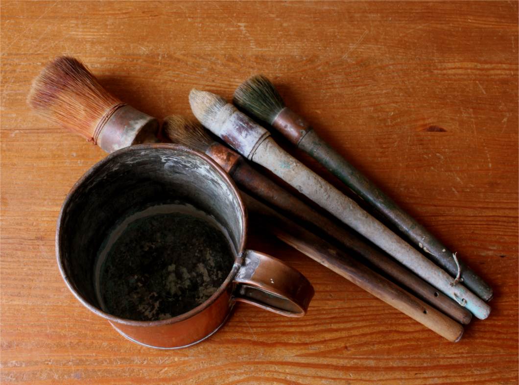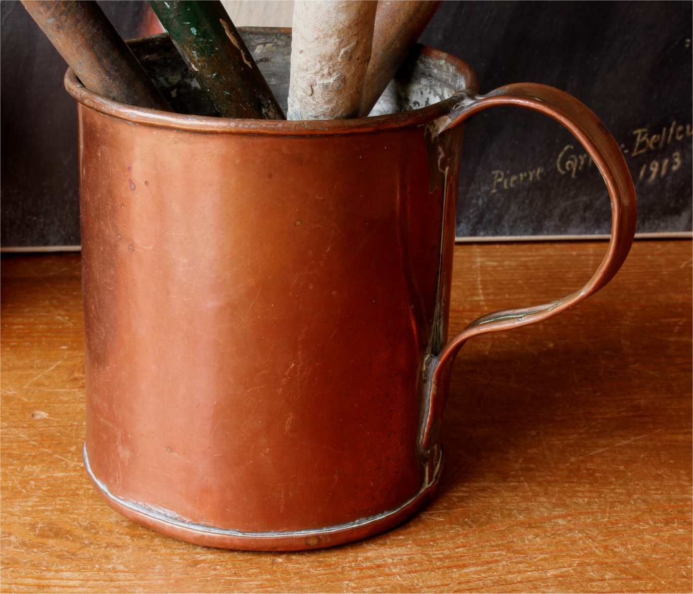 These brushes sit nicely in their 19th century handmade copper pot that has a large side handle and has a charming rustic look with knocks, dings and a beautiful aged patina.