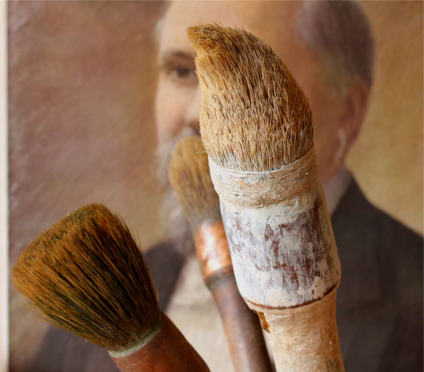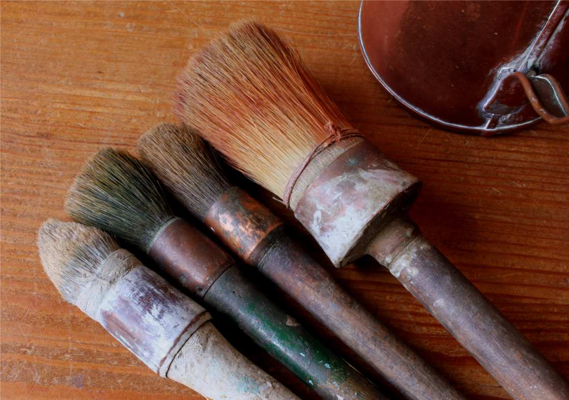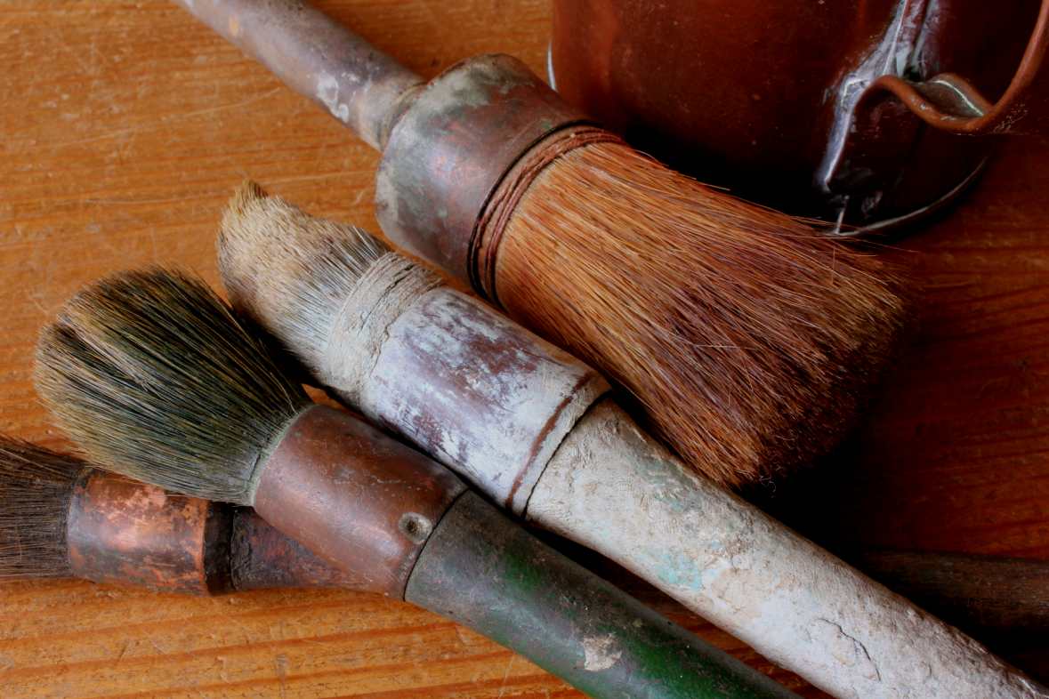 These four attractive French paint brushes which are made from natural materials including wood and animal hairs retained with copper mounts look wonderful on display showing the remains of coloured paint.