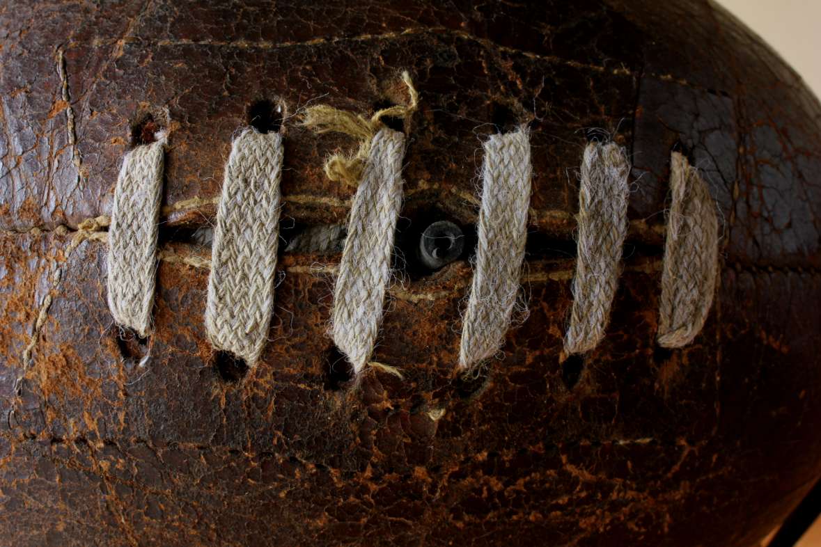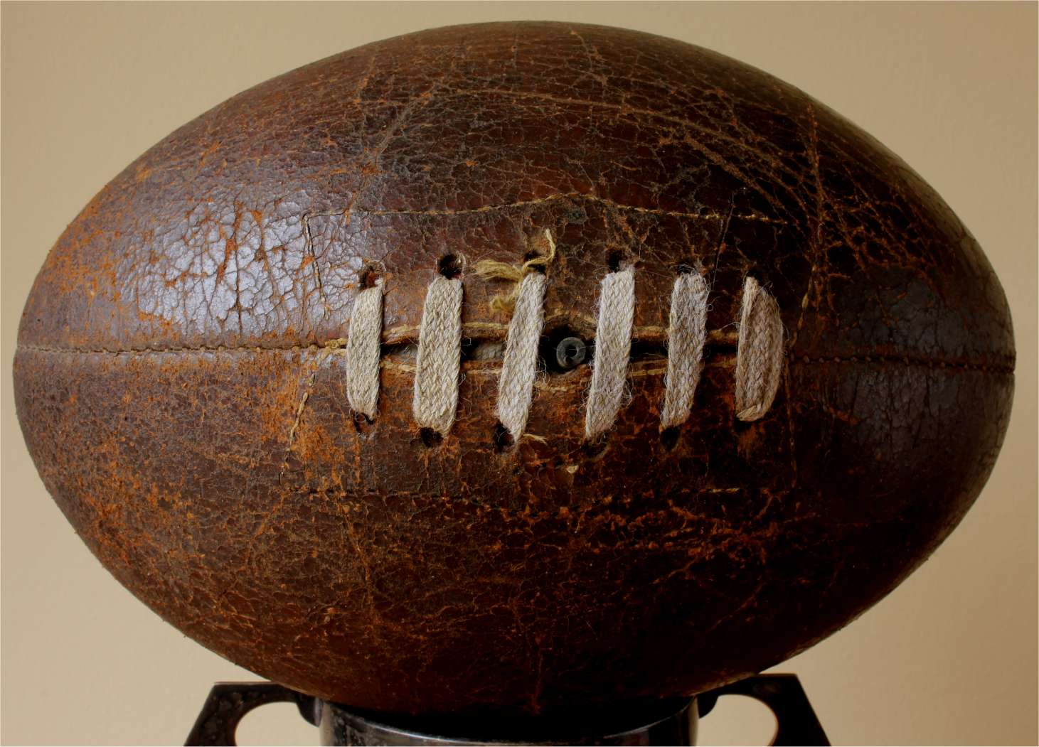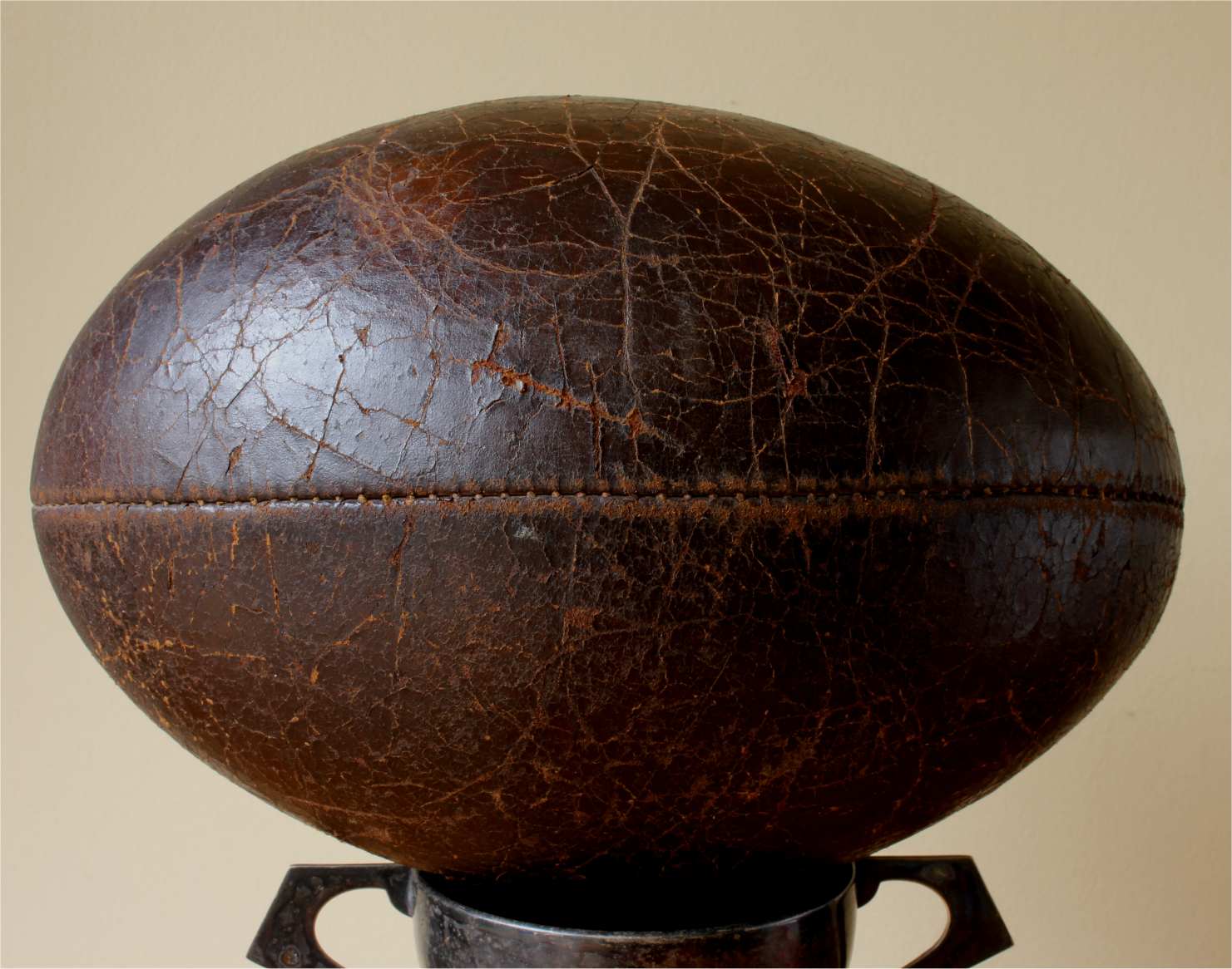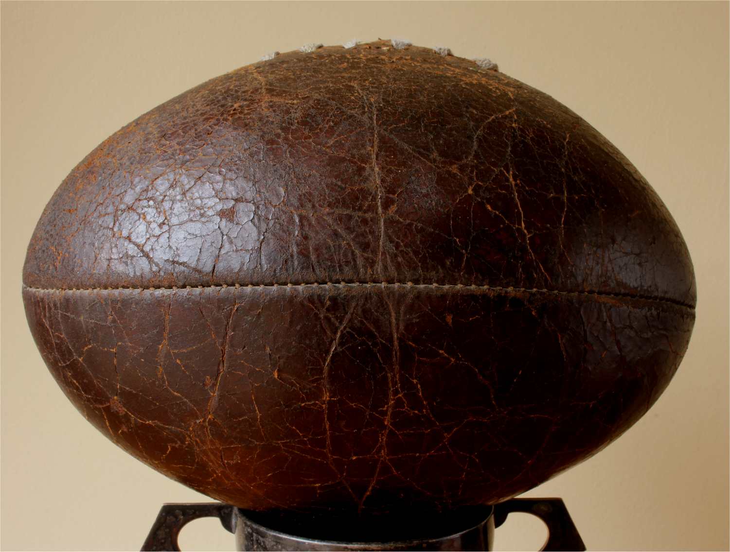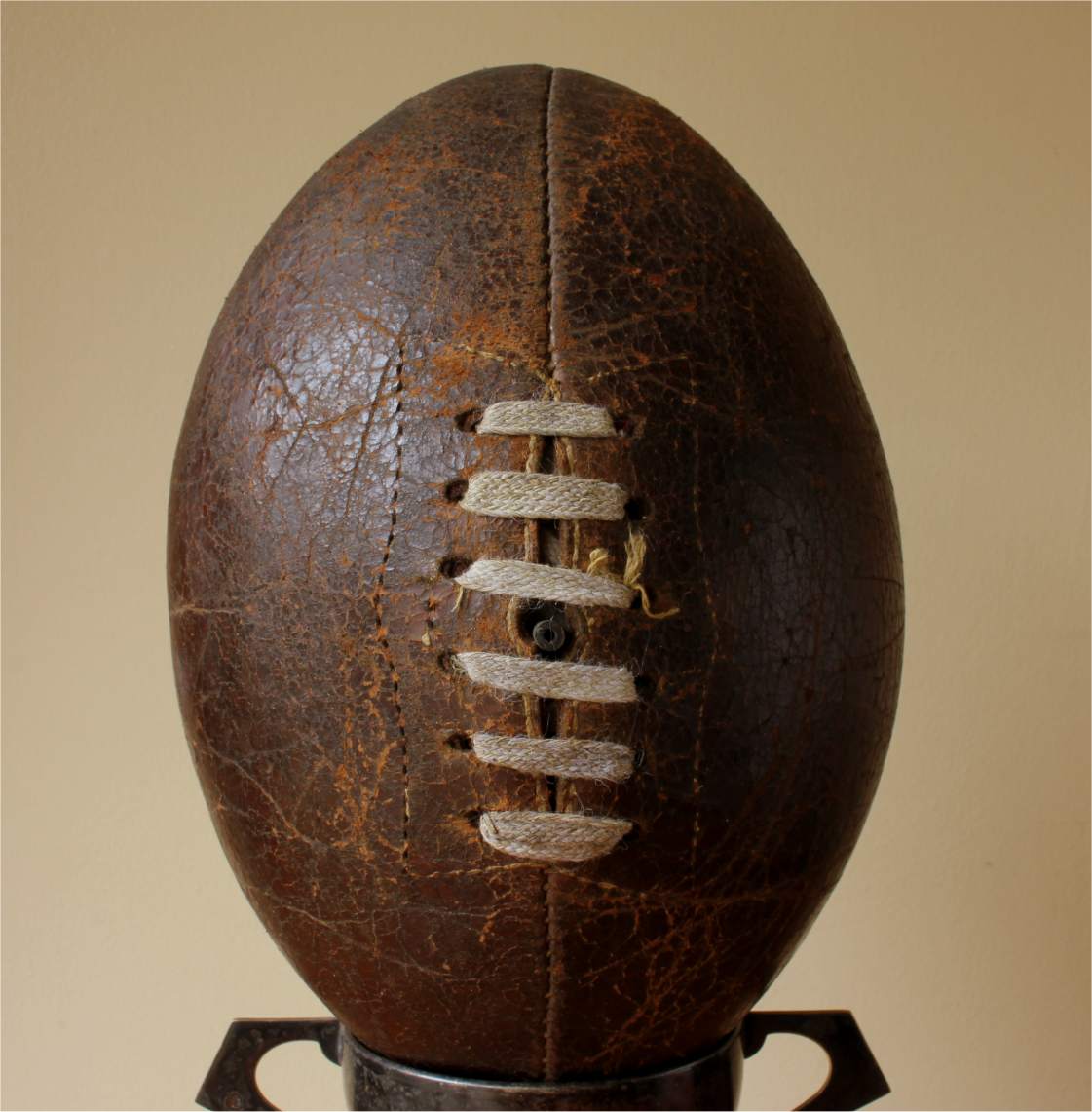 This original vintage / antique rugby ball which has 4 hand sewn leather panels and 6 pairs of lace holes dates from c1940 and has a beautiful dark brown patina. A new bladder has been fitted so the ball inflates and holds air.