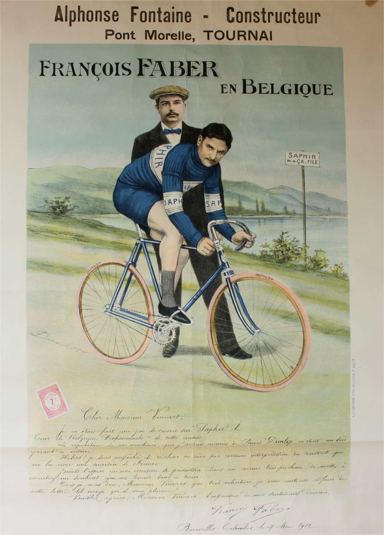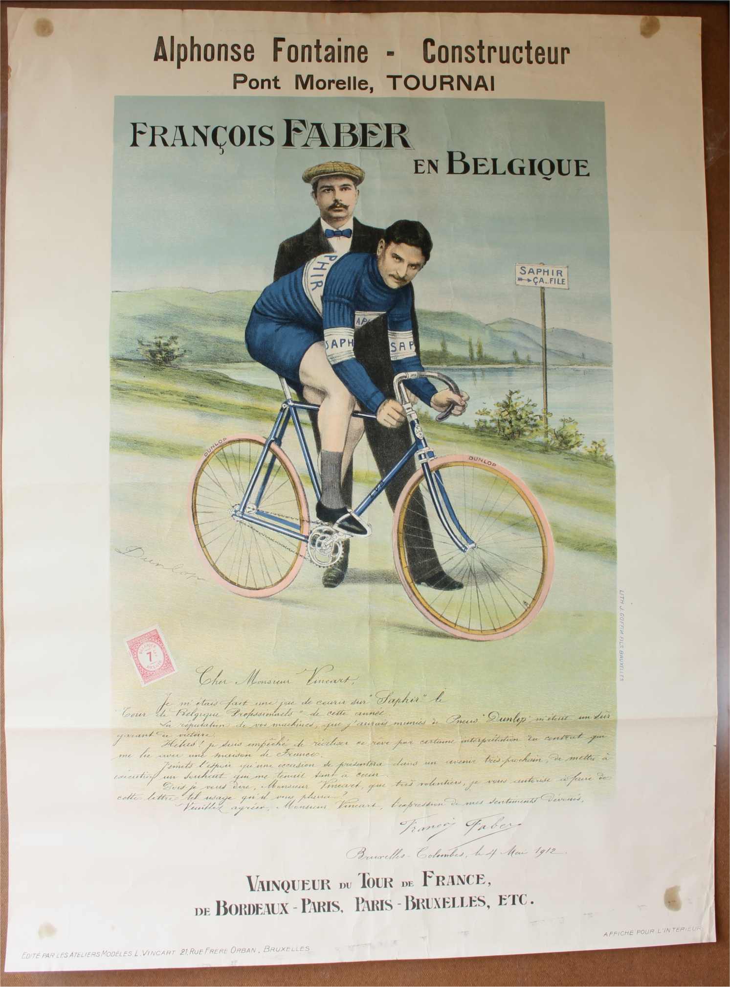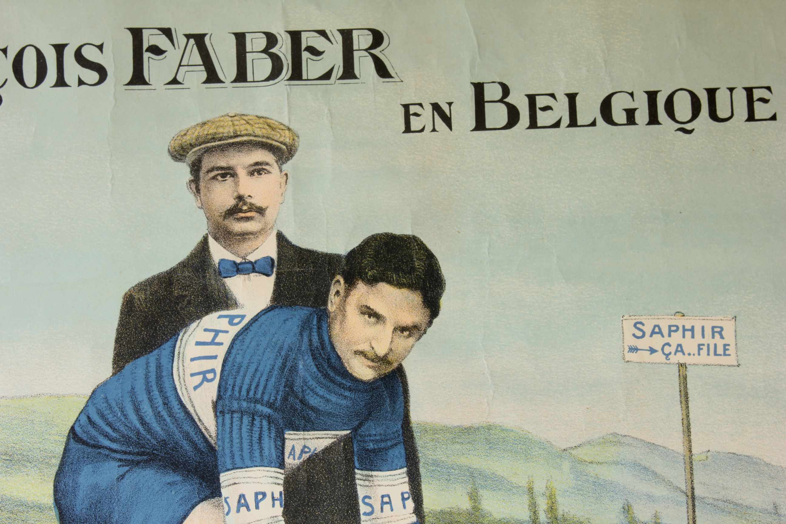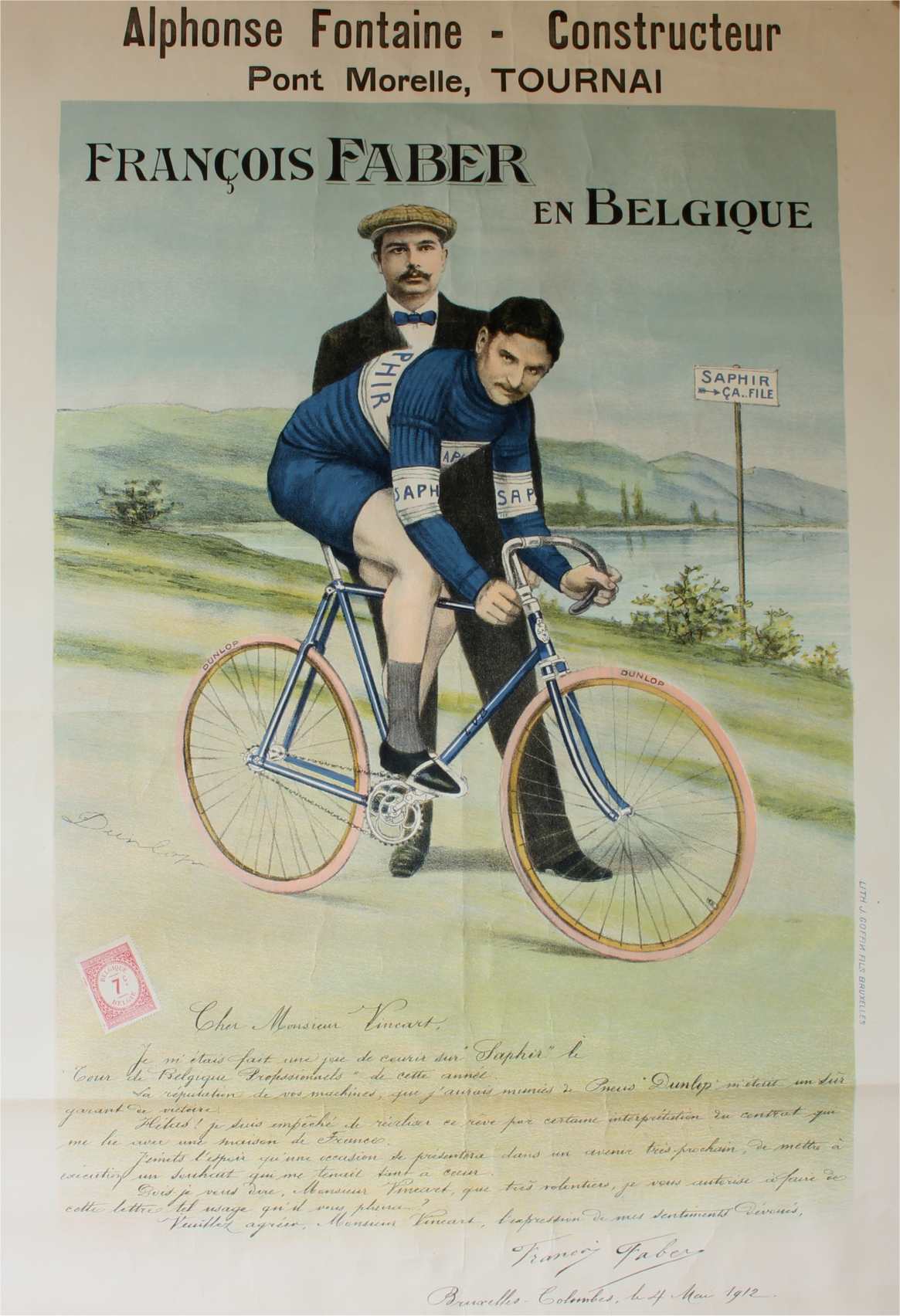 This fabulous original antique lithograph advertising poster for Saphir cycles dates from c1912 and is of Francois Faber in Belgium.