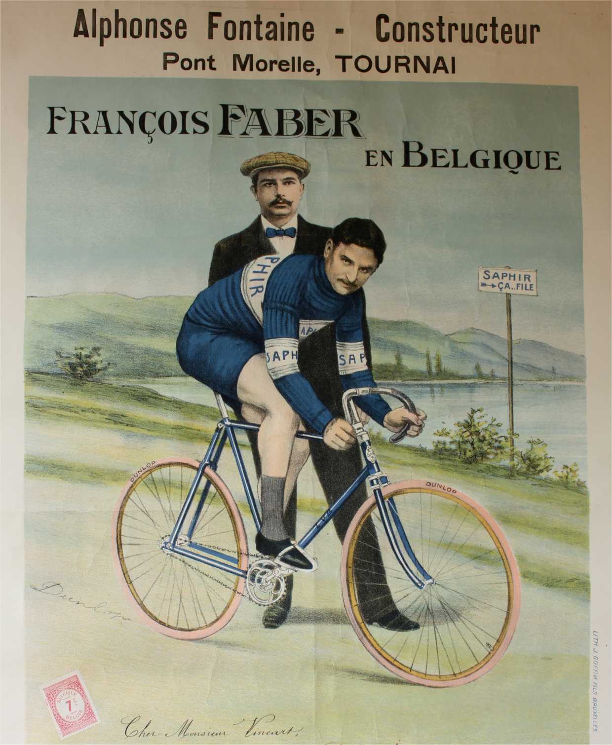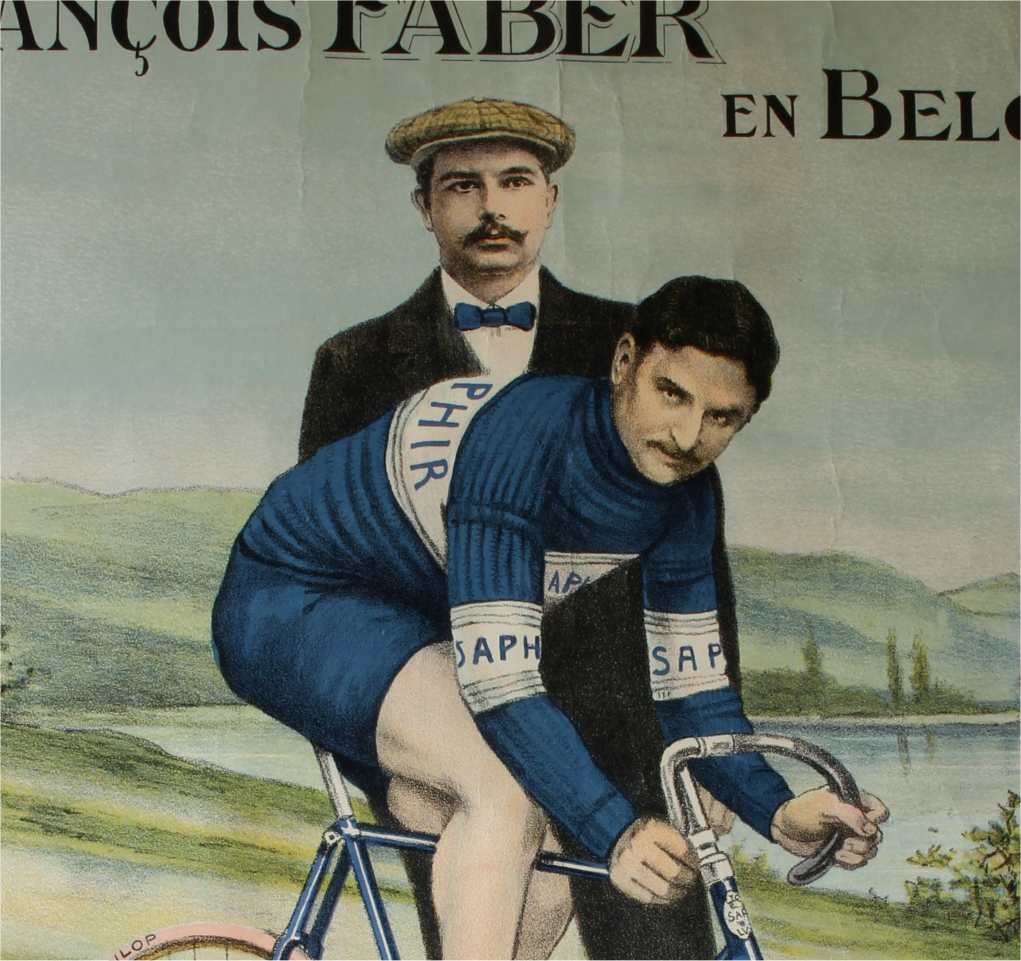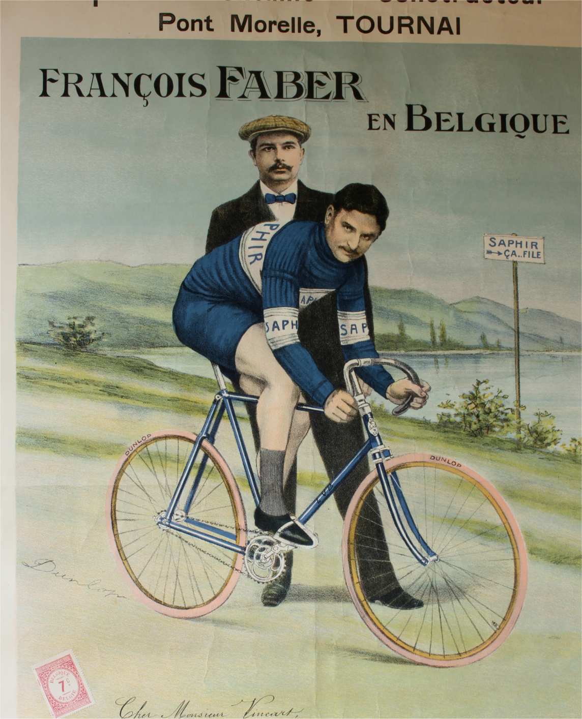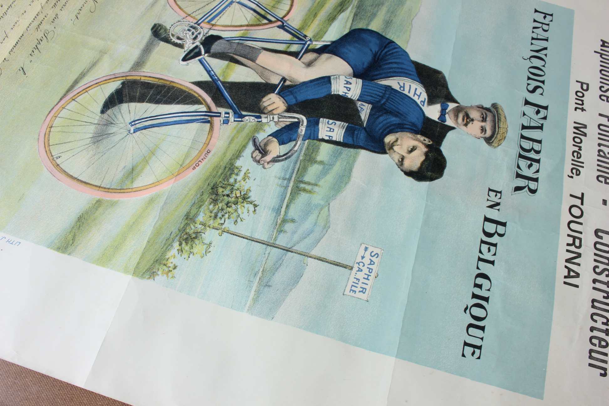 This fabulous original antique lithograph advertising poster for Saphir cycles dates from c1912 and is of Francois Faber in Belgium.
