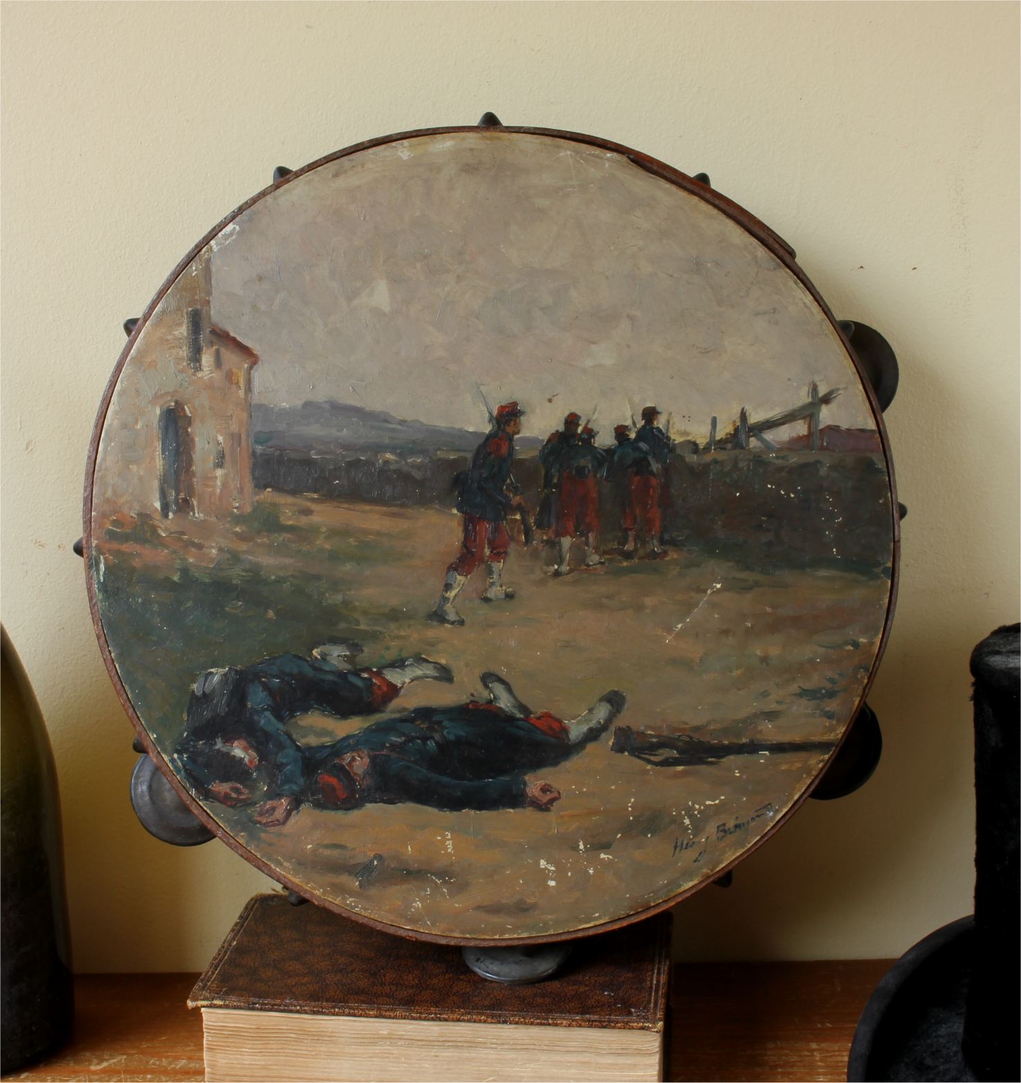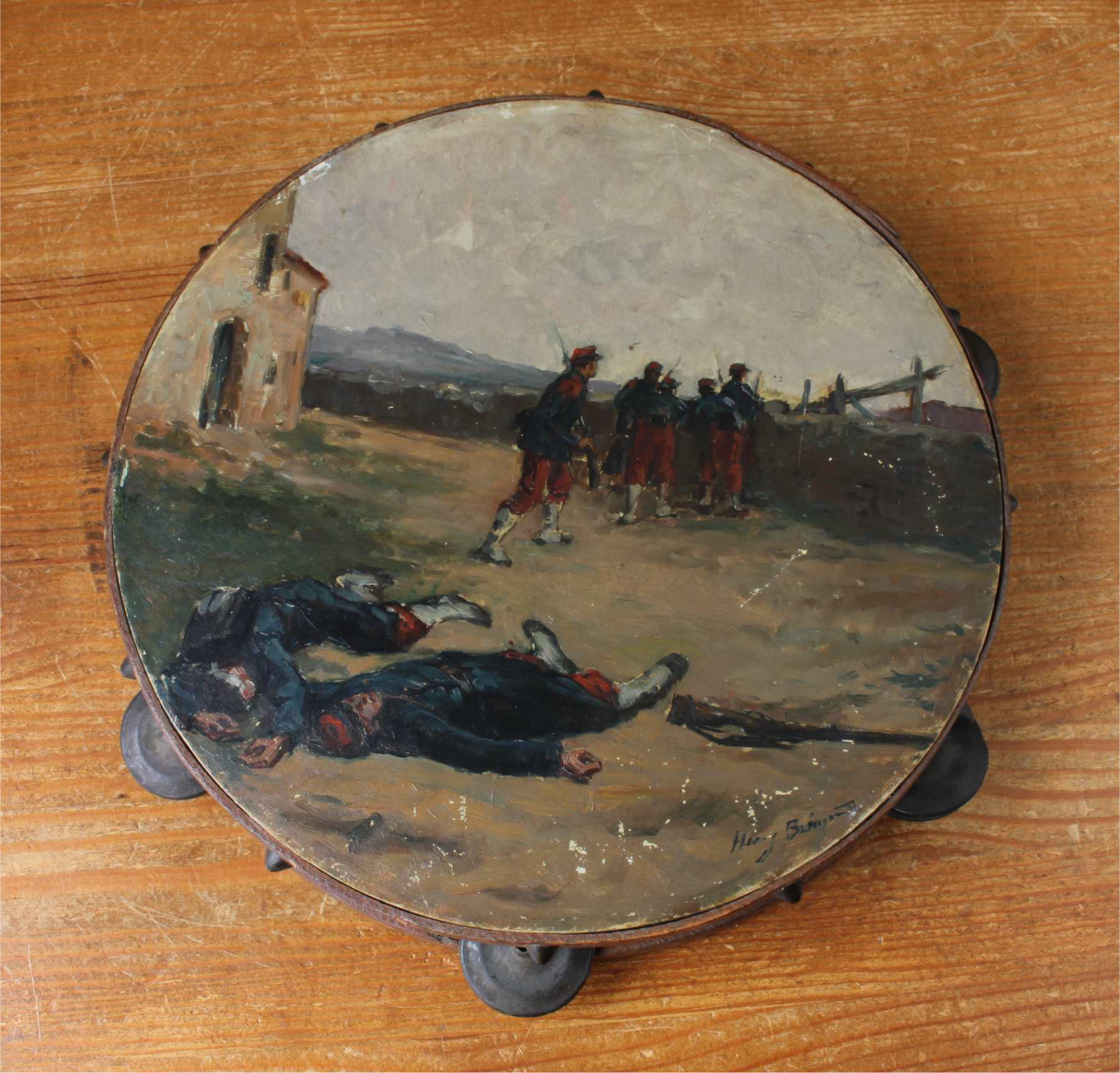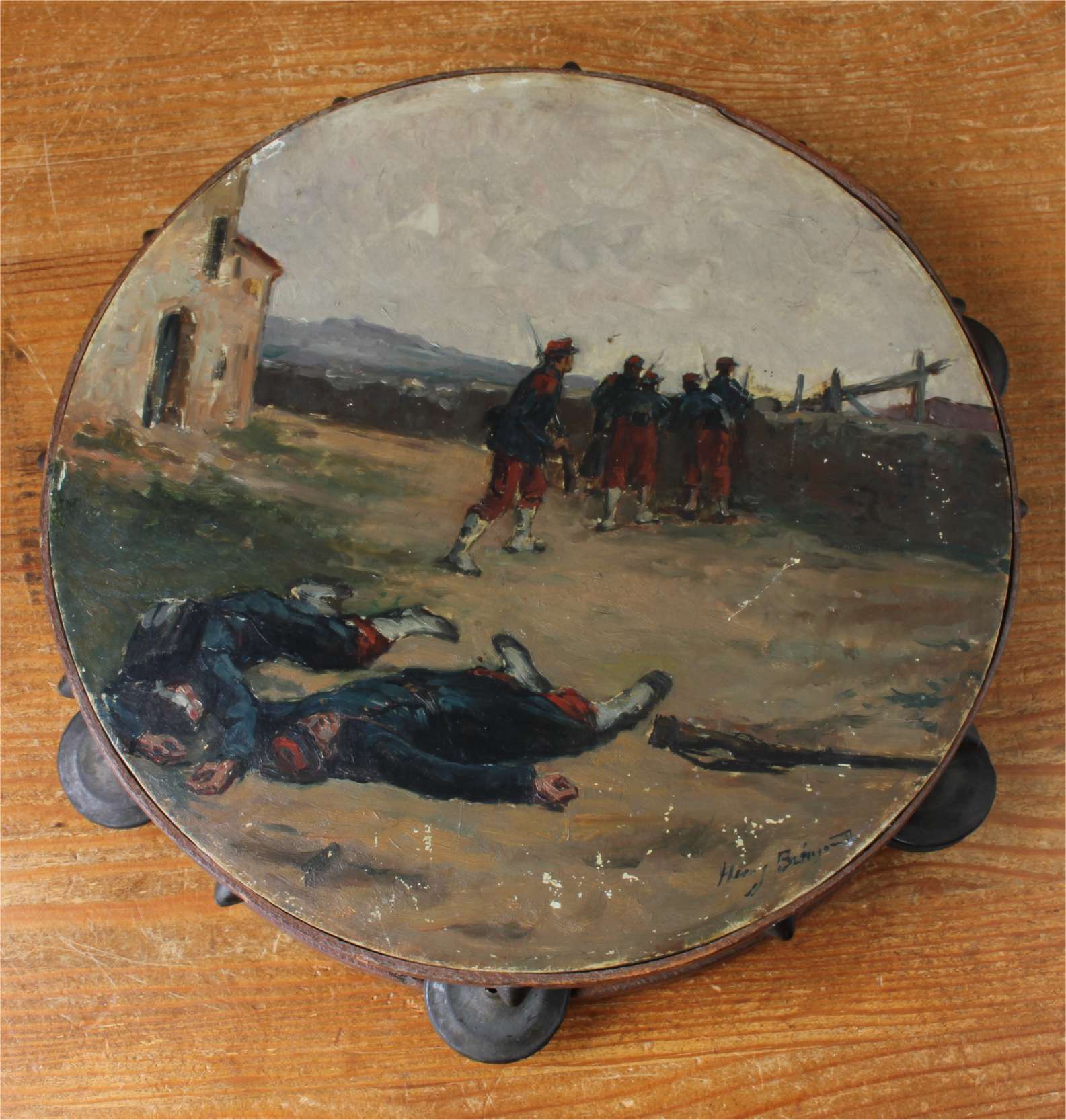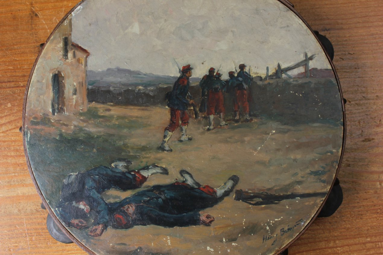 This antique French painted tambourine which dates from the late 19th century is handsomely painted by the artist with oil paints and features a French military scene with French soldiers in battle and is signed by the artist to the front.