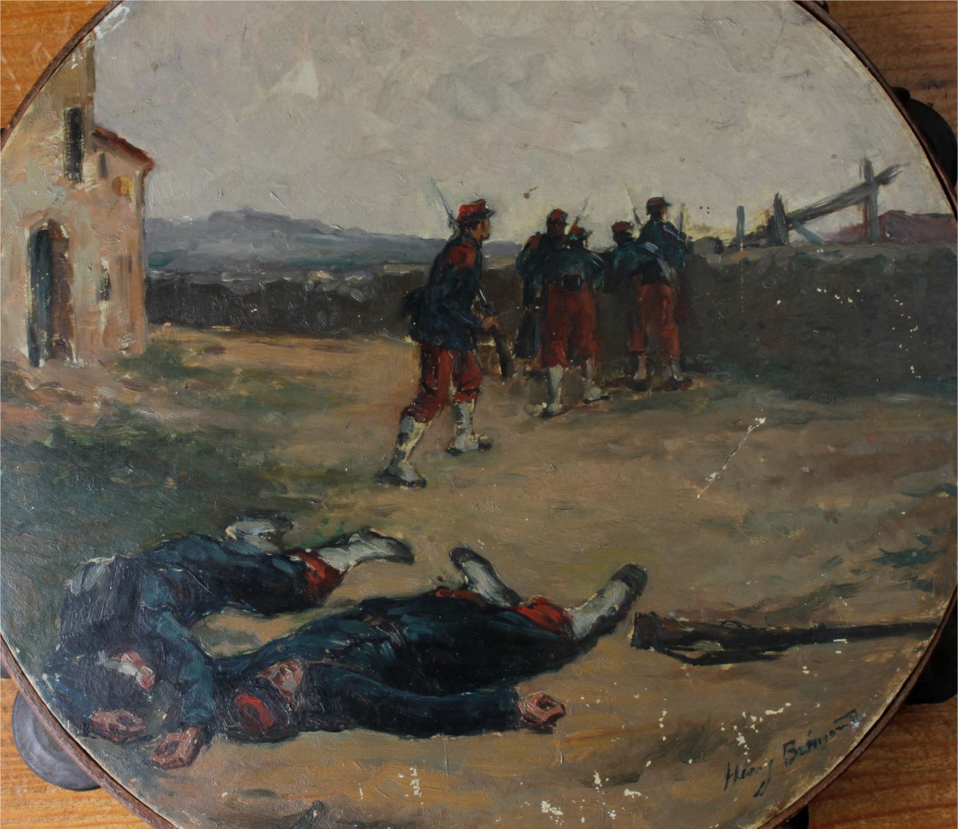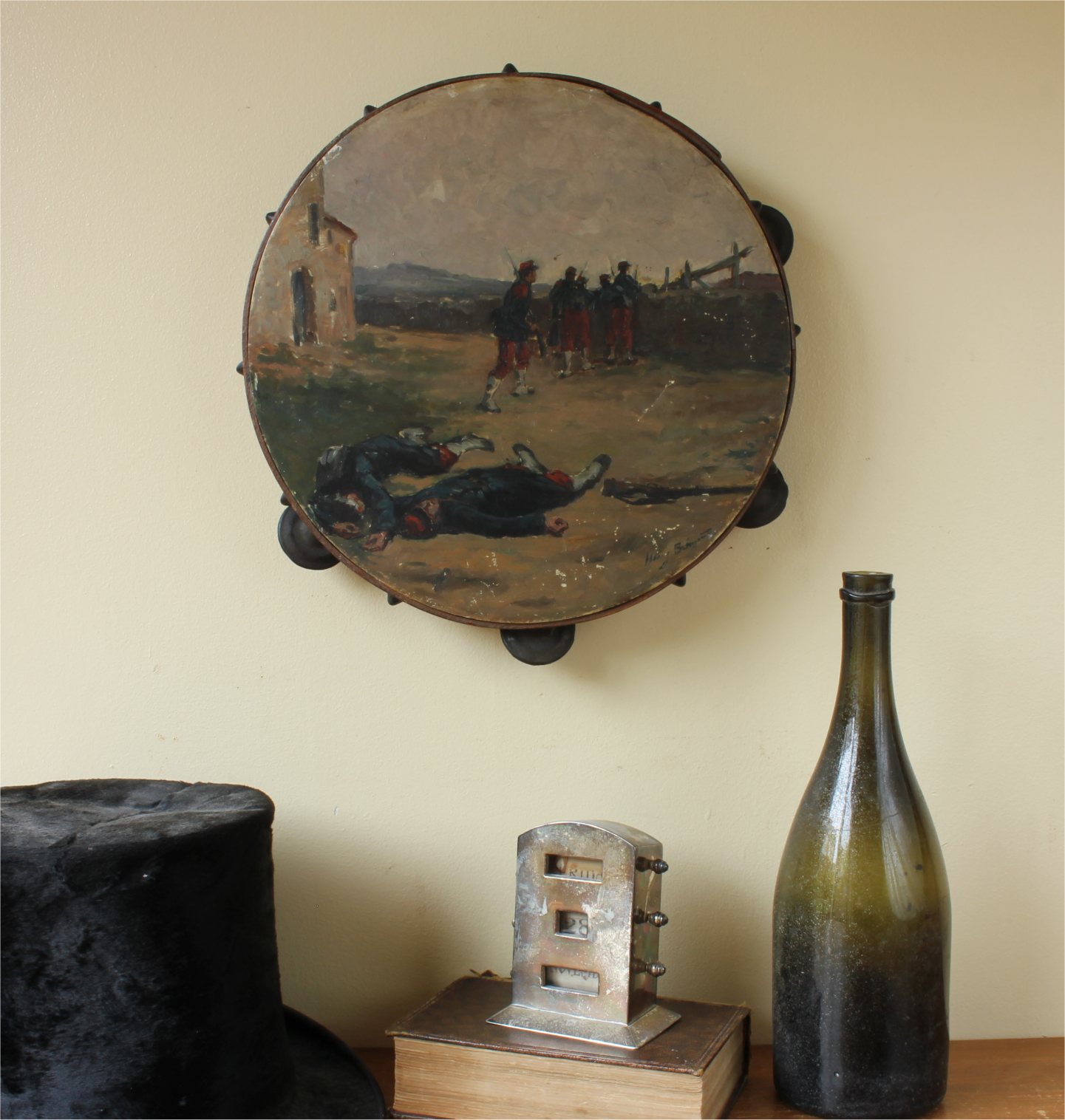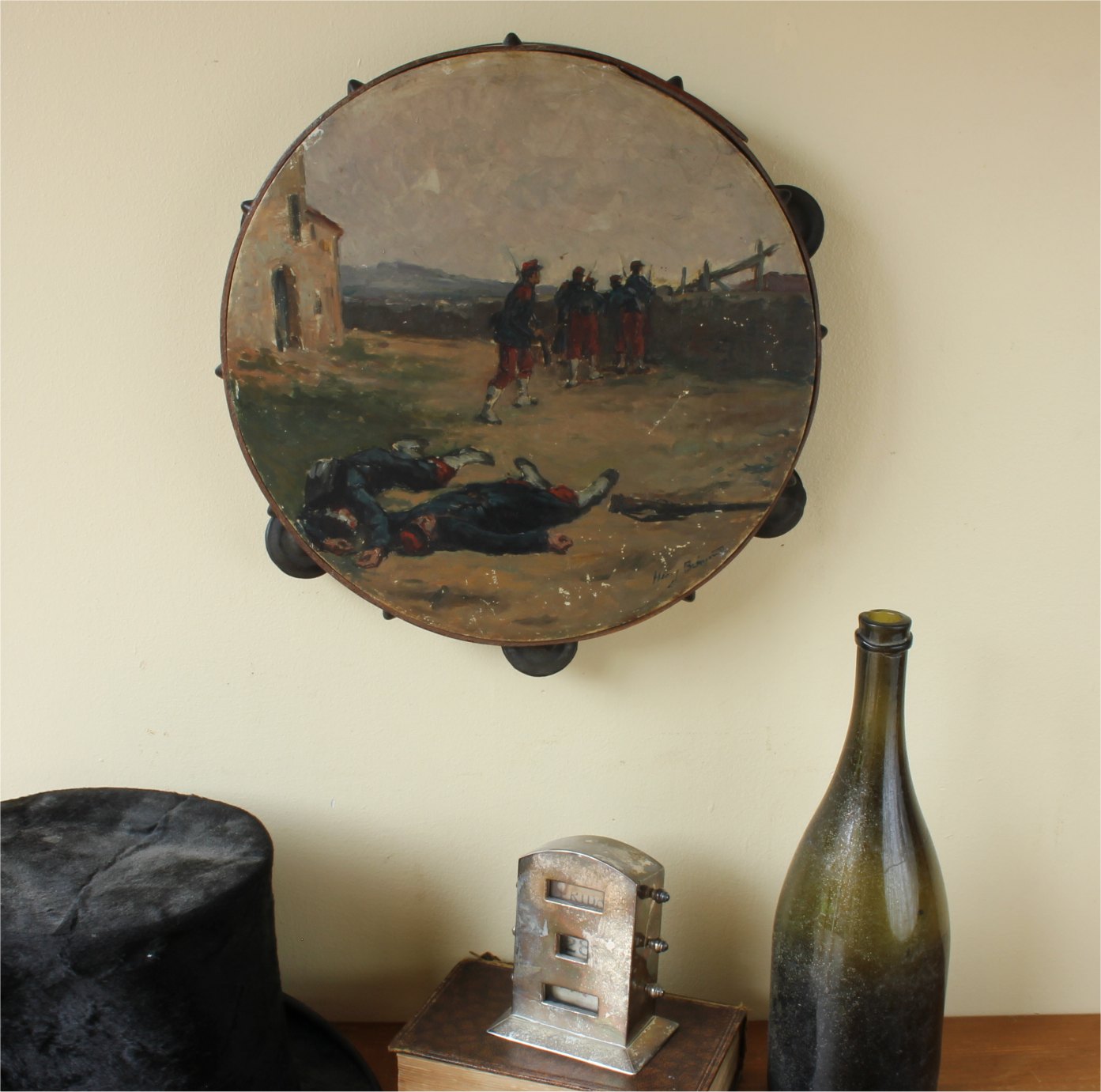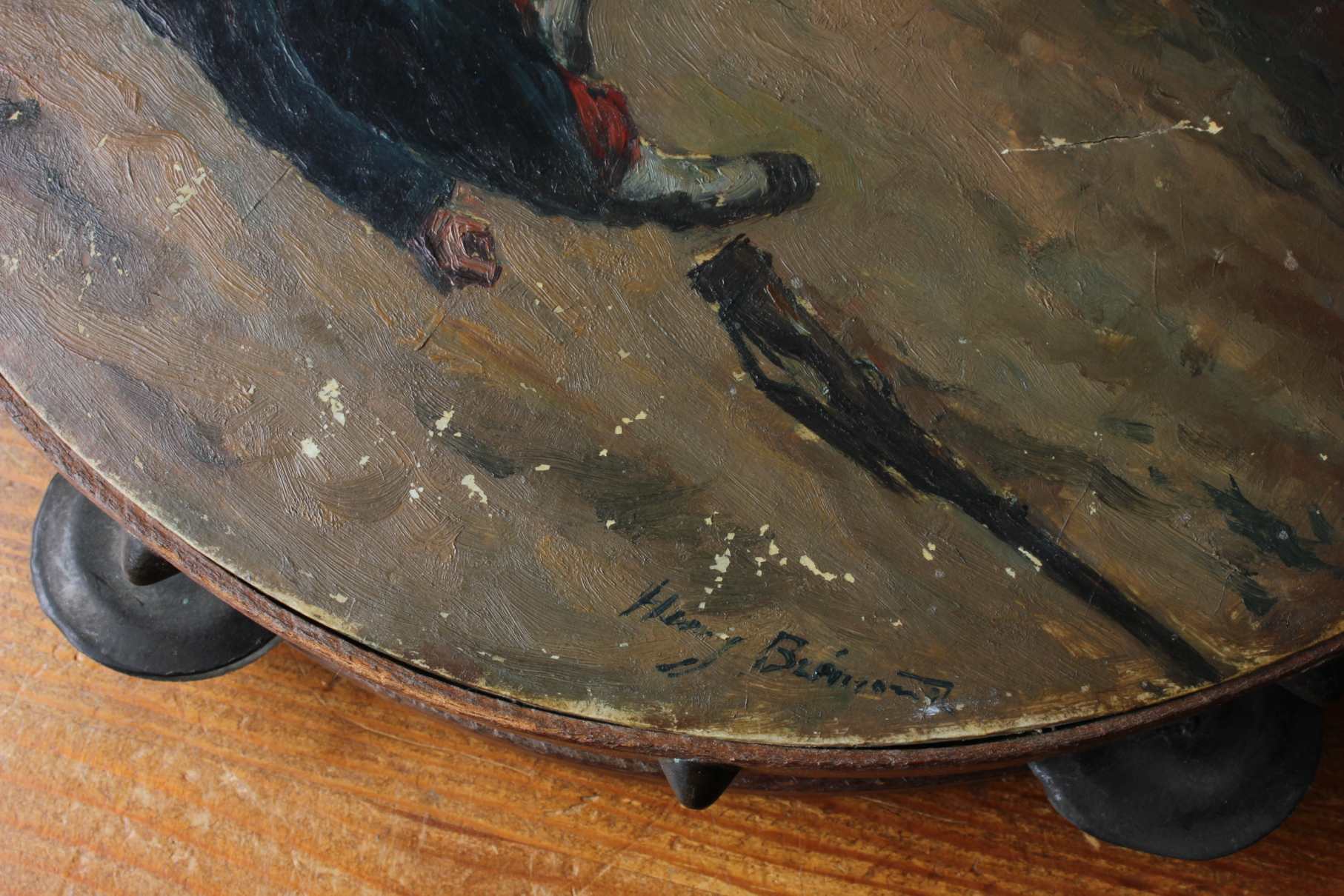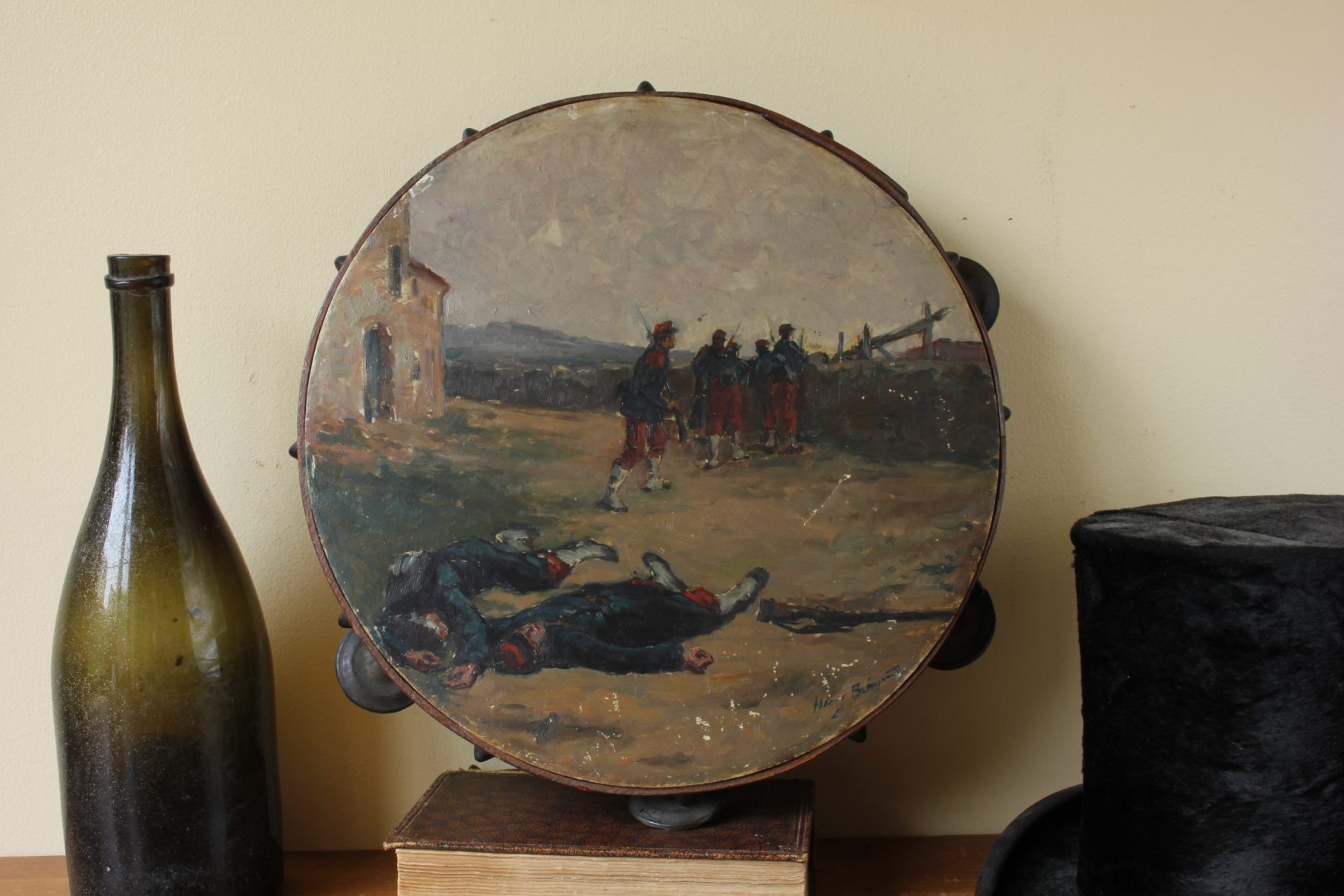 This antique French painted tambourine which dates from the late 19th century is handsomely painted by the artist with oil paints and features a French military scene with French soldiers in battle and is signed by the artist to the front.