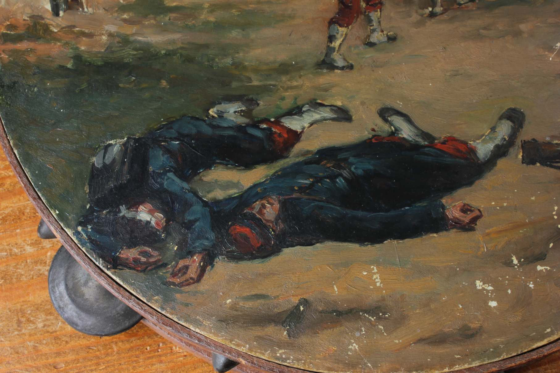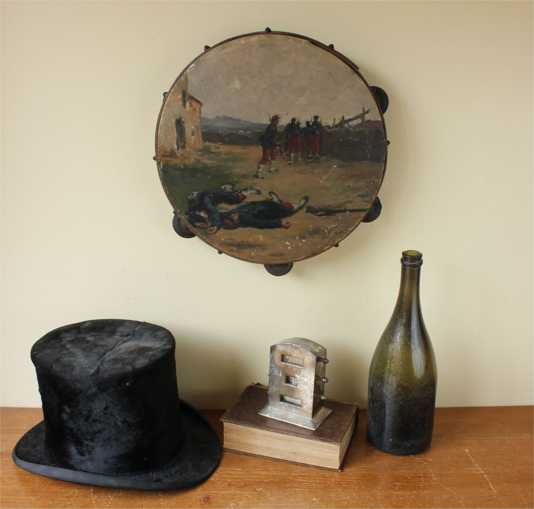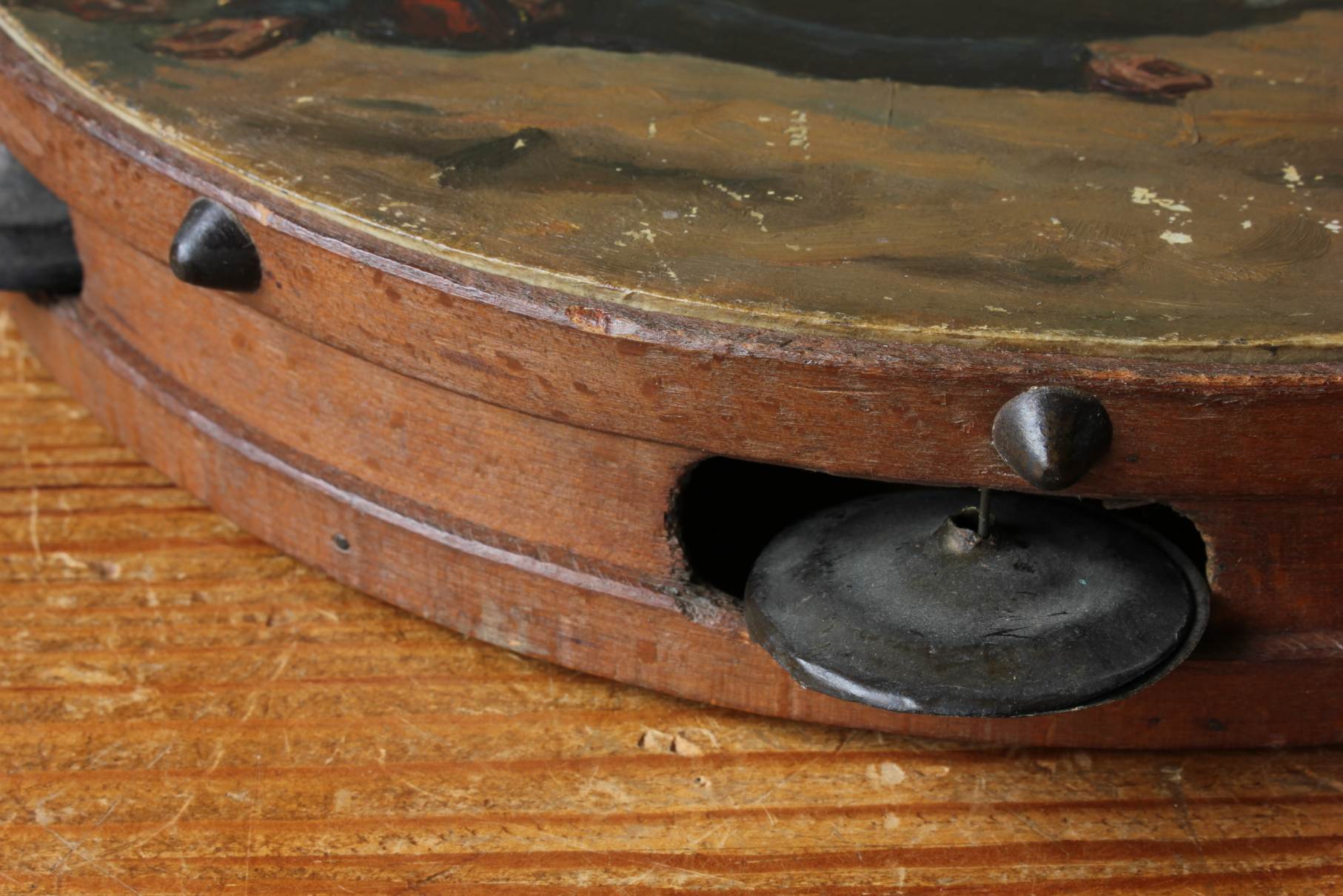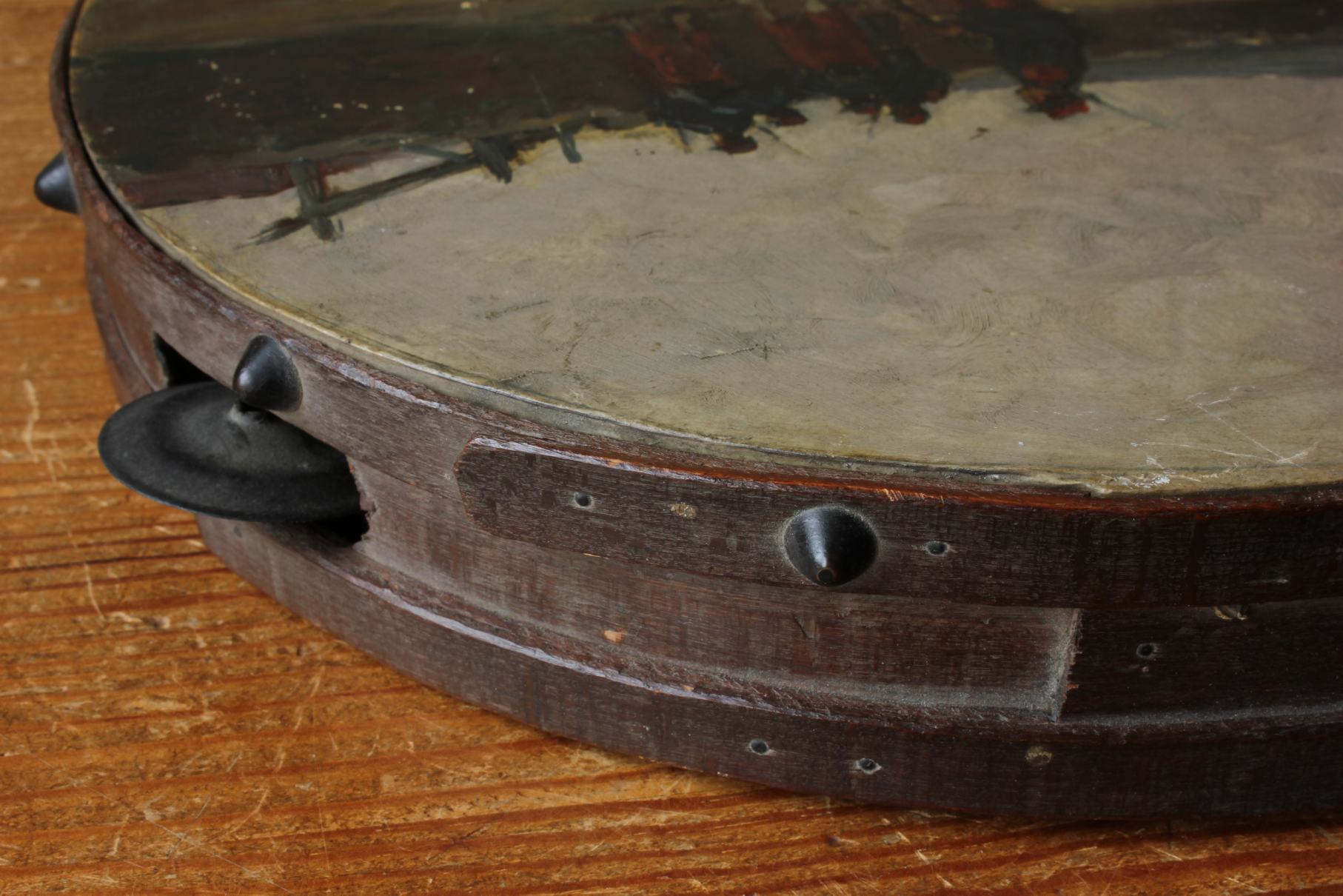This antique French painted tambourine which dates from the late 19th century is handsomely painted by the artist with oil paints and features a French military scene with French soldiers in battle and is signed by the artist to the front.